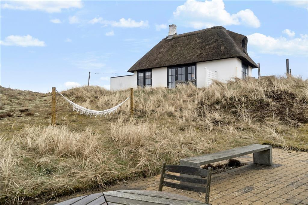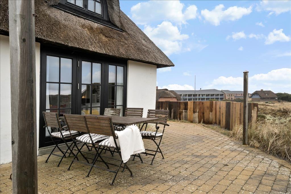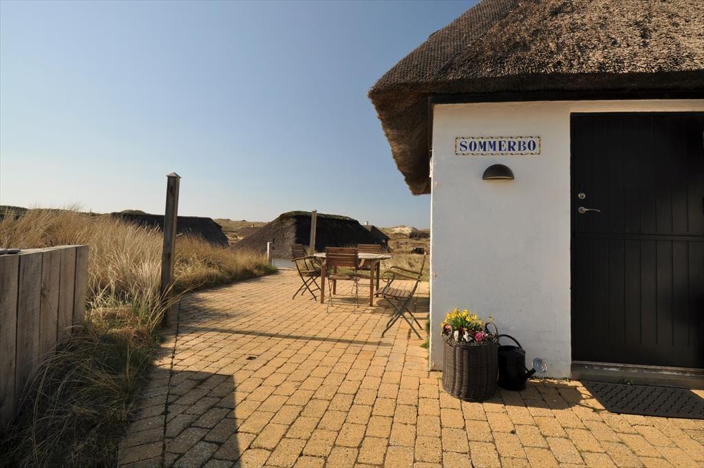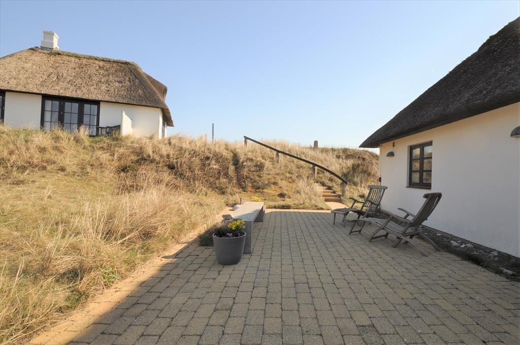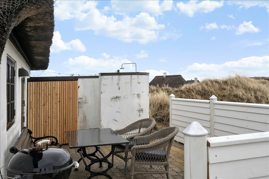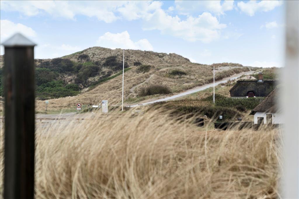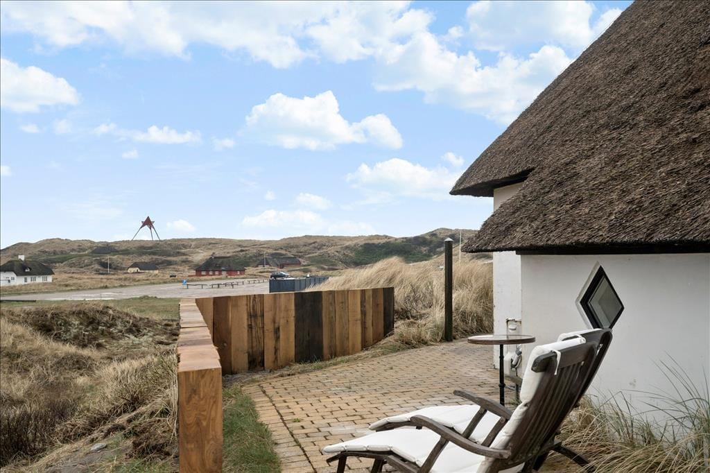 Huset ligger højt i det smukke landskab hvilket også giver jer den fantastiske udsigt udover klitlandskabet til alle sider. Sæt jer ud på en af de skønne terrasser der er flere stedet rundt om huset, på den måde kan I nyde solen hele dagen. Med udgang fra køkkenet er der terrasse med morgensol, så tag en varm kop kaffe med og nyd den sammen med fuglens sang der spreder sig i luften. Til aften kan I sætte jer om på den vestvendte terrasse, hvorfra der er udsigt til sømærket, her kan I nyde aftensolen til lyden af Vesterhavets skønne brusende lyd. Blæser det en smule en dag så sæt jer på den østvendte terrasse der ligger i en ”gryde” foran annekset.