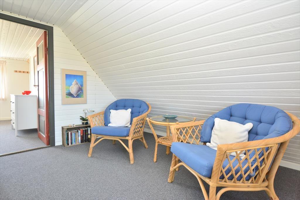 Feriehuset ligger på en stor grund hvor I har masser af muligheder for leg og boldspil for hele familien. Slå jer ned på den nordvest vendte terrasse og nyd solens stråler imens I nyder solens stråler og den blide brise der blidt kærtegner jeres hud. Fra grunden kan I også nyde den fantastiske udsigt ned til fjorden og alle dets fugletræk både forår og efterår. Om sommeren kan I nyde den store grunds mange hyggelige kroge, gå en tur rundt og nyd den lækre duft der kommer fra de nyudsprungne hybenroser, der spreder en lækker duft og som senere bliver til smukke rødorange bær.