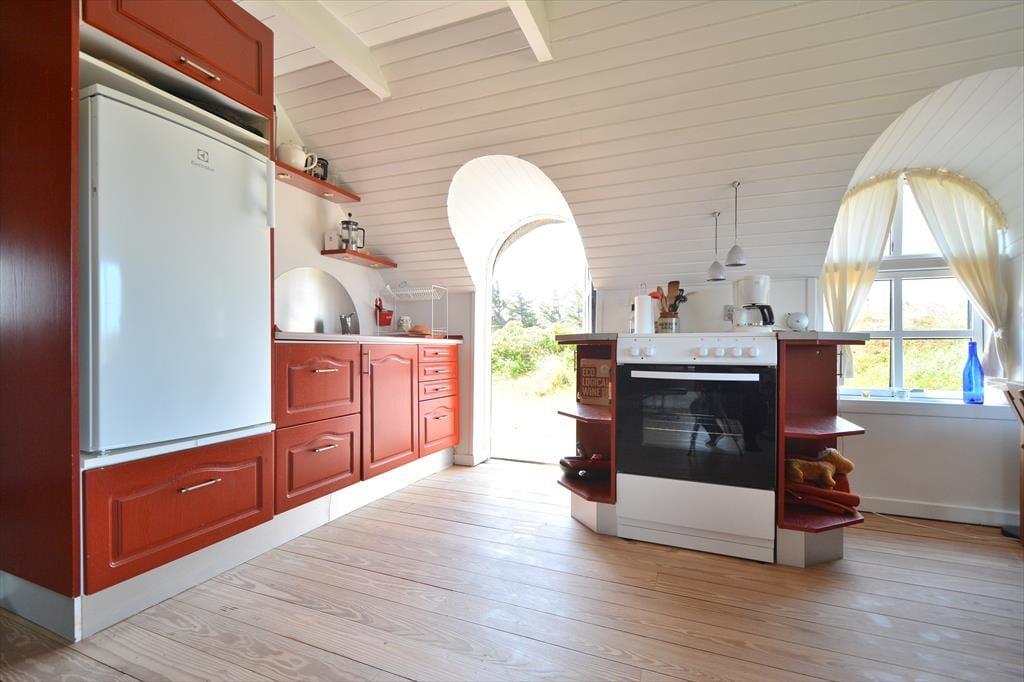 Røde detaljer pryder dette hyggelige feriehus, og skaber en rød tråd gennem hele huset og som nænsomt guider jer gennem husets forskellige rum. Køkkenet ligger i åben forbindelse med opholdsstue og spiseafdeling som gør det muligt for jer at nyde hinandens selskab på trods af at I laver forskellige ting. Hvis I en dag trænger til en hyggelig dag i sommerhuset så tænd op for brændeovnen og nyd dens varme stråler og hyggelige knitrende lyd der spreder sig i rummet og giver en dejlig hyggelig stemning.