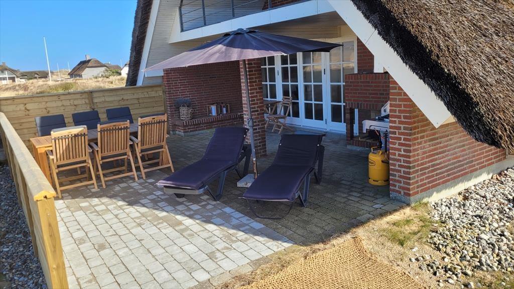 Udenfor venter en naturskøn oase omgivet af klitter og den friske vestjyske luft. Den indbydende terrasse er indhegnet med et 1 meter højt hundehegn, så op til tre hunde kan lege trygt og frit. Her kan både to- og firbenede gæster nyde ferien i sikre og rolige omgivelser.