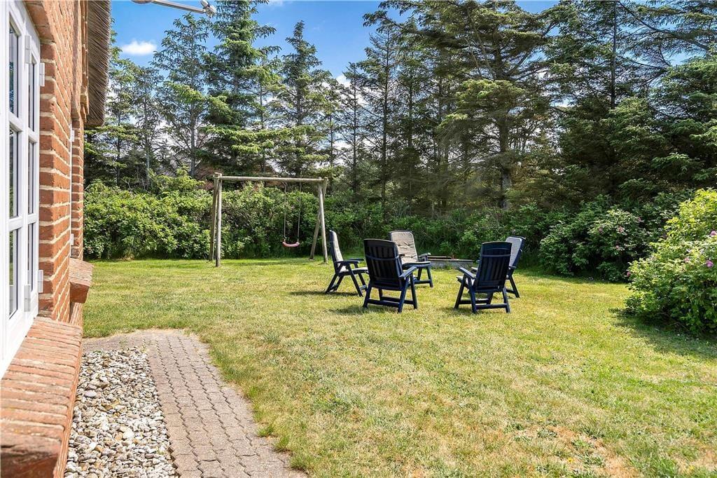 Feriehuset ligger på en stor og meget velplejet grund hvor der er rigtigt gode læ forhold, hvilket også er med til at give jer privatliv. Den store grund er perfekt til både boldspil og leg, så nyd de mange solskinstimer udendørs på den store grund inden I sætter jer på den store sydvestvendte flisebelagte terrasse og får et velfortjent hvil imens ungerne leger på den opsatte gynge og sandkasse der kalder på mange hyggelige timer. Har I lyst til en lækker bøf på grillen så er I heldige at der hører en grill til dette skønne feriehus.