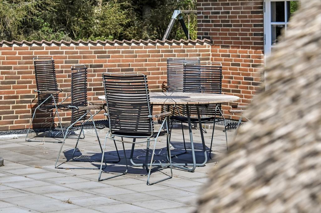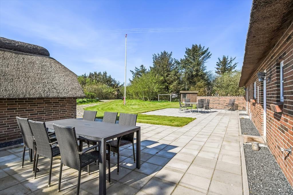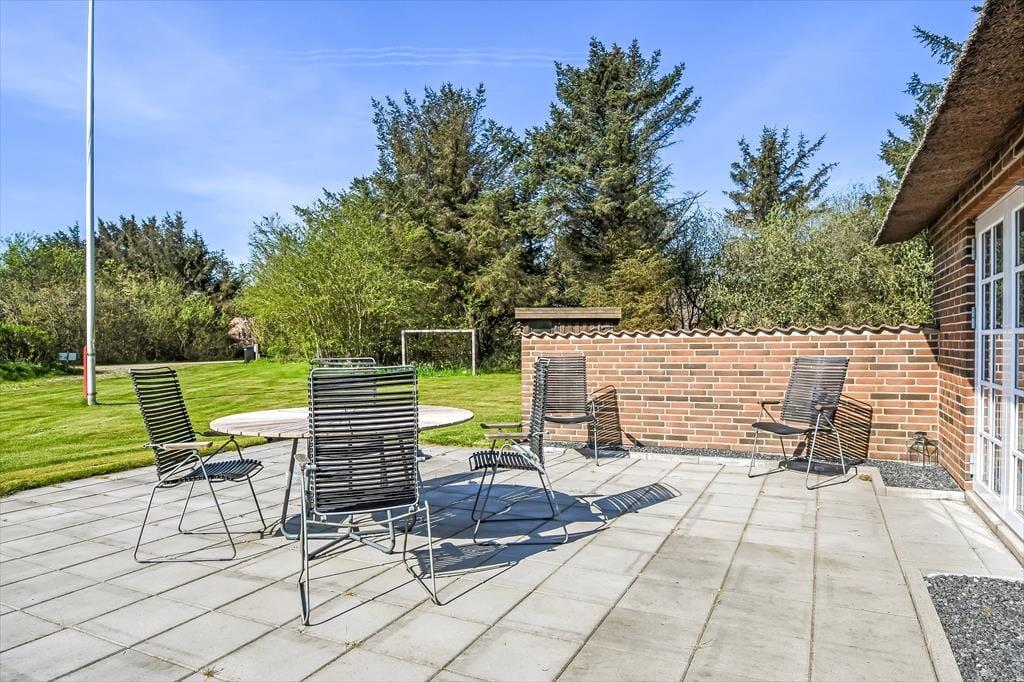 Feriehuset ligger på en stor naturgrund med masser af plads til leg og afslapning. Børnene kan more sig på gyngestativet, mens de voksne slapper af på terrassen – det ideelle sted at nyde en kølig forfriskning og den smukke udsigt over grunden.