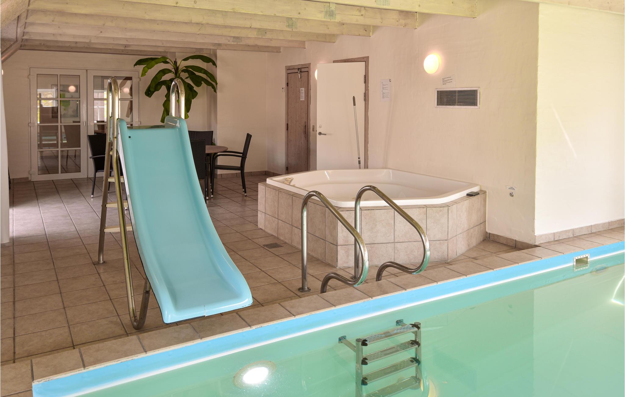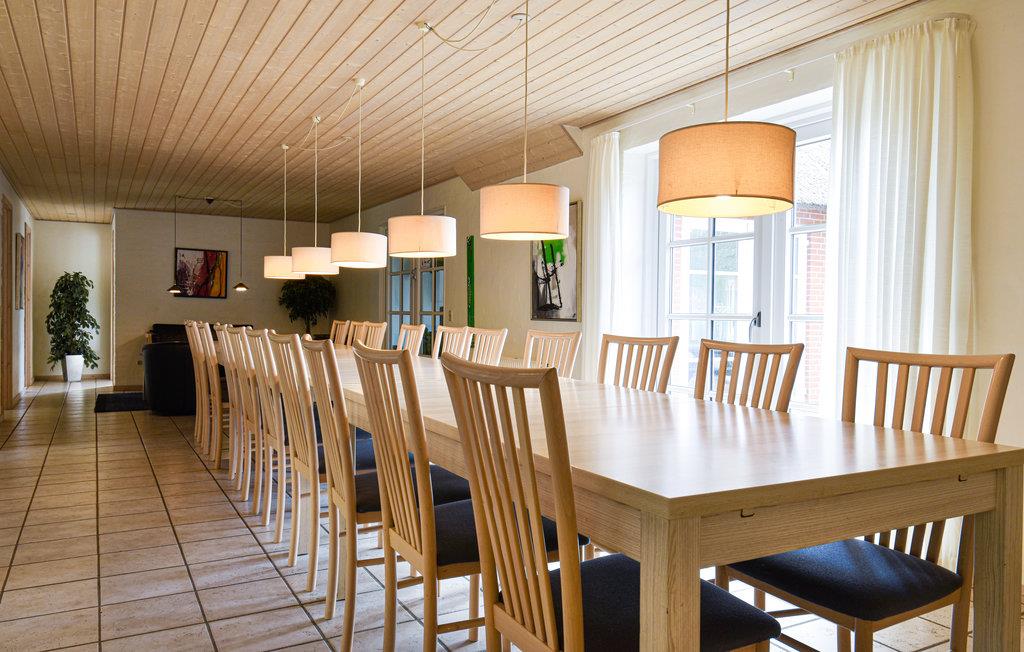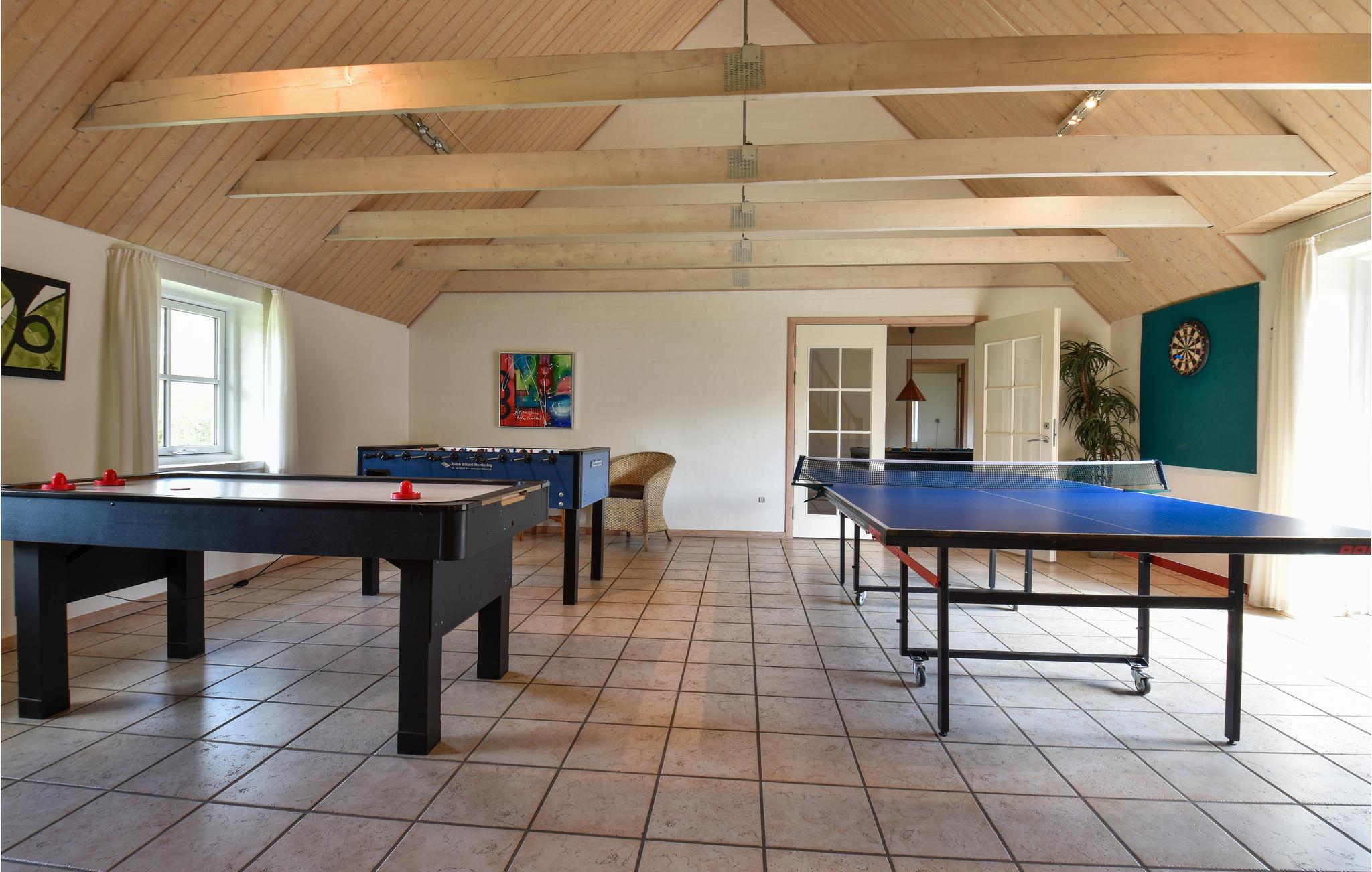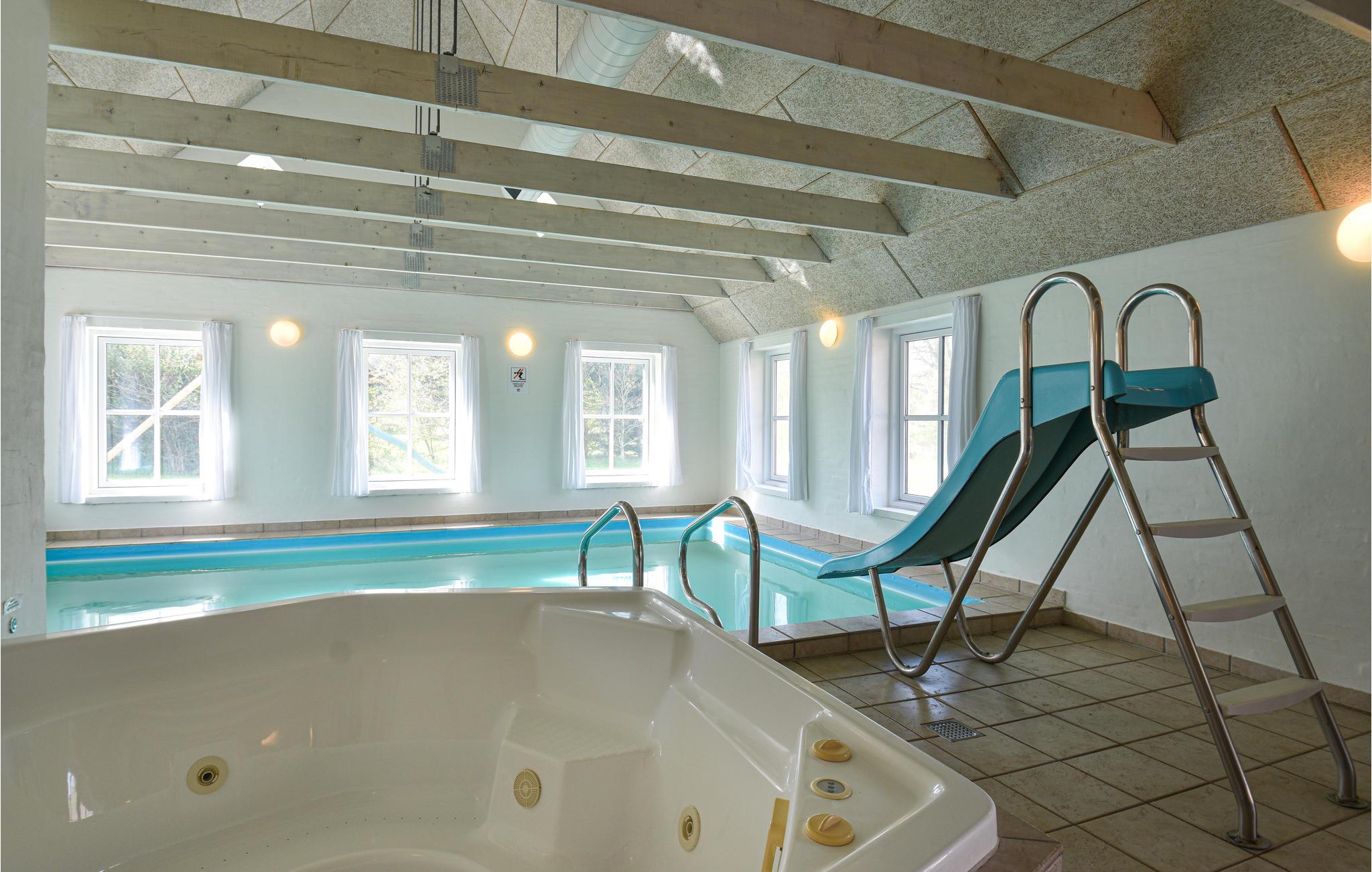 Nær Vestkysten og de brede klitrækker ligger dette stråtækte luksusferiehus. Vester Husby ligger lige op til Husby Klitplantage. Her venter jer en speciel naturoplevelse, følg bare de afmærkede ruter. I området findes utallige butikker, cykeludlejning, restauranter, gallerier og butikker med brugskunst. Derudover kan I fiske åen, havet og fjorden. Dette velindrettede og indbydende feriehus med stråtag, rummer ganske enkelt alt hvad hjertet kan begære af aktivitets- og udfoldelsesmuligheder. Bl.a. den flotte poolafdeling med swimmingpool med modstrømsanlæg, vandrutsjebane, dejlig stort indbygget spabad og sauna. På den anden side af det centralt placerede spise/opholdsrum, kommer I ind i det store herreværelse, hvor I kan mikse jer en drink ved den indbyggede bar med eget køleskab, spille dart eller pool på det flotte poolbord. Det komfortable sofahjørne inviterer til en hyggestund. Går I videre til aktivitetsrummet, kan I få rørt alle muskler, når vinderen skal findes ved bordtennisbordet, i airhockey og bordfodbold. Skal lattermusklerne røres kan det nemt ske i café-hjørnet. Gratis internetadgang og Playstation2 er en selvfølge. Huset er yderst veldimensioneret og giver god plads til 24 personer, med hele tre soveafdelinger med 10 soverum i alt og et badeværelse i hver afdeling. Desuden er der god plads på den store hems til endnu fire overnattende gæster. På den 5200 m² store grund, der omkranser huset, kan de mindste gæster more sig med gynger og sandkasse, for de større er der boldbane, volleyballnet og badminton. I kan også vælge at slappe 100 % af i den dejlige solgård, med komfortable havemøbler.