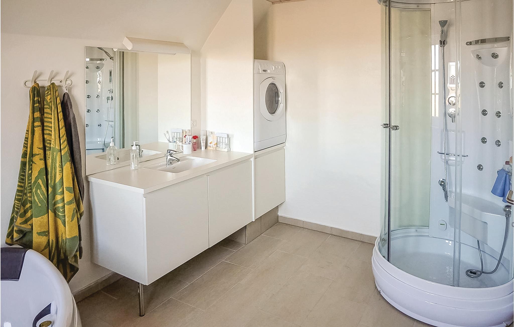 I den ene ende af huset er der to gode soveværelser samt et dejligt stort badeværelse med spabad, dampkabine og infrarød sauna (bliver 60 grader varm). Den anden ende af huset indeholder yderligere to gode soveværelser samt et godt badeværelse med brus. Hvis I en dag ikke har lyst til at stå for madlavningen selv, ligger der både restaurant, købmand, udendørs badeland, minigolf m.m. blot 5 minutters gang fra huset.