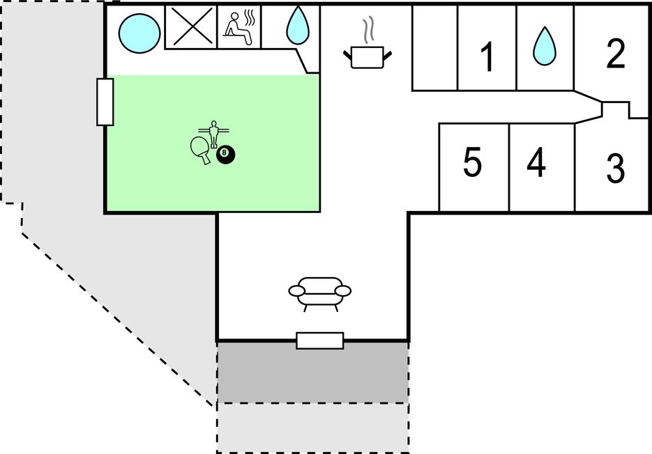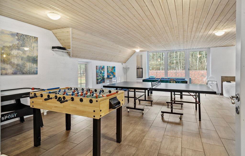 I det skønne ferieområde ved Vester Husby ligger dette aktivitets sommerhus med plads til hele familien. Huset passer perfekt ind i omgivelserne med sit karakteristiske stråtag. Sommerhuset byder på fem soveværelser med i alt plads til 13 personer. Der er to badeværelser med bruser samt et aktivitetsrum med både billiard, airhockey, bordfodbold, bordtennis og spabad, så her kan I tilbringe mange timer på aktiv sjov og leg, og efterfølgende har I måske lyst til en tur i saunaen. Det lyse køkken ligger i åben forbindelse med spisestuen og stuen med brændeovn. På de skønne terrasser og i haven er der dagen igennem altid mulighed for både sol og skygge.
