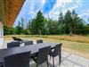 Gennem terrassedøren kommer I ud på den åbne terrasse mod syd. Her er rig mulighed for at slappe af i solen og nyde jeres mad direkte fra grillen, mens fuglene kvidrer i baggrunden. Måske I endda kan høre den lille å, der slynger sig bagved huset, risle i baggrunden.