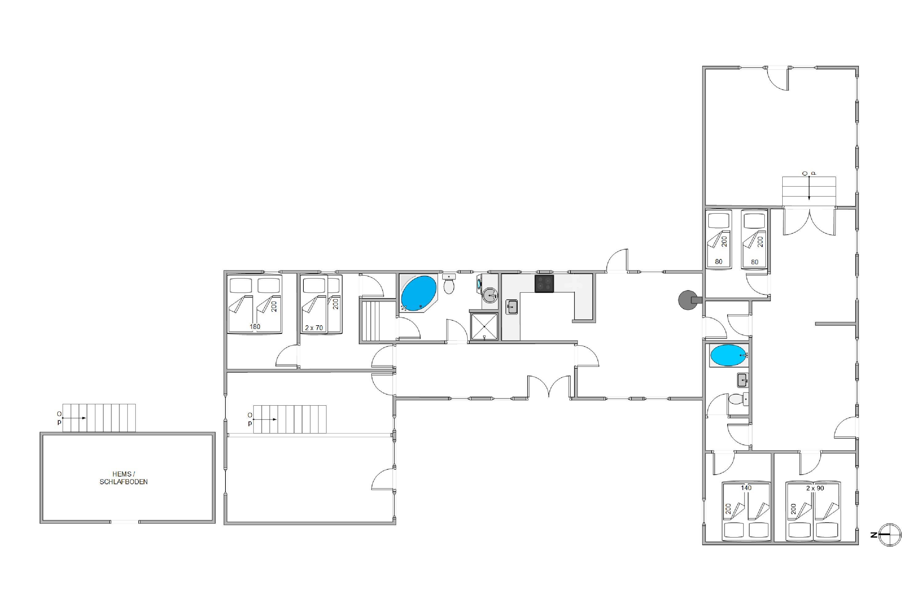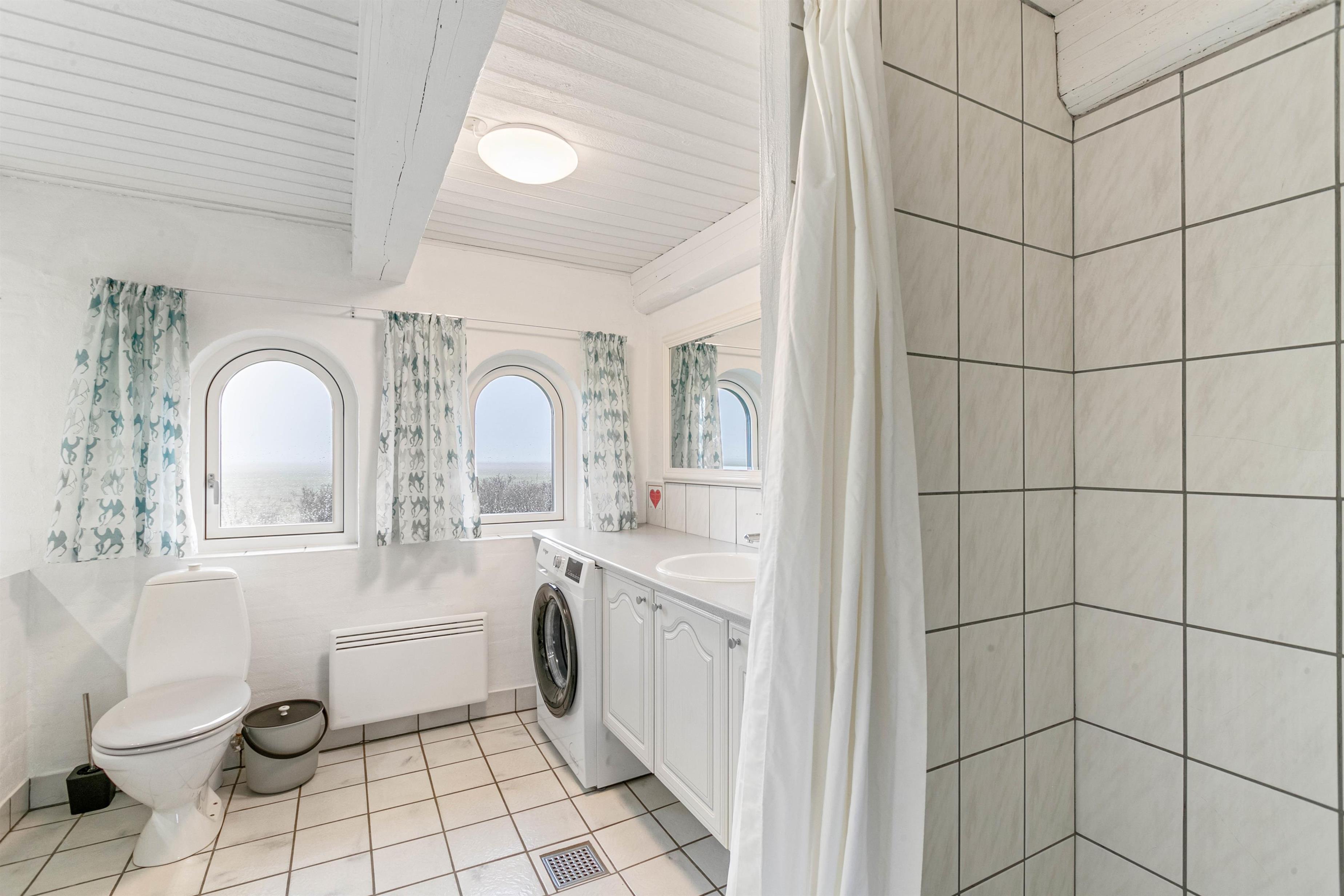 Sommerhuset er indrettet med 5 soverum og en ekstra hems med dobbeltseng. Der er 2 badeværelser; det ene er med et ”rigtigt” badekar, og det andet er et større badeværelse, med spa og sauna som indbyder til afslappende wellness efter en lang dag i den vestjyske natur.