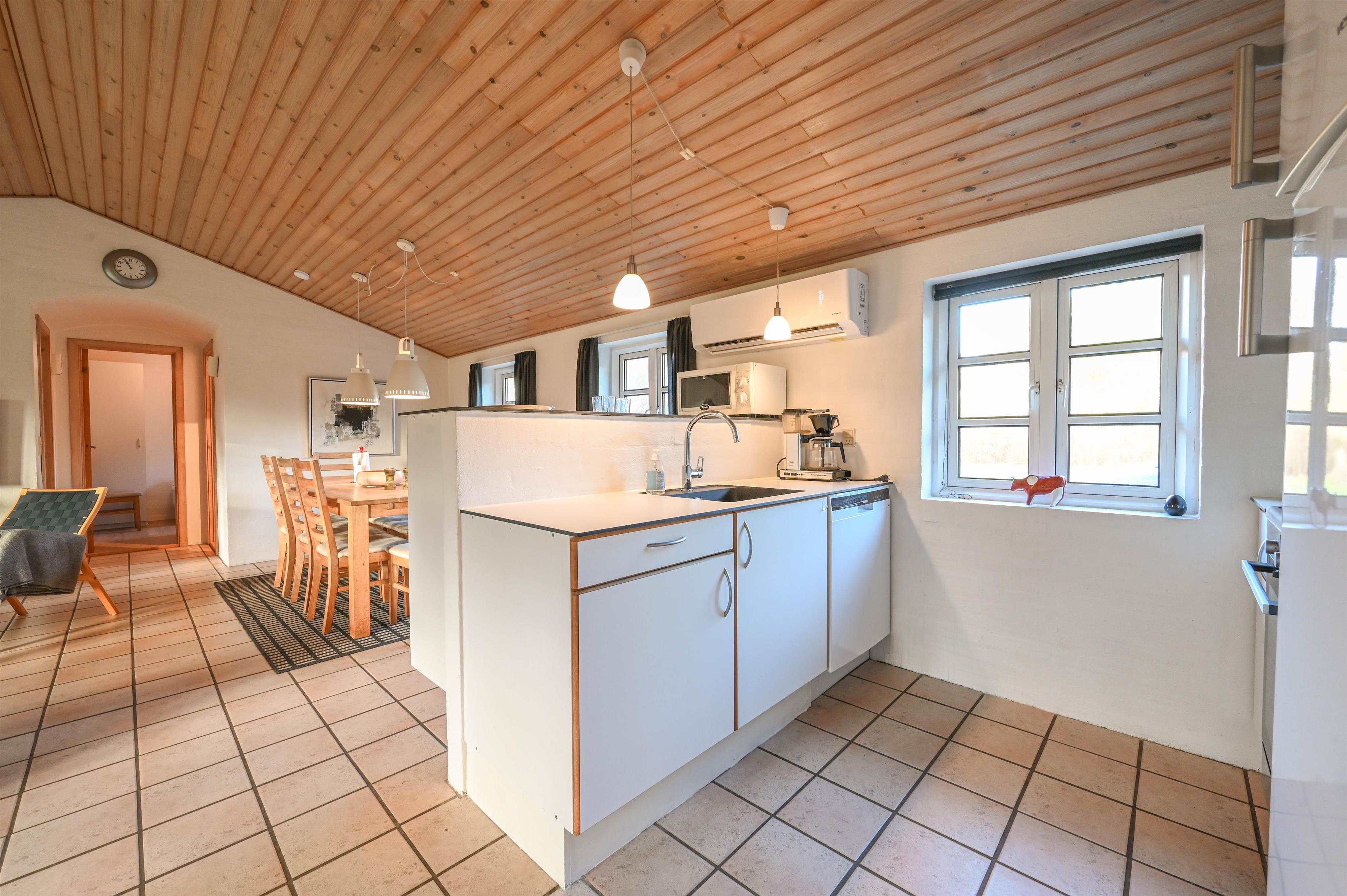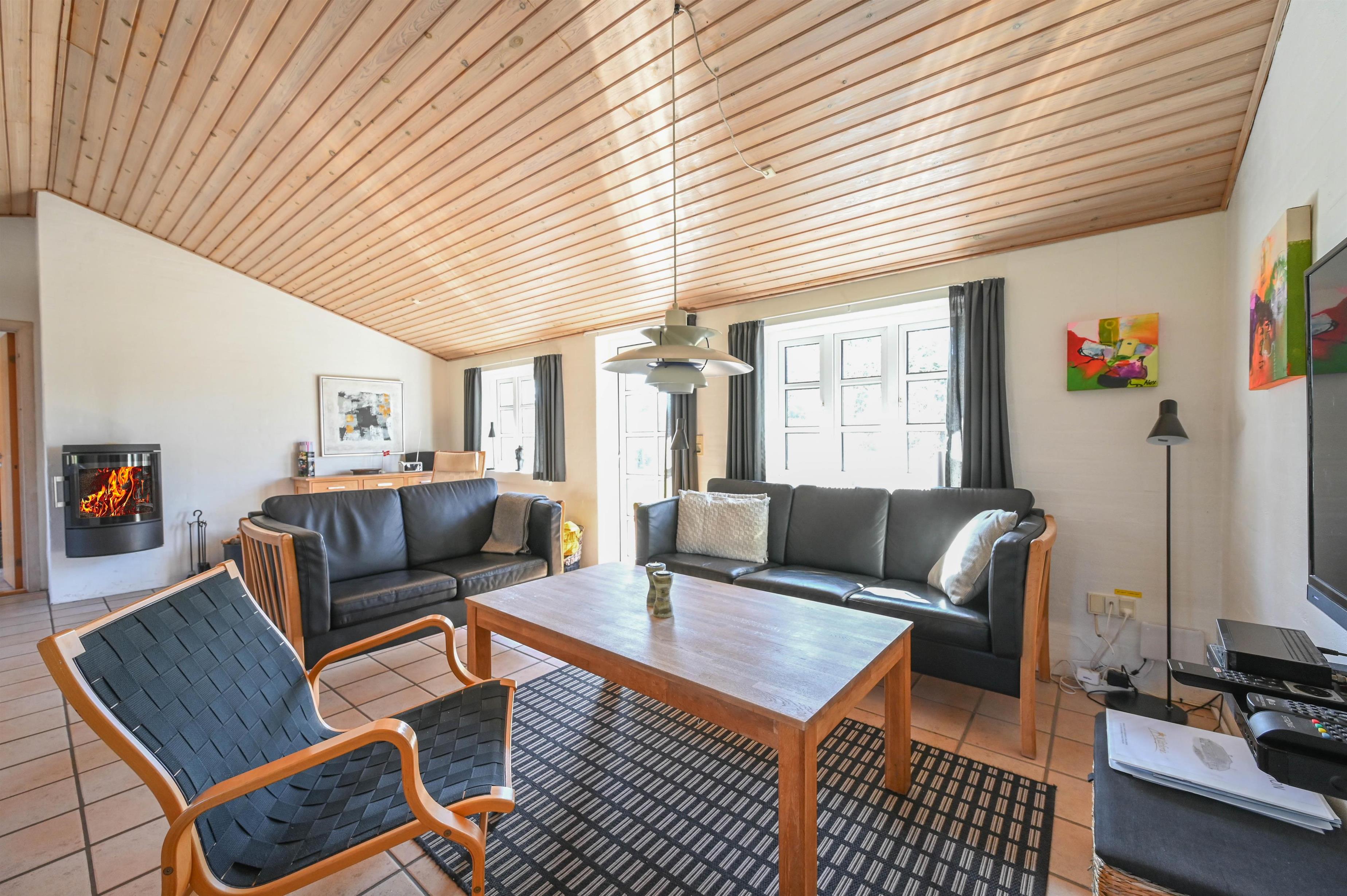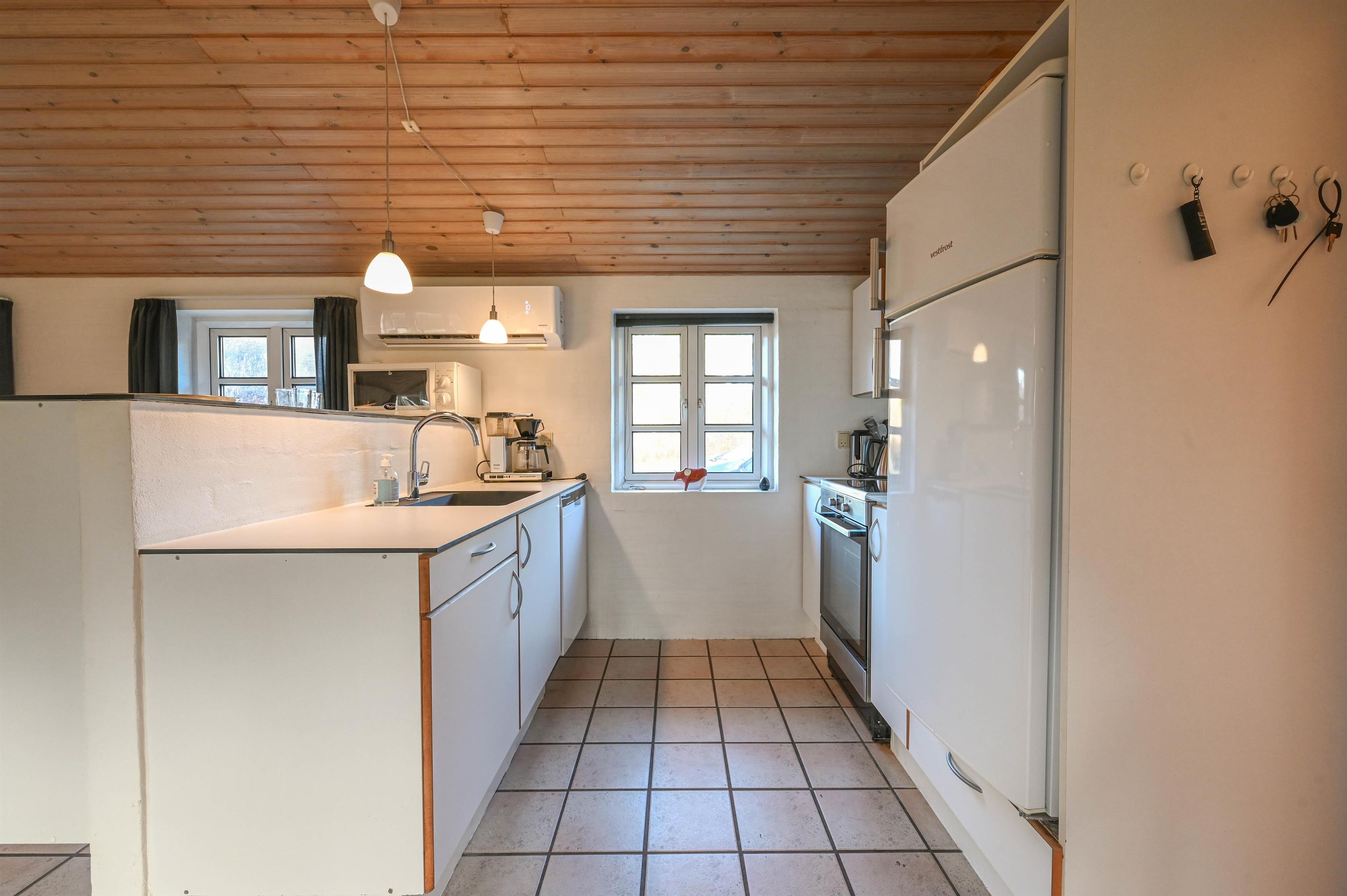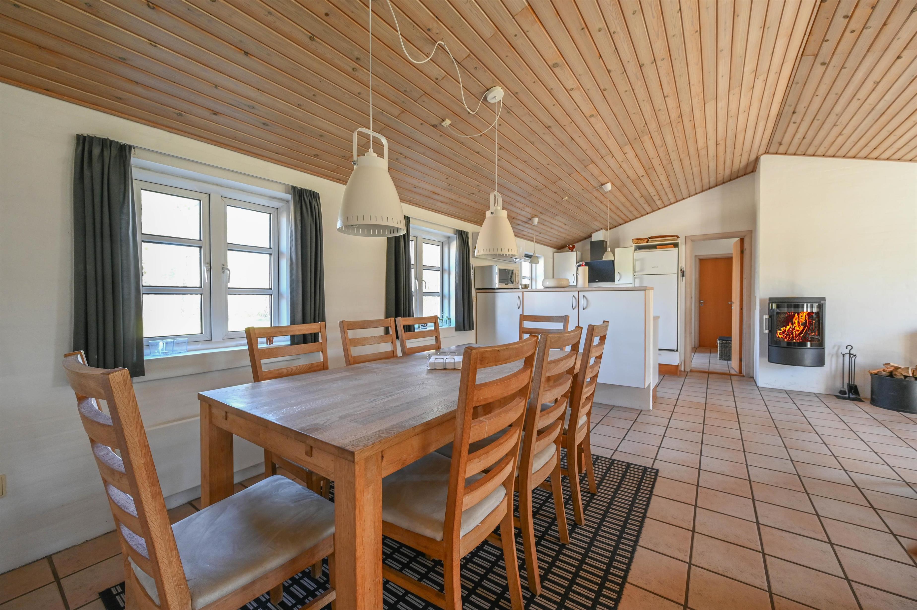 Det lyse og funktionelle køkken er åbent mod den hyggelige opholdsstue, hvor brændeovnen og klinkegulvet skaber en varm og behagelig atmosfære. Herfra er der god plads til samvær – uanset om du laver mad, nyder en rolig stund eller ser fjernsyn efter en lang dag ved stranden.