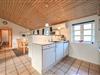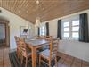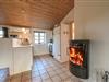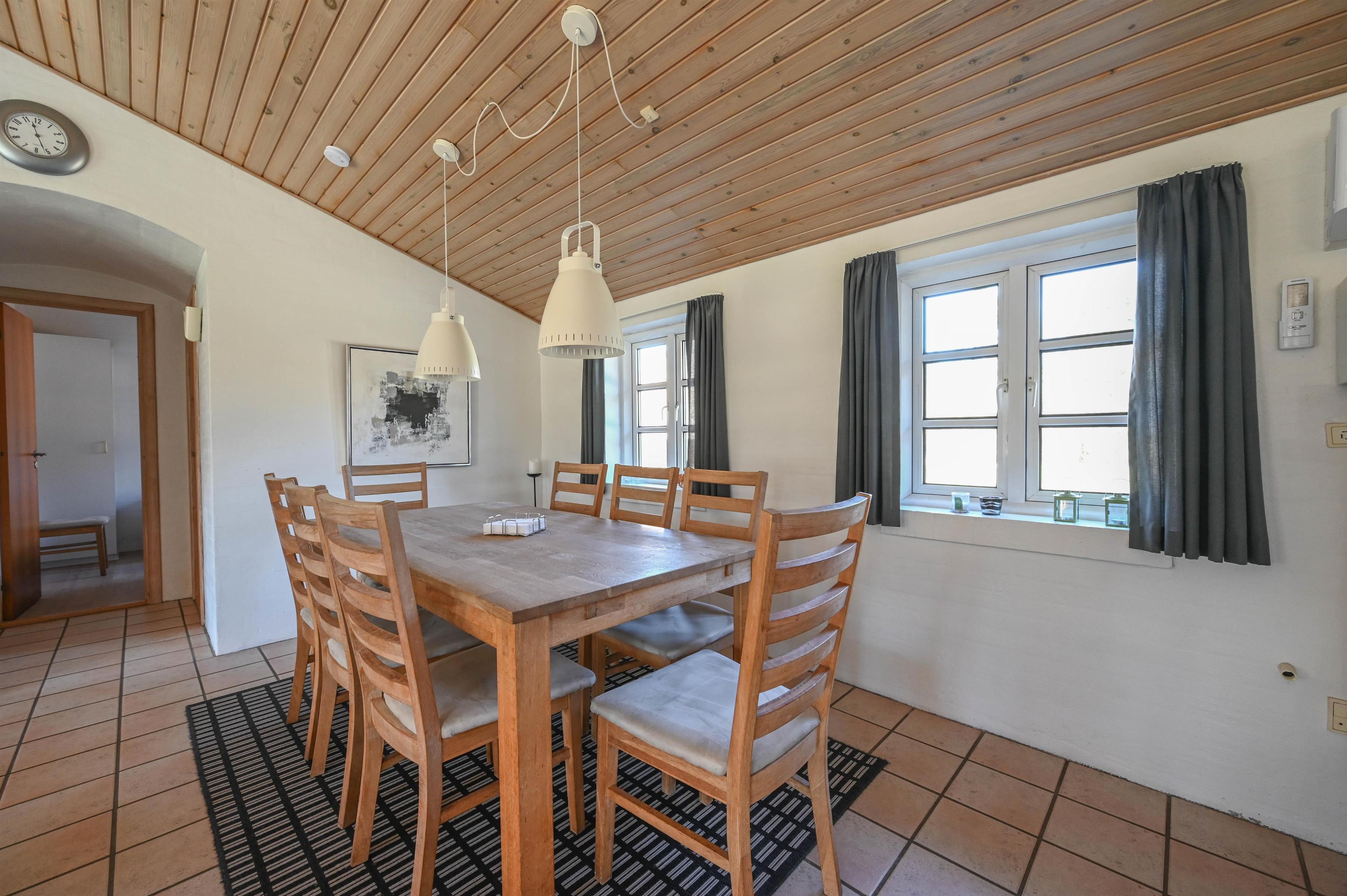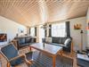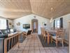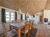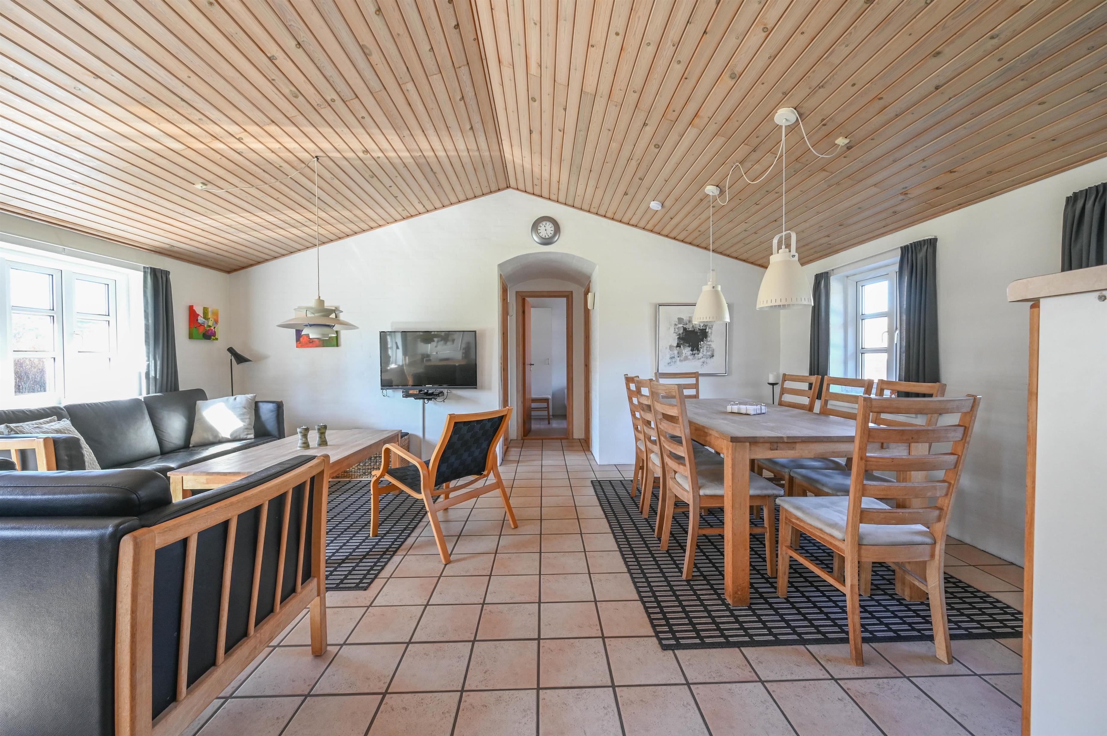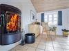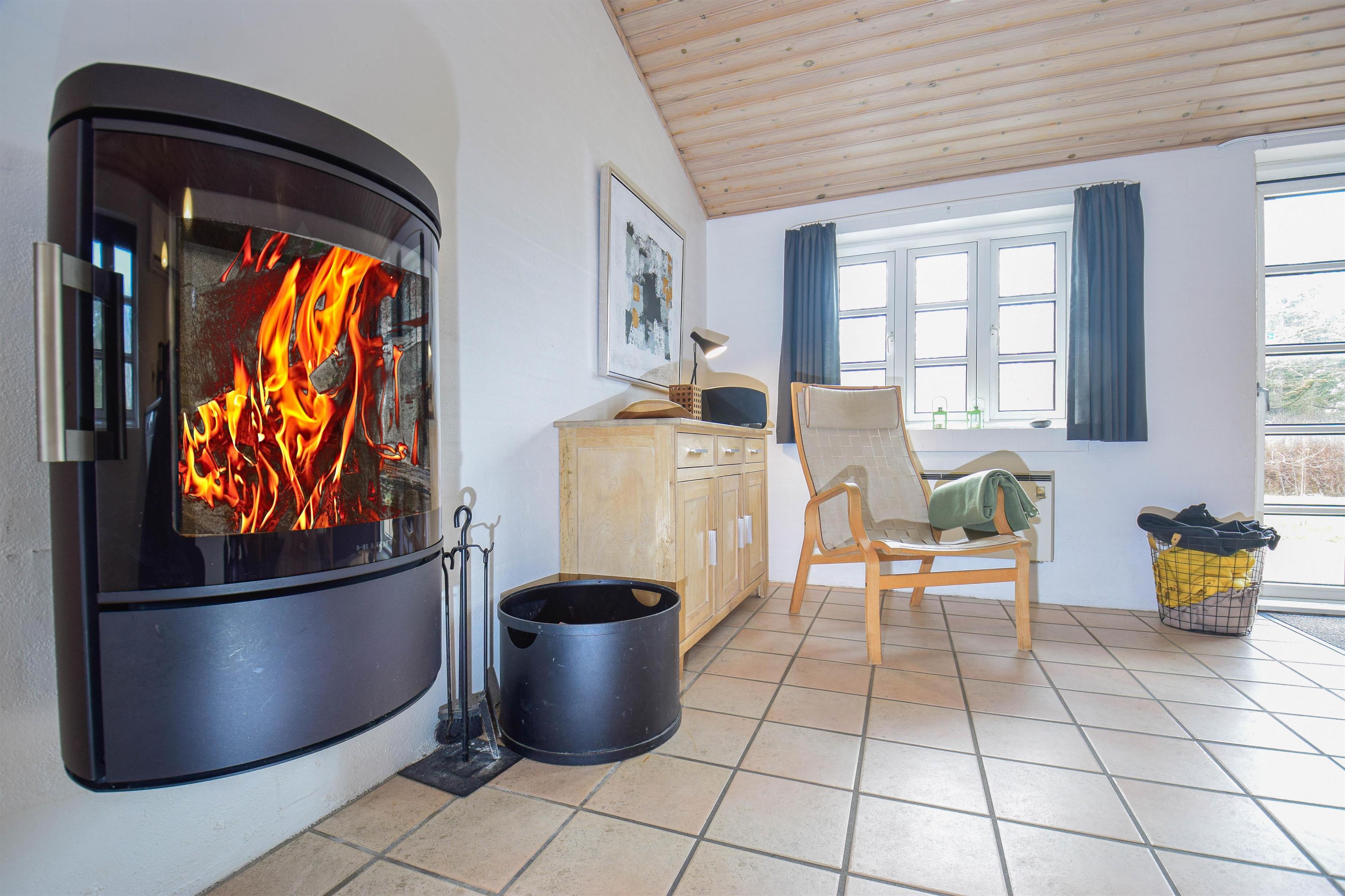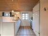 Det lyse og funktionelle køkken er åbent mod den hyggelige opholdsstue, hvor brændeovnen og klinkegulvet skaber en varm og behagelig atmosfære. Herfra er der god plads til samvær – uanset om du laver mad, nyder en rolig stund eller ser fjernsyn efter en lang dag ved stranden.