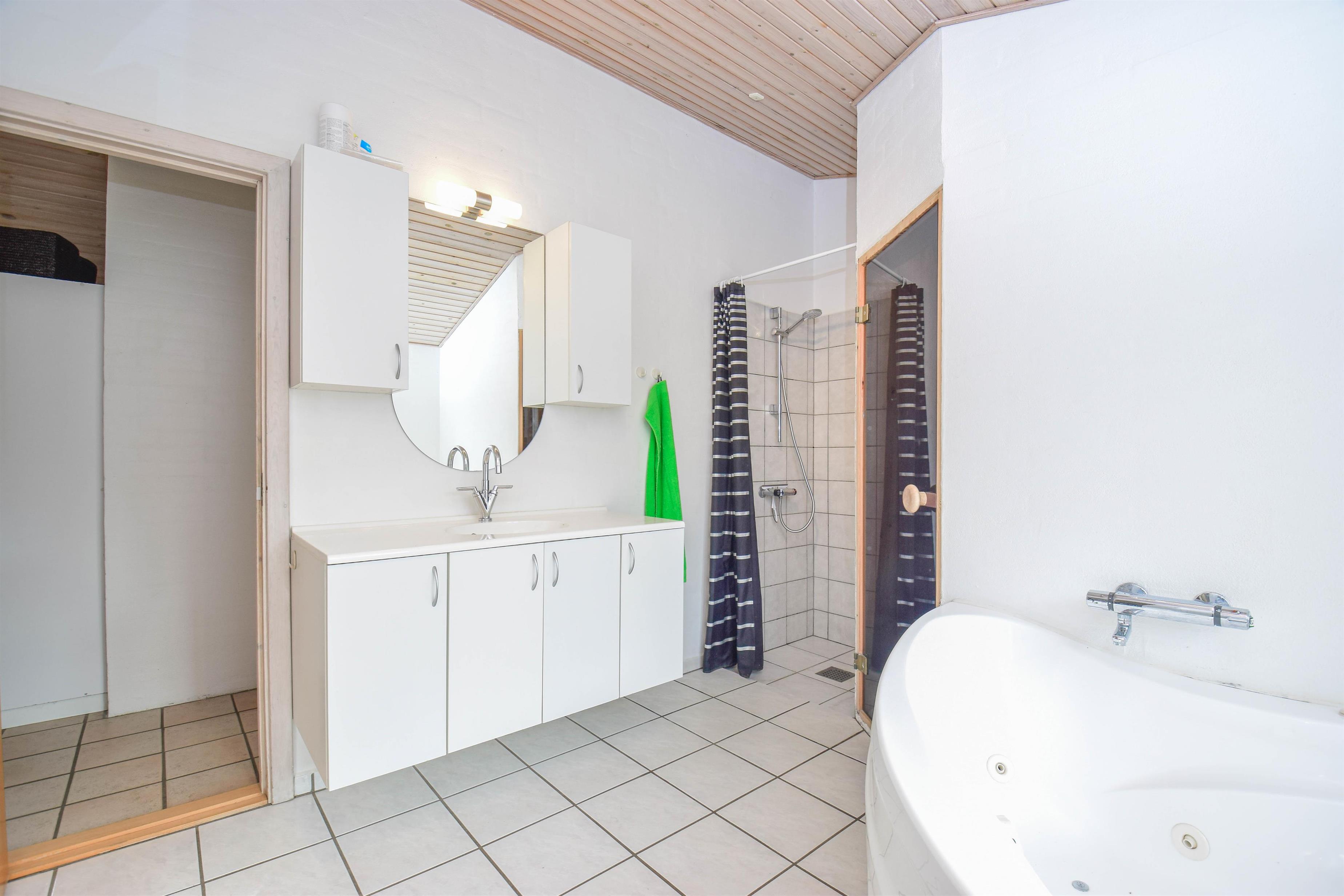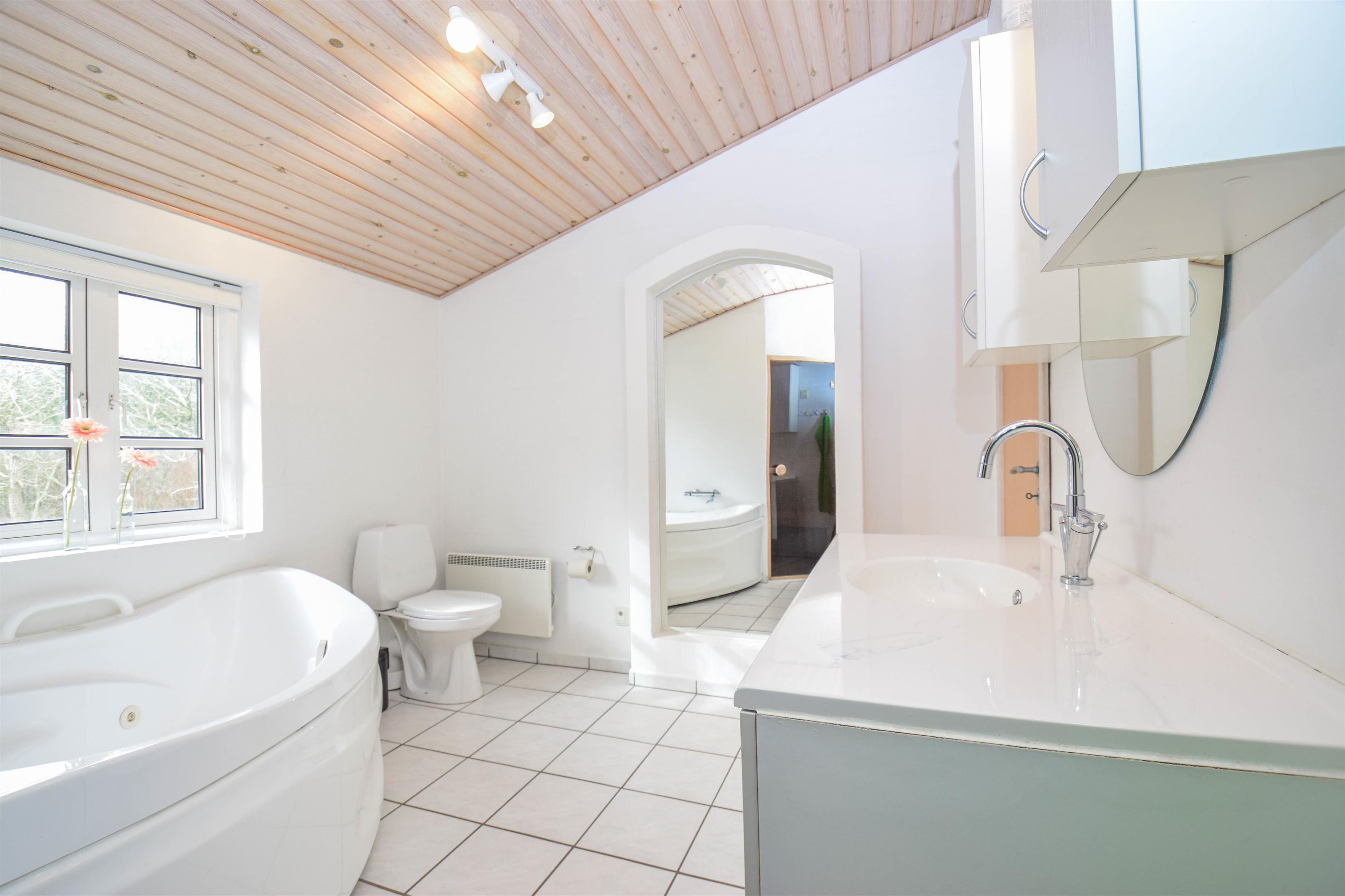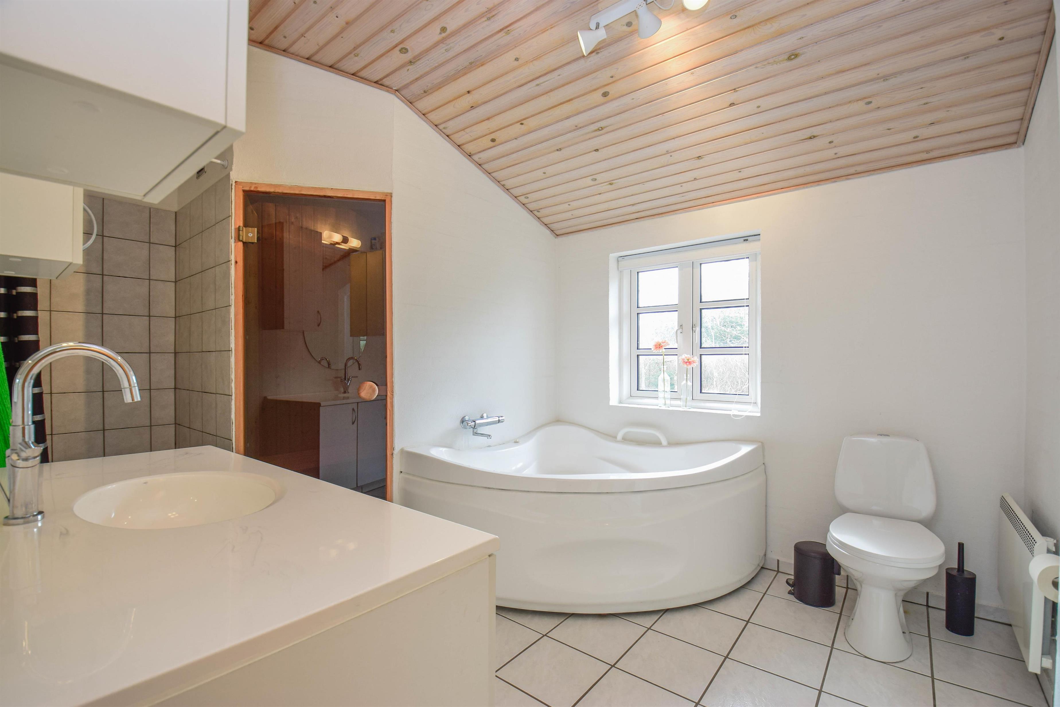 Huset har et dejligt badeværelse med spa og bruser samt direkte adgang til sauna, perfekt til afslapning på kølige dage. Derudover findes et gæstebadeværelse med bruser. Begge badeværelser har gulvvarme, så komforten er i top.
