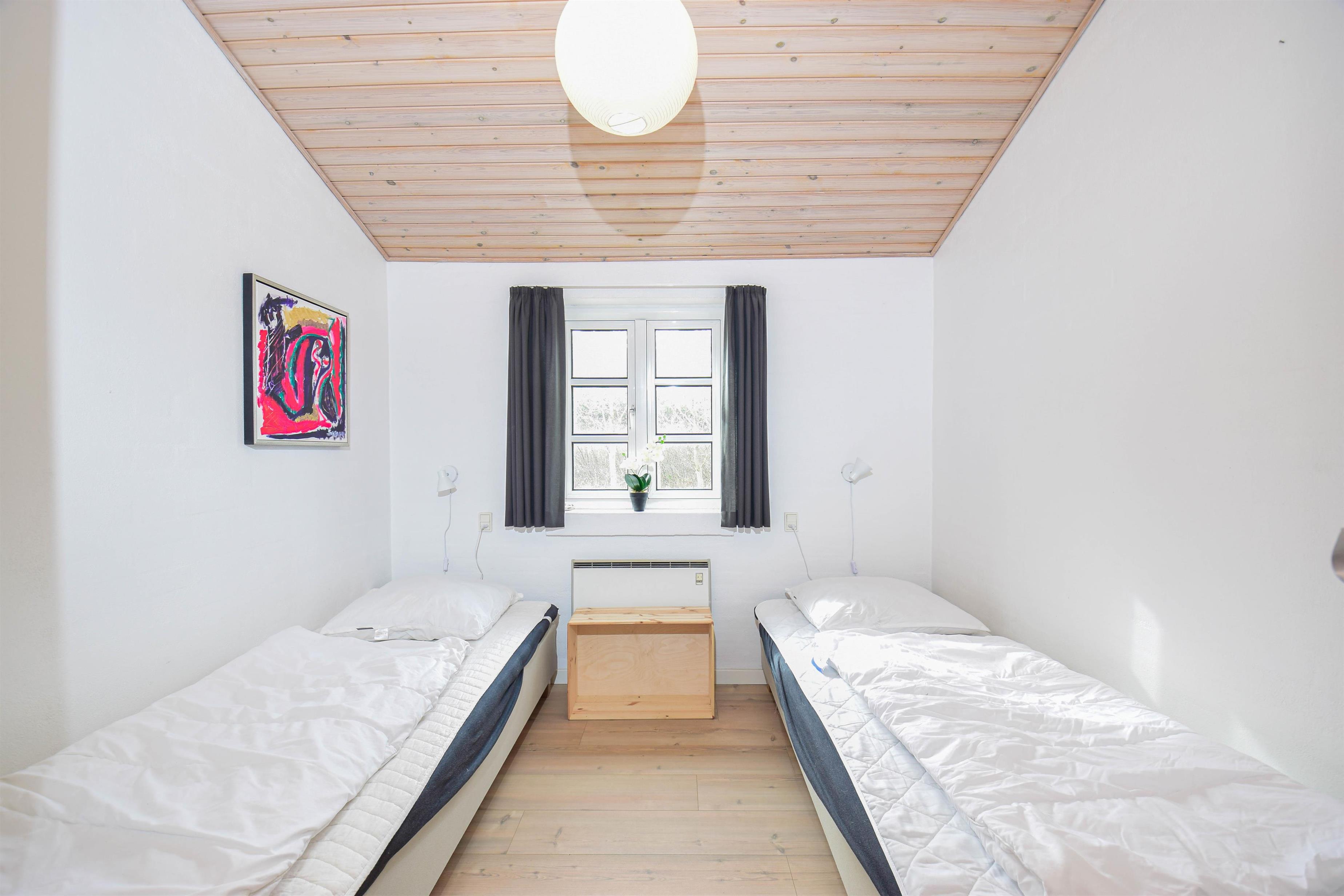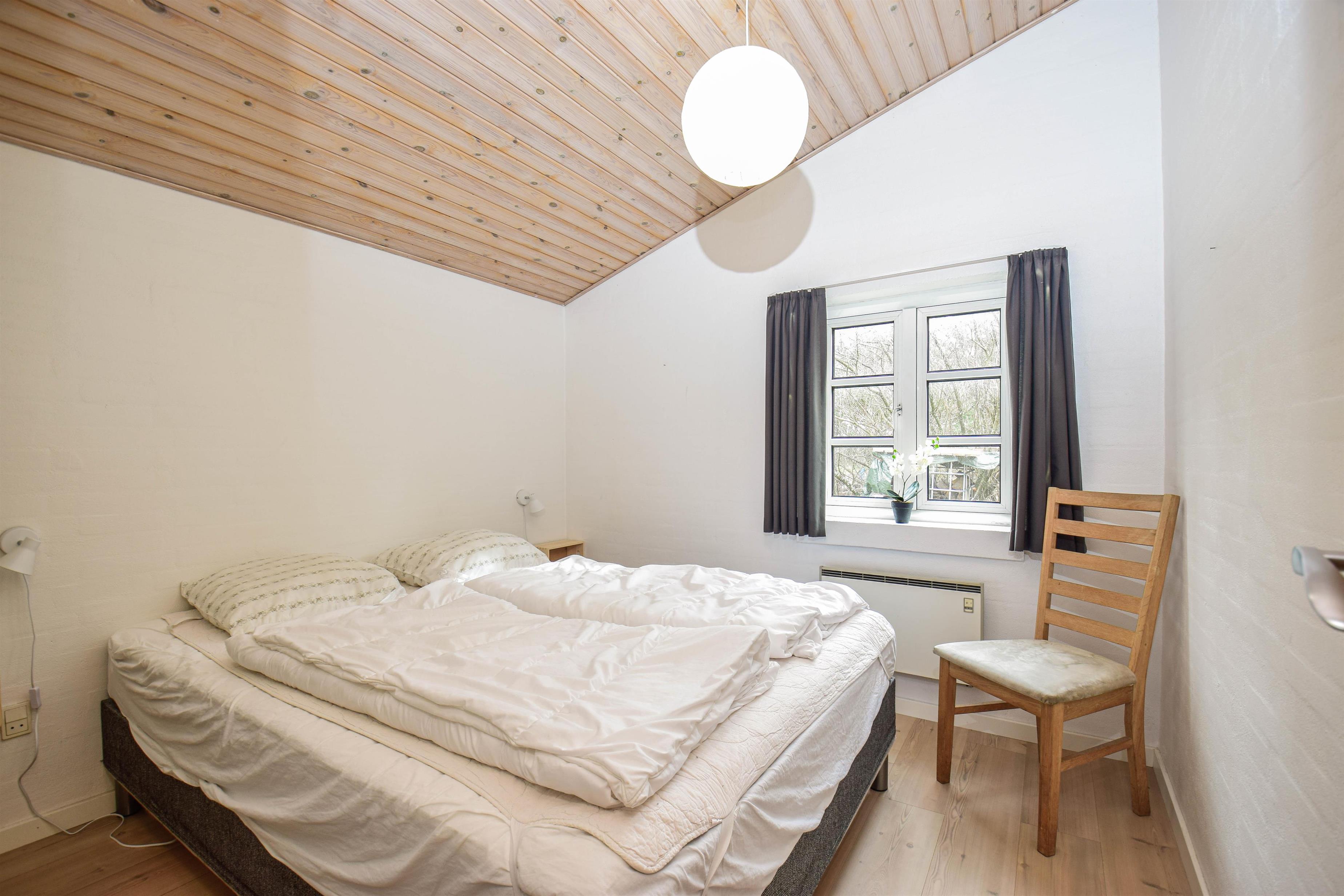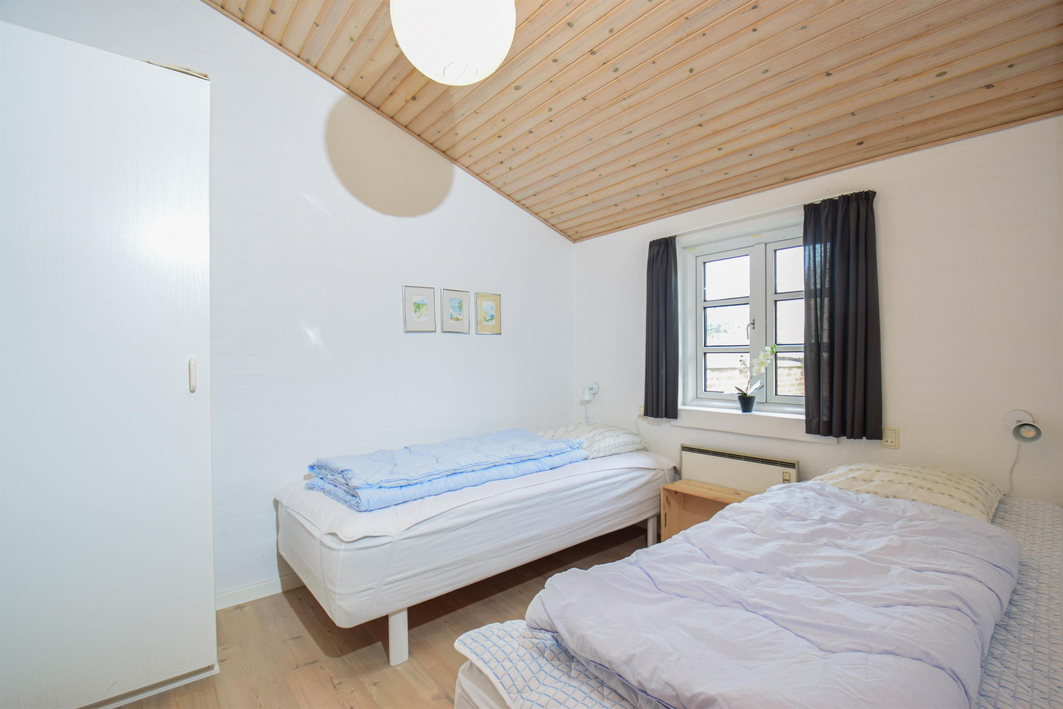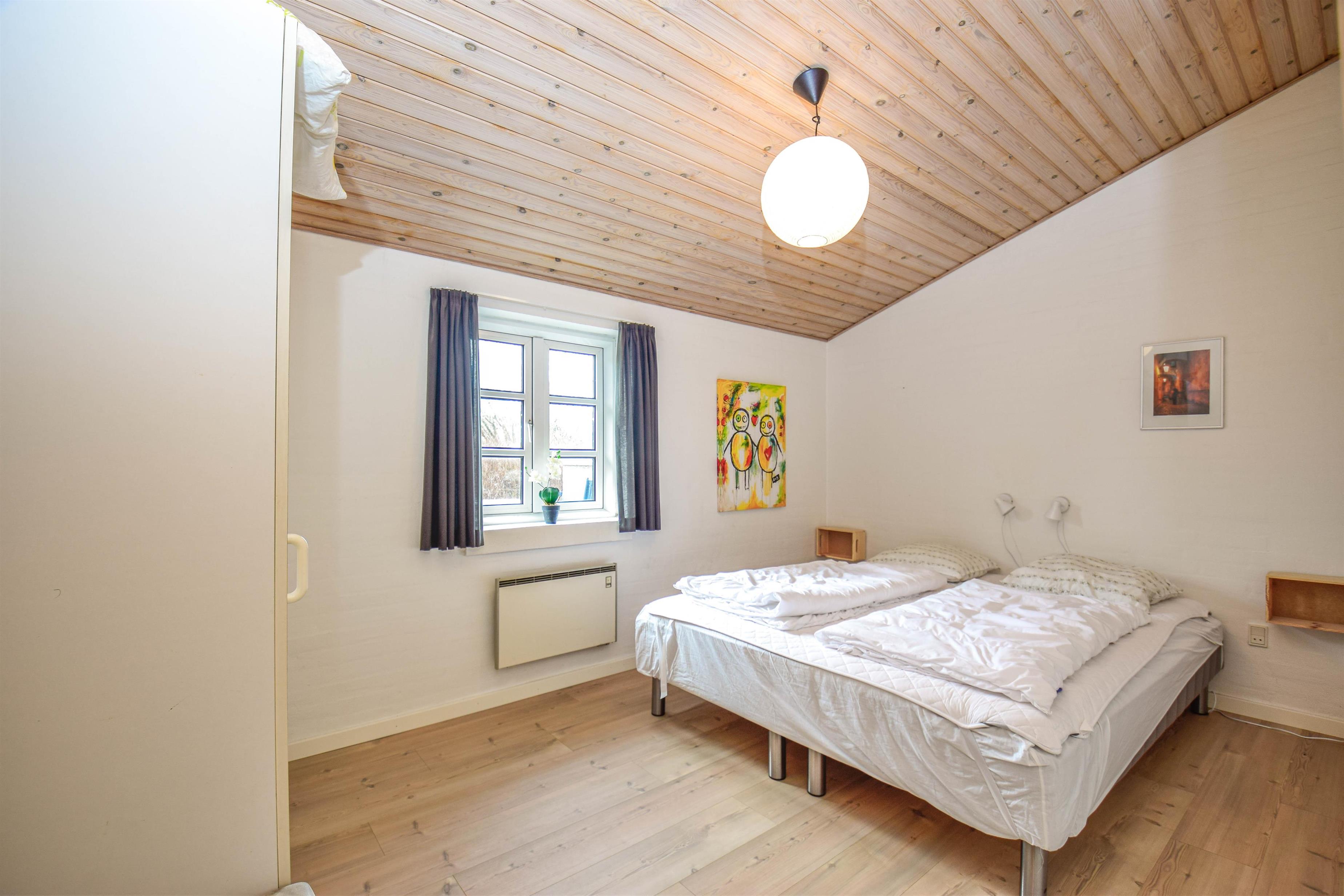 Der er to soveværelser med dobbeltsenge og to værelser med enkeltsenge – alle med trægulve og en hyggelig atmosfære. Den praktiske entré med klinker gør huset både pænt og funktionelt.