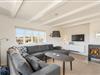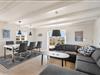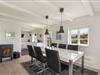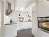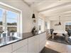 Køkkenet, med opvaskemaskine, ligger i åben forbindelse med spisestuen og stuen – et lyst og rummeligt samlingspunkt med brændeovn, fladskærms-TV og direkte udgang til begge terrasser.