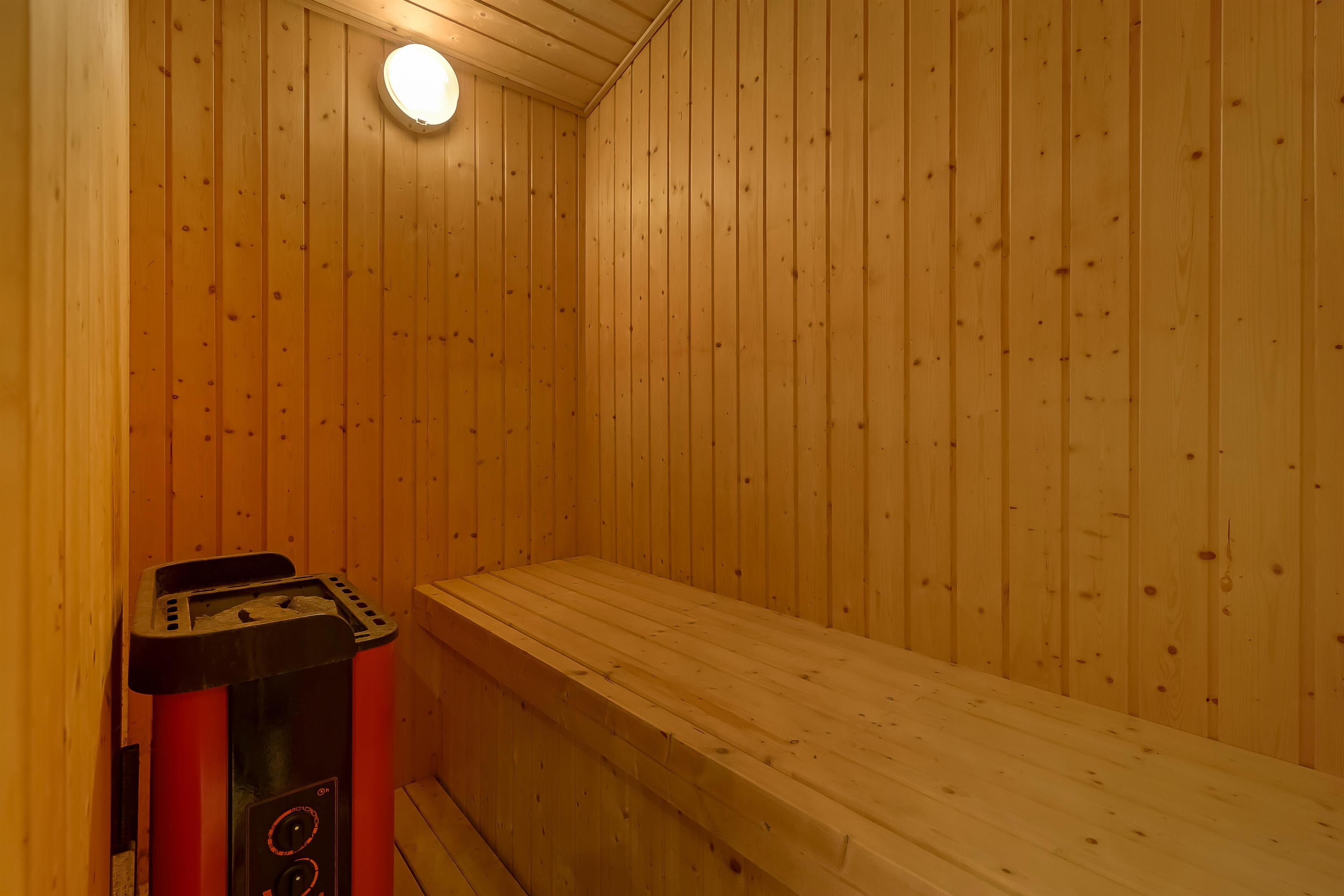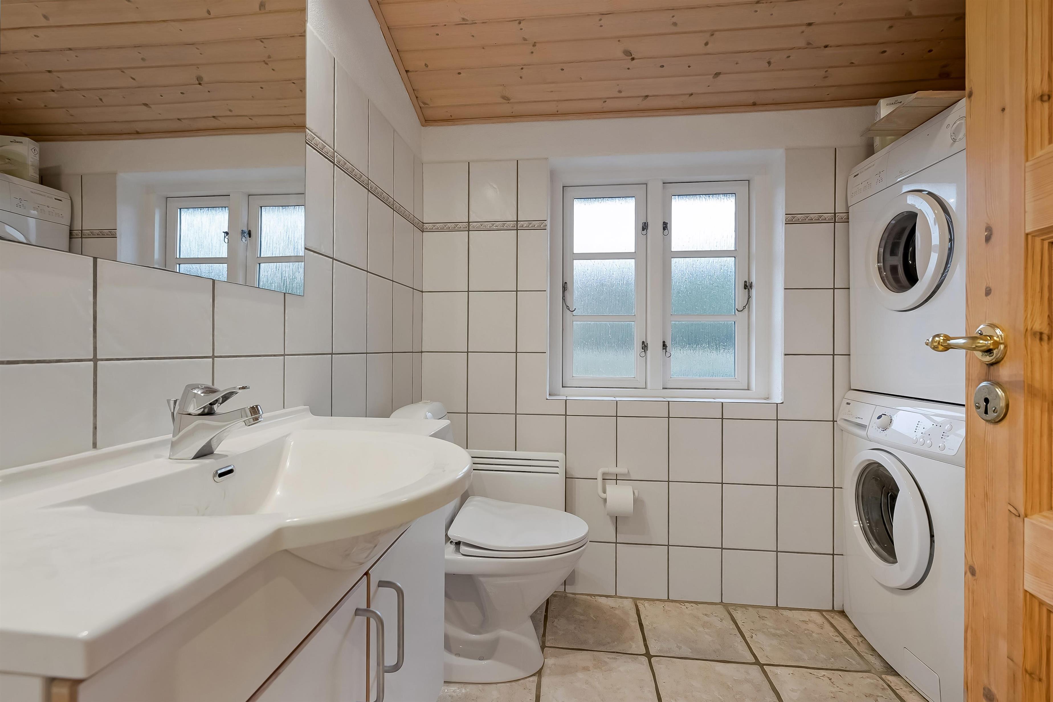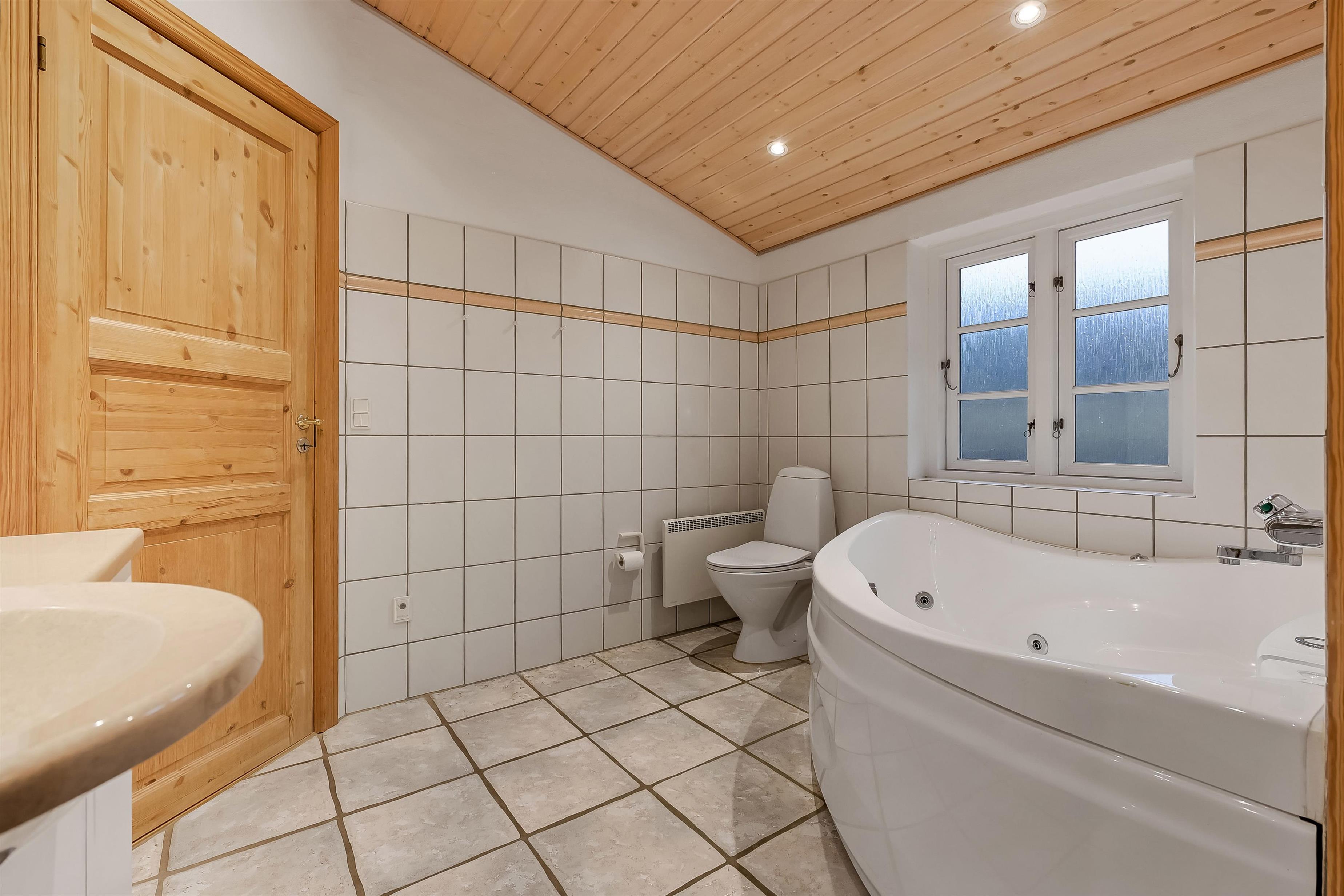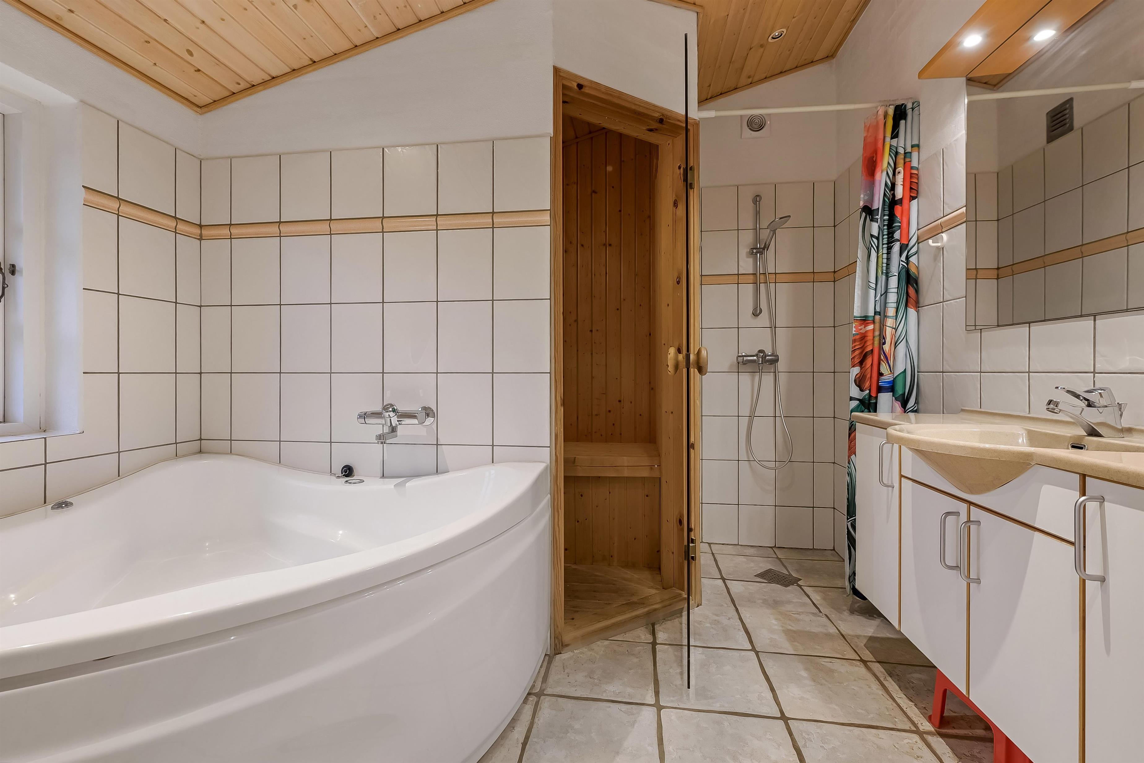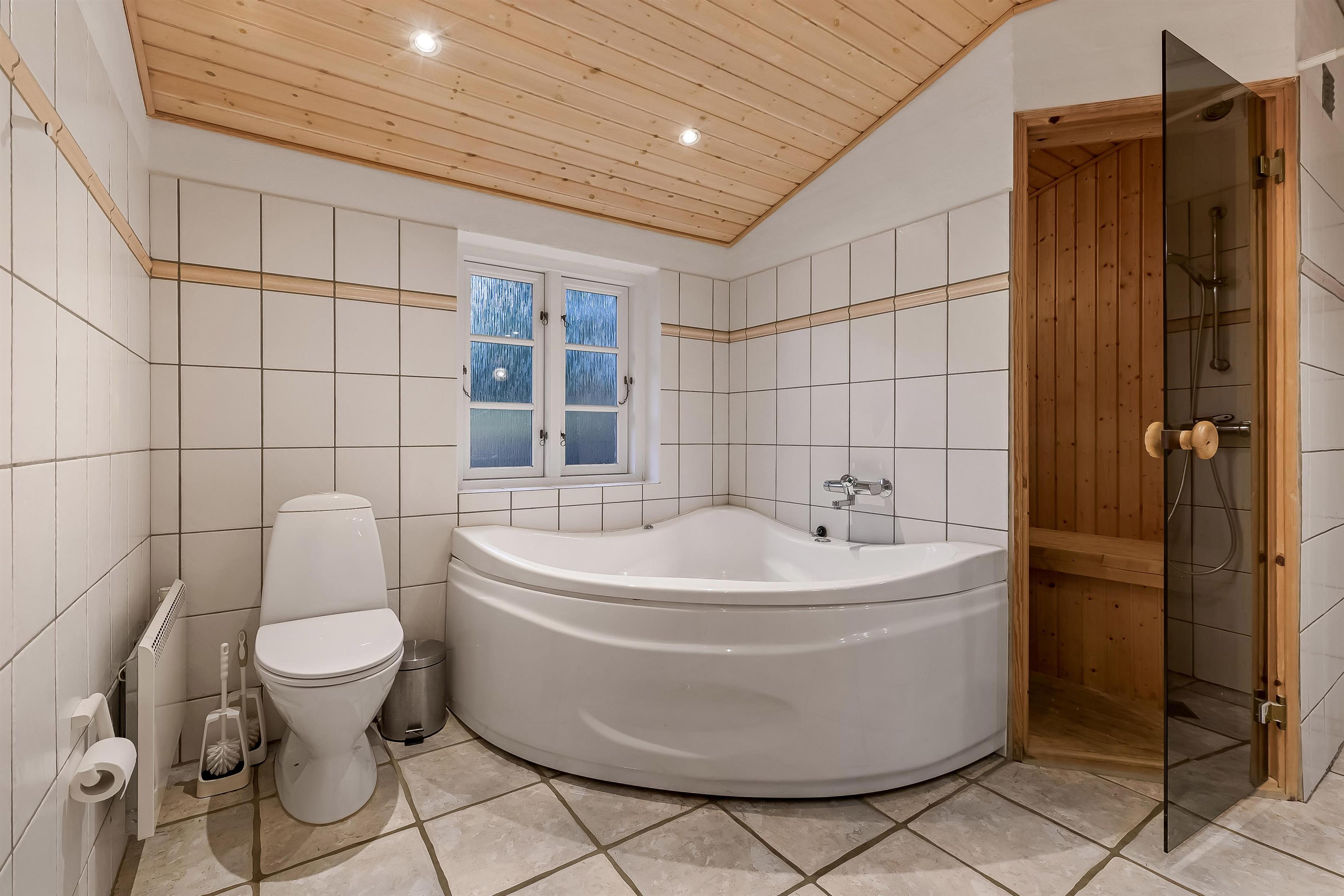 Huset har to flotte badeværelser – det ene med bruser, og det andet som et sandt wellnessrum med både spabad og sauna. Her kan I forkæle jer selv efter en dag i den friske havluft.
