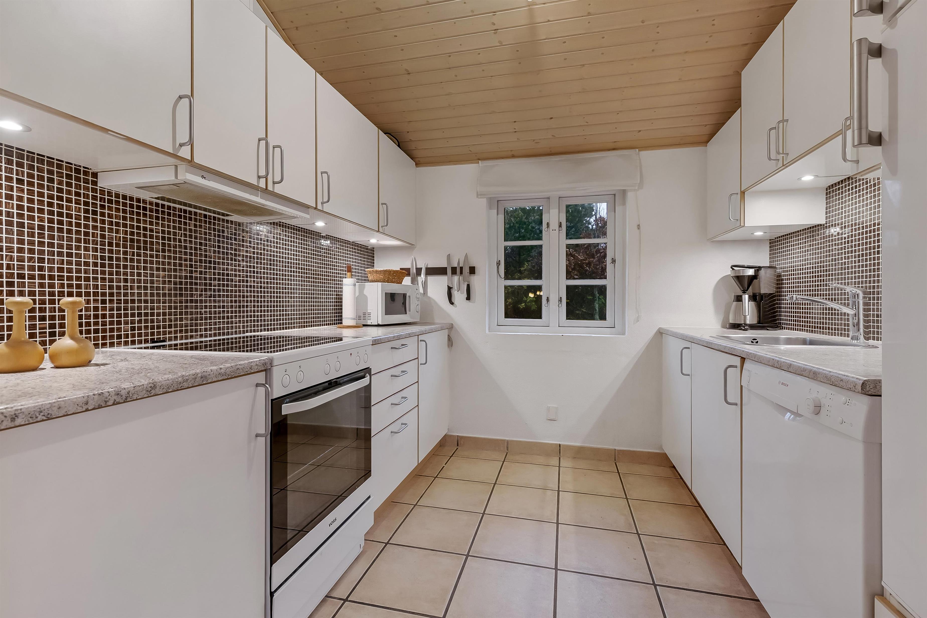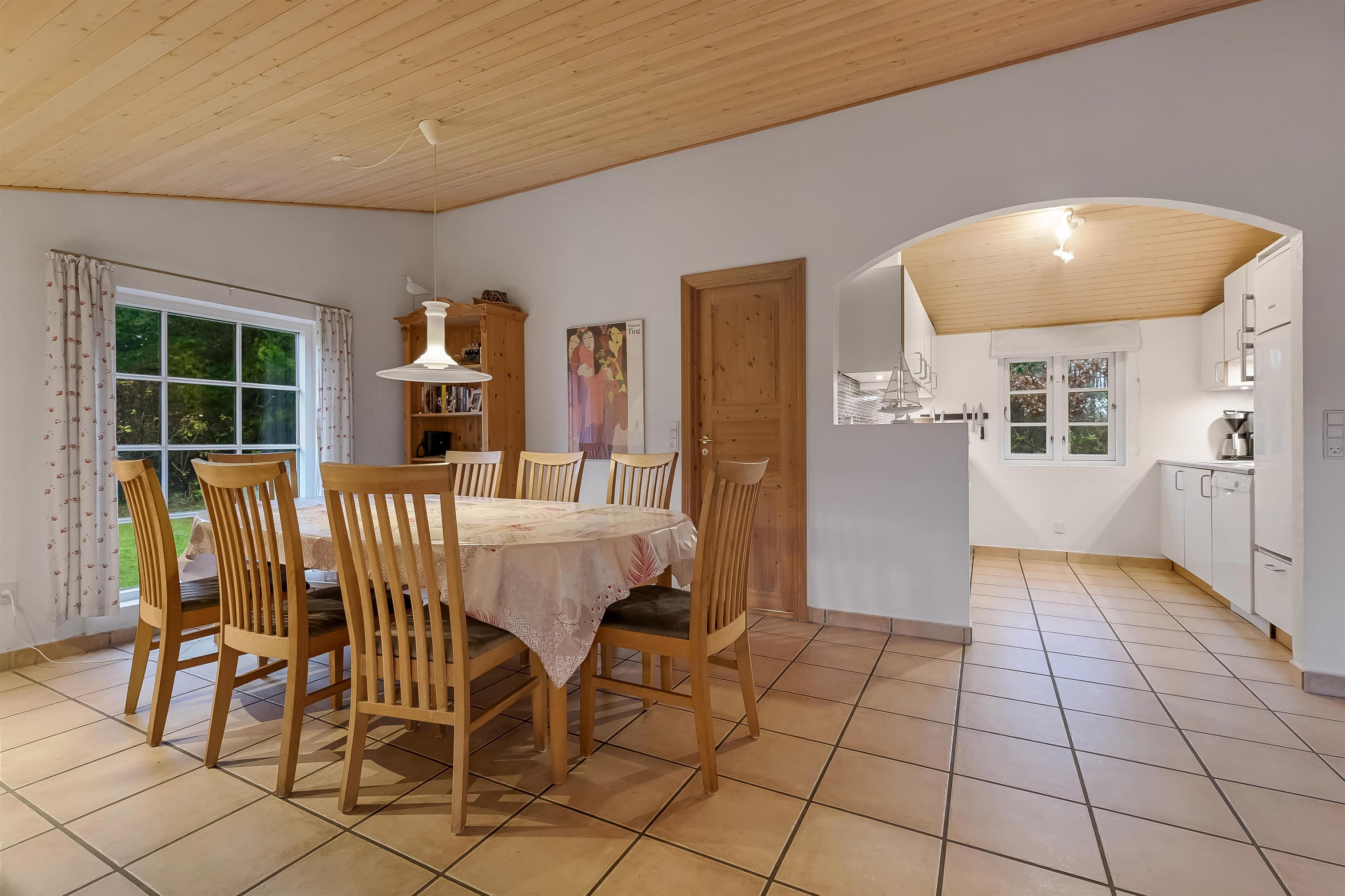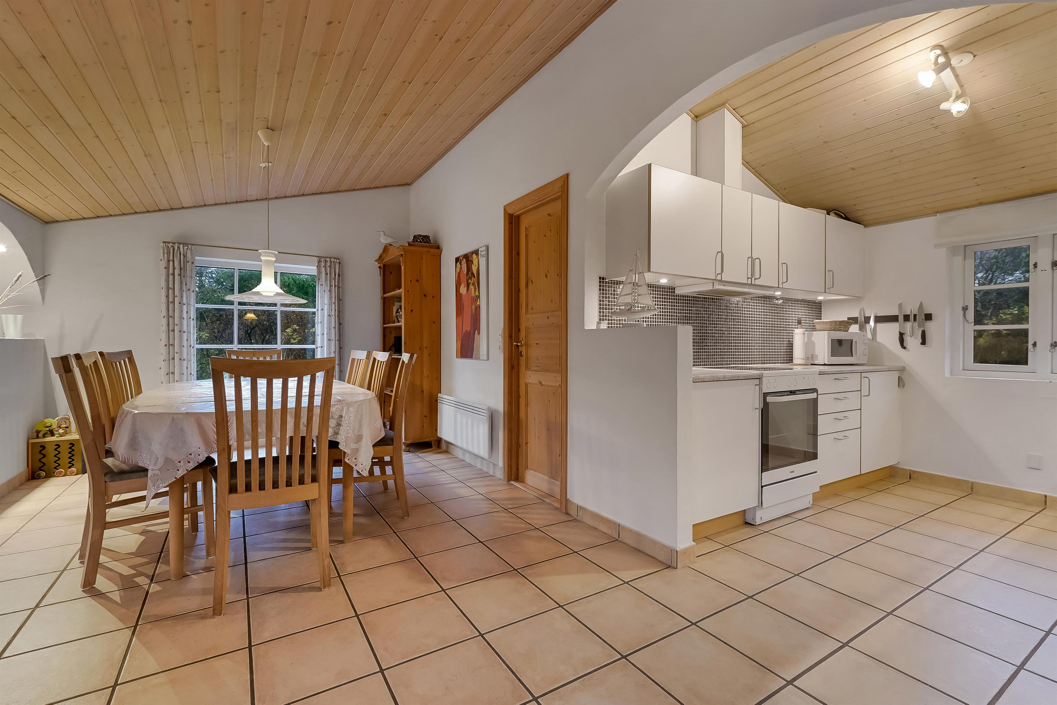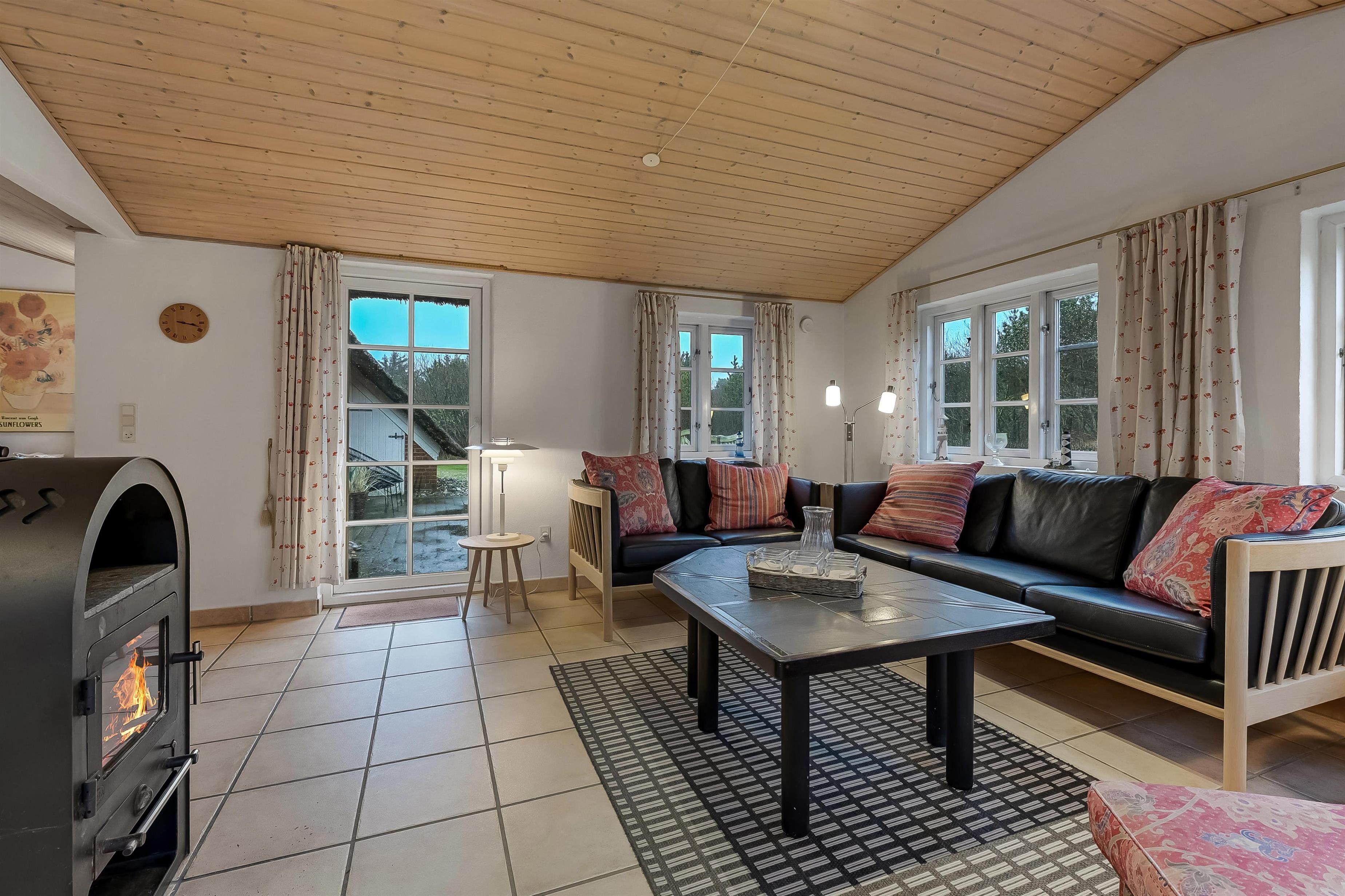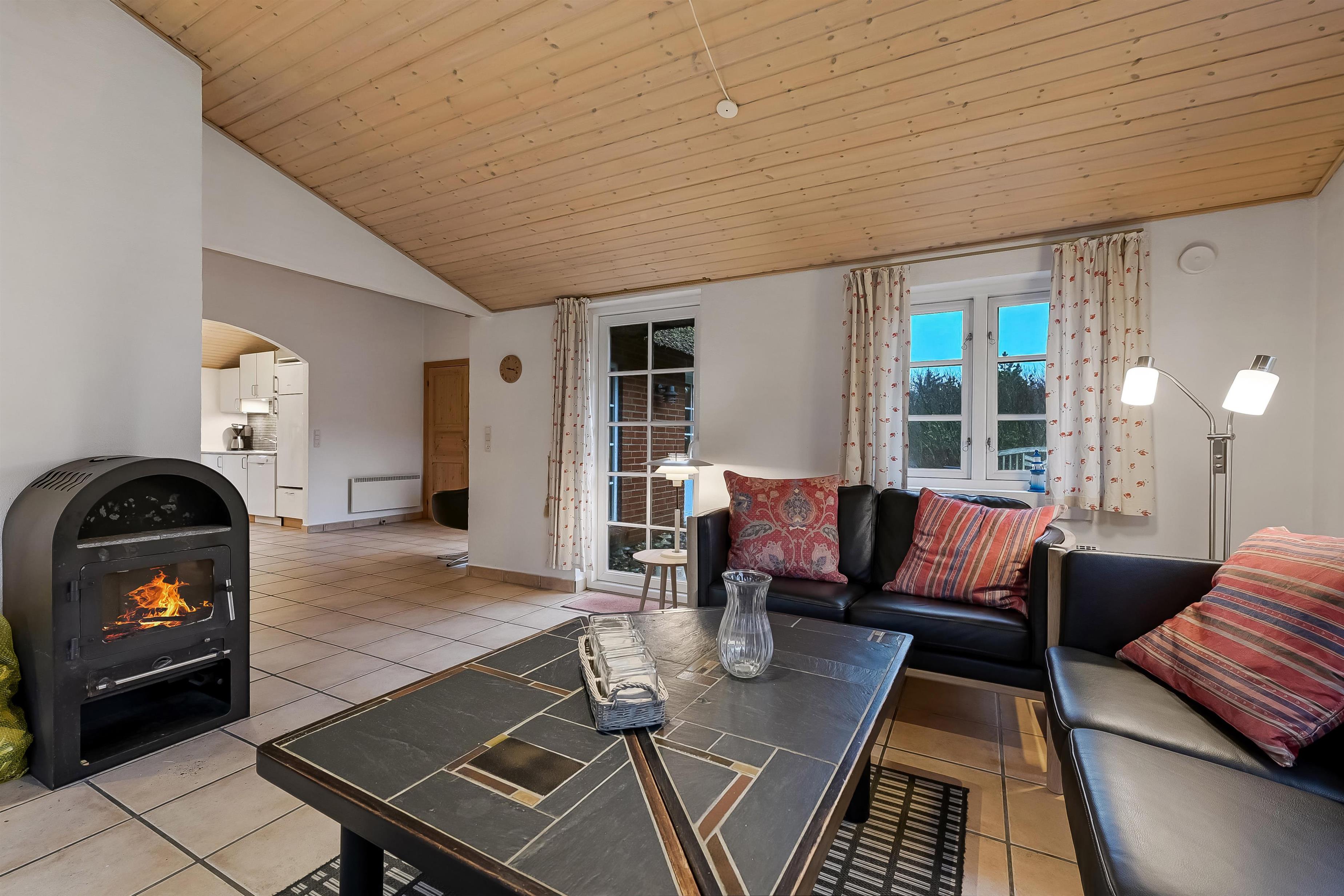 Den store, åbne stue og køkkenet danner hjertet af huset – indrettet i lyse farver, med flotte klinkegulve, komfortable møbler og en stemningsfuld brændeovn, der spreder varme og ro på kølige dage.