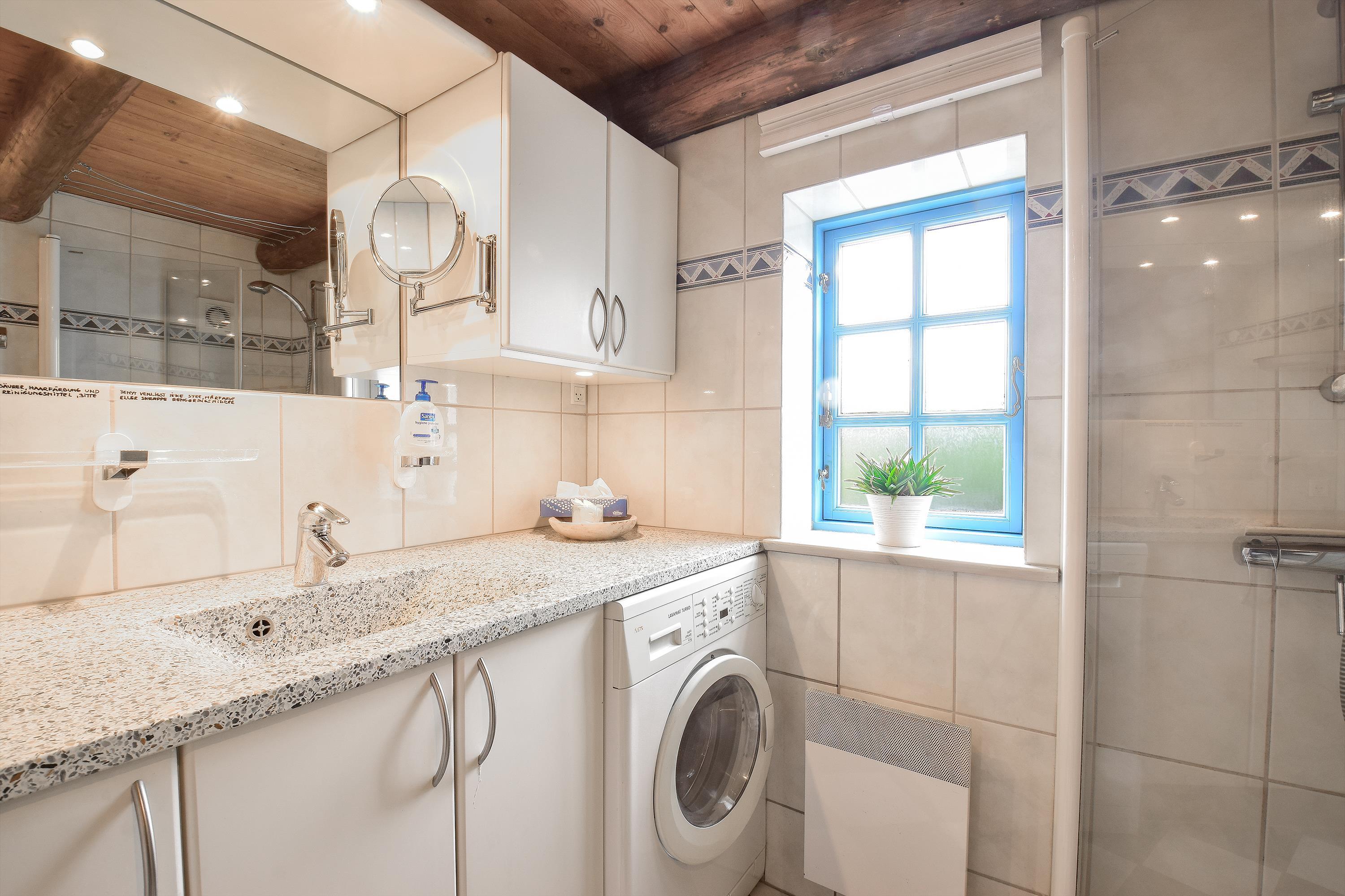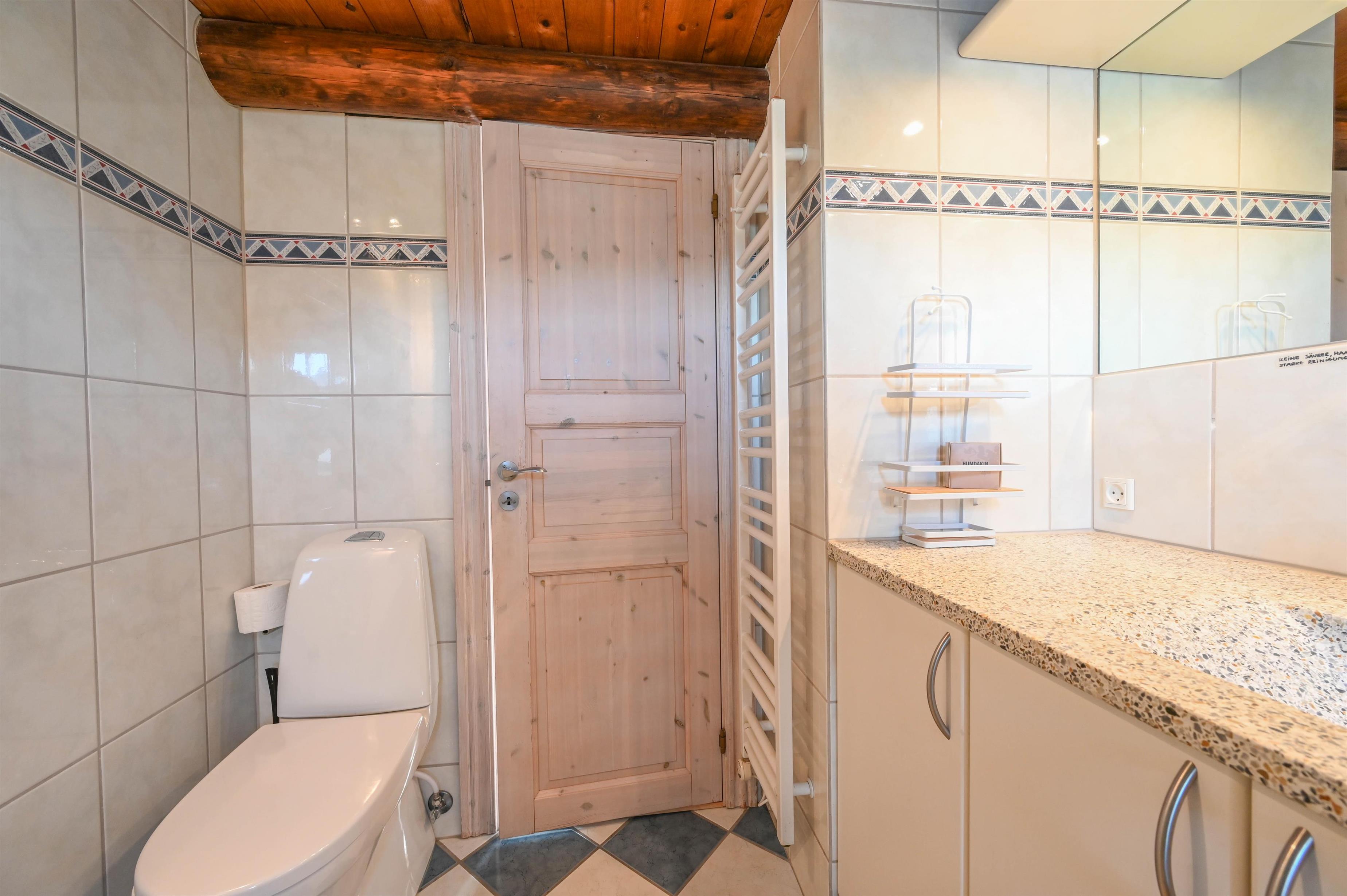 I stueplan finder I et soveværelse med dobbeltseng, en lille gang og et flot badeværelse med gulvvarme.