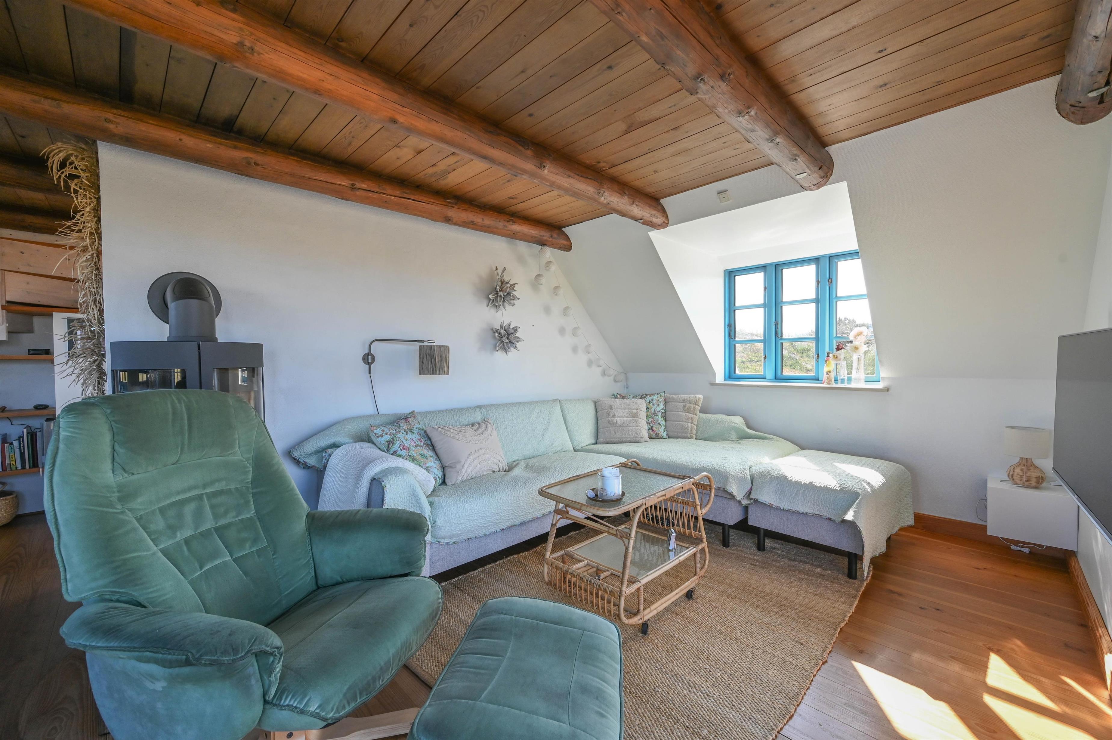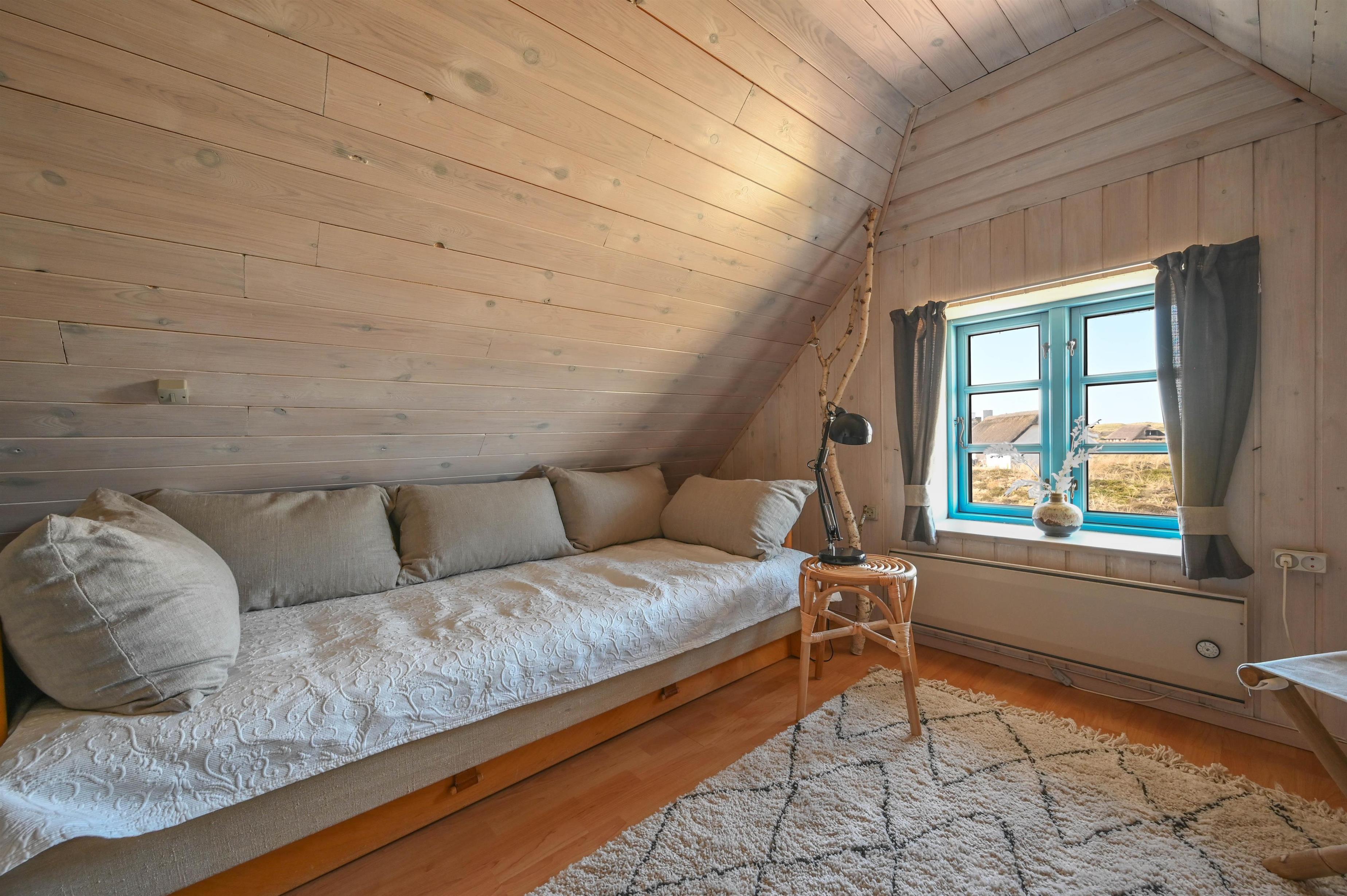 Det dejlige køkken/alrum danner rammen om samvær og gode måltider, og fra sofahjørnet i stuen har I en fantastisk udsigt over klitterne mod vest – et perfekt sted at nyde en kop kaffe eller bare slappe af efter en dag ved stranden.