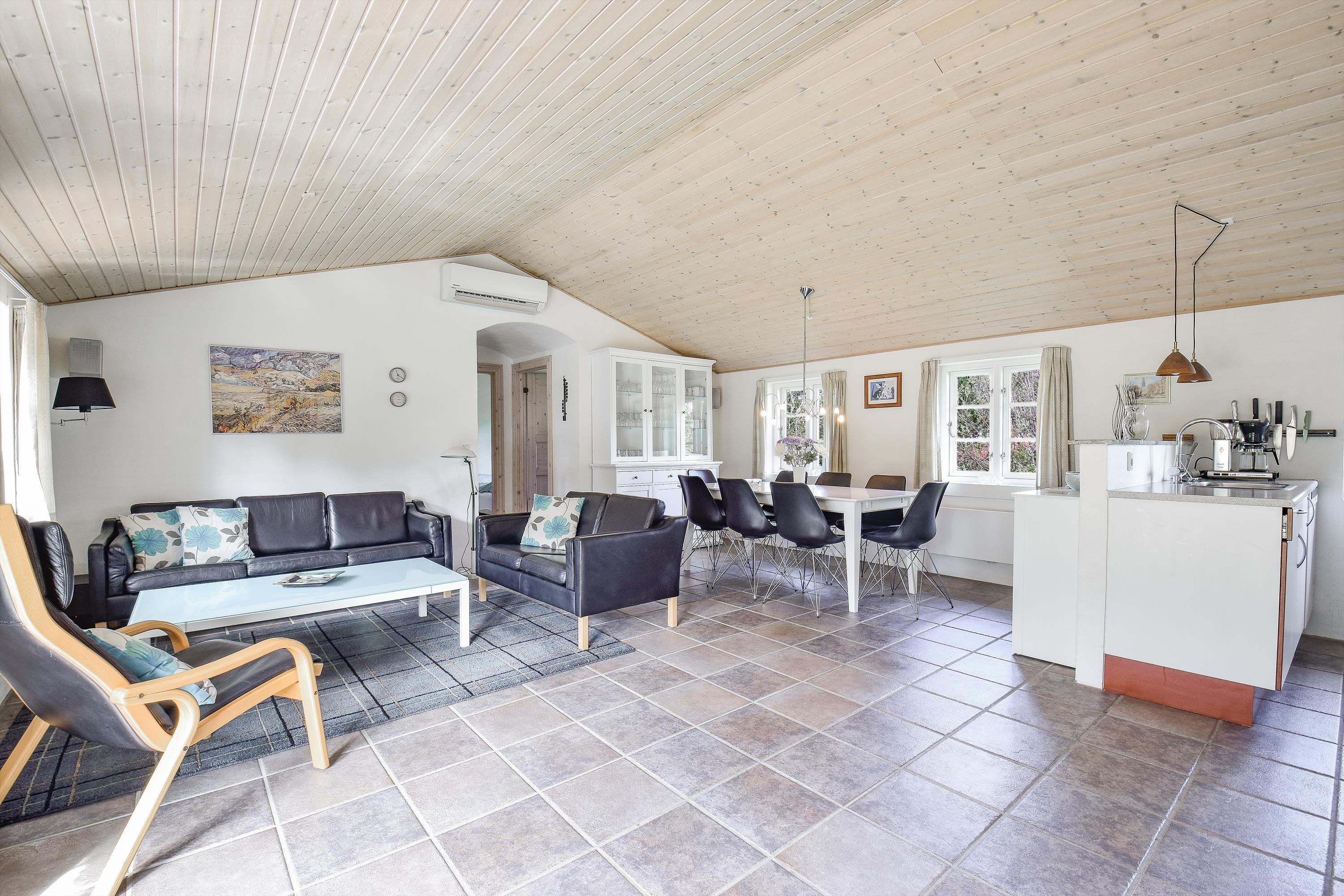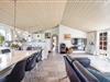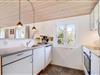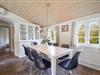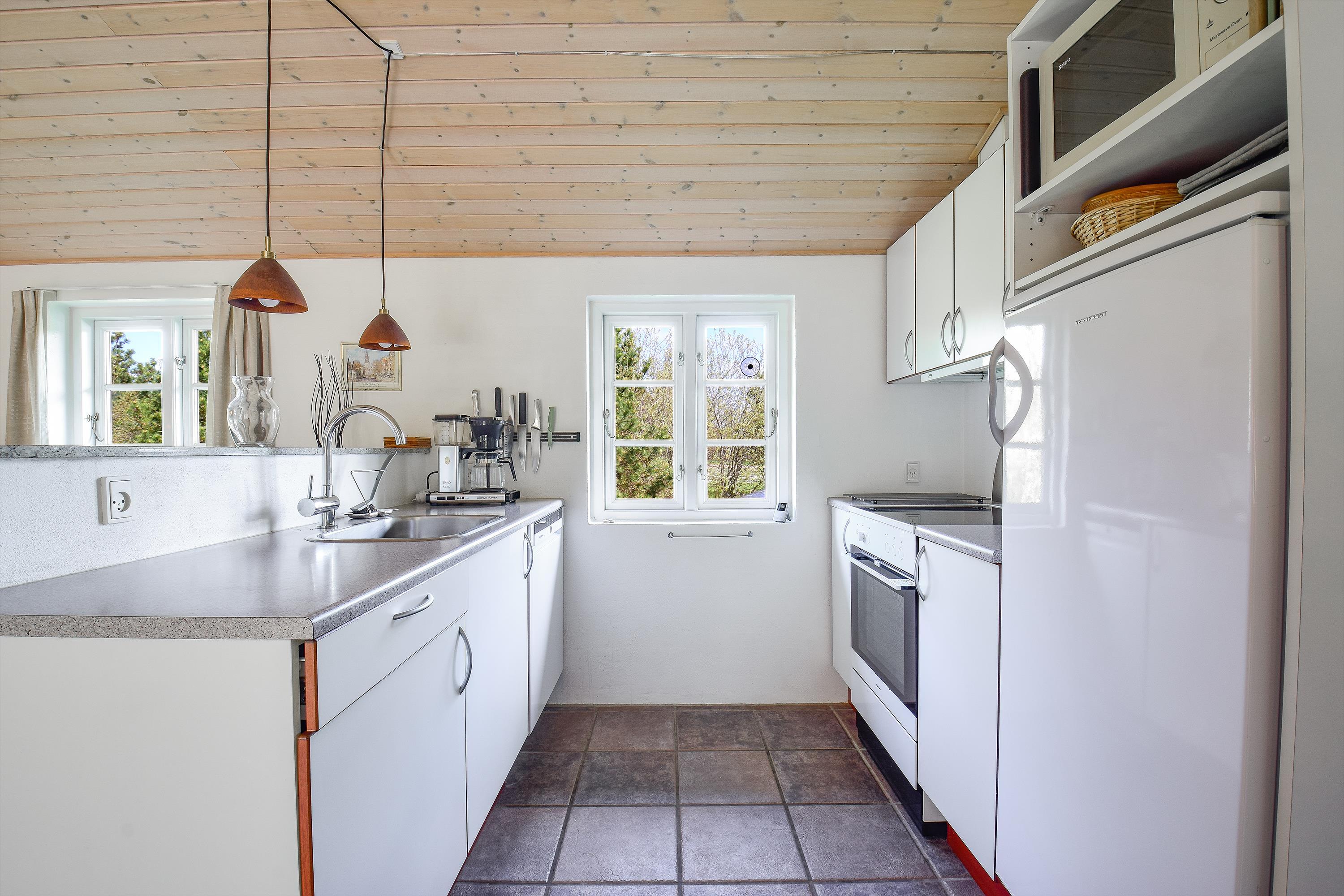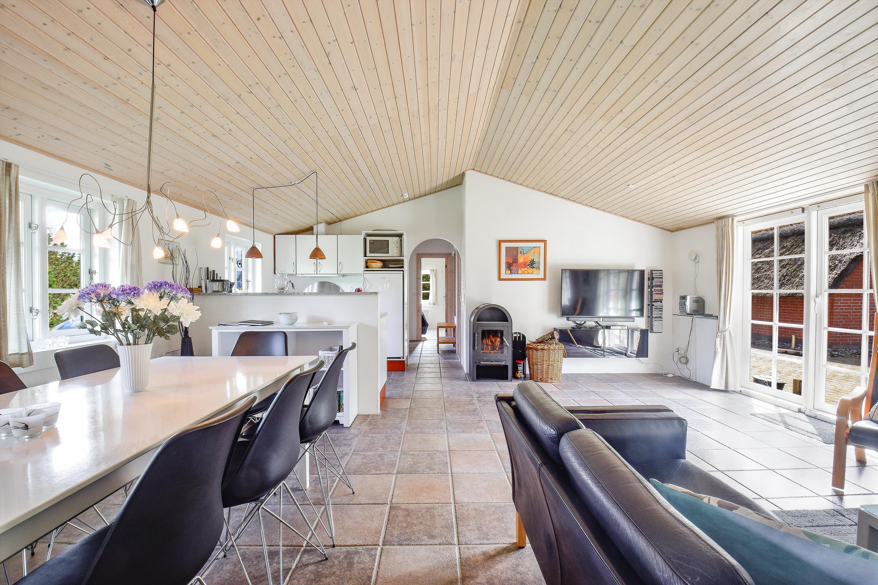Praktisk entré med vaskemaskine og tørretumbler. Et veludstyret køkken med opvaskemaskine, som ligger i åben forbindelse med den lyse spiseafdeling og hyggelige stue. Her er brændeovn og komfortable møbler, der skaber den perfekte ramme for hyggelige aftener efter en dag ved havet.