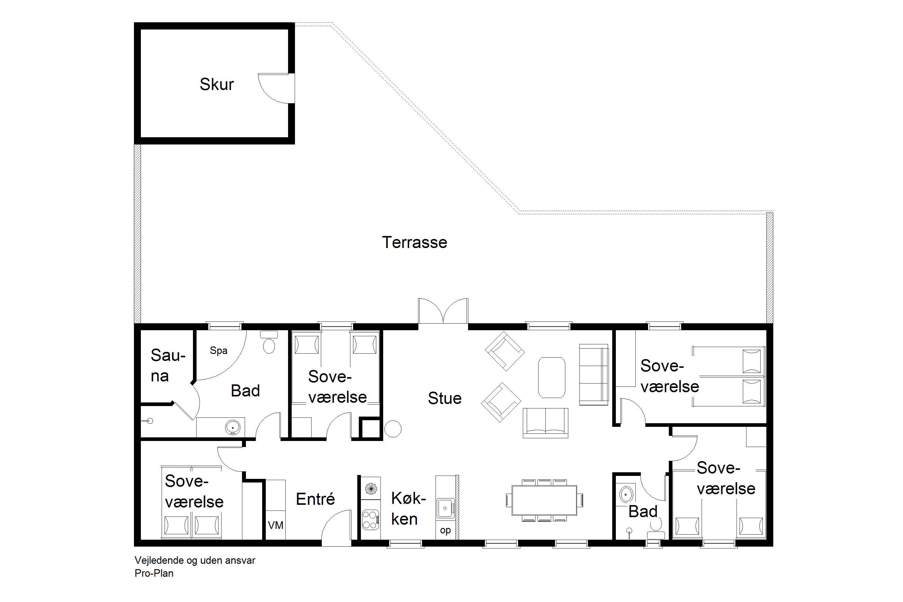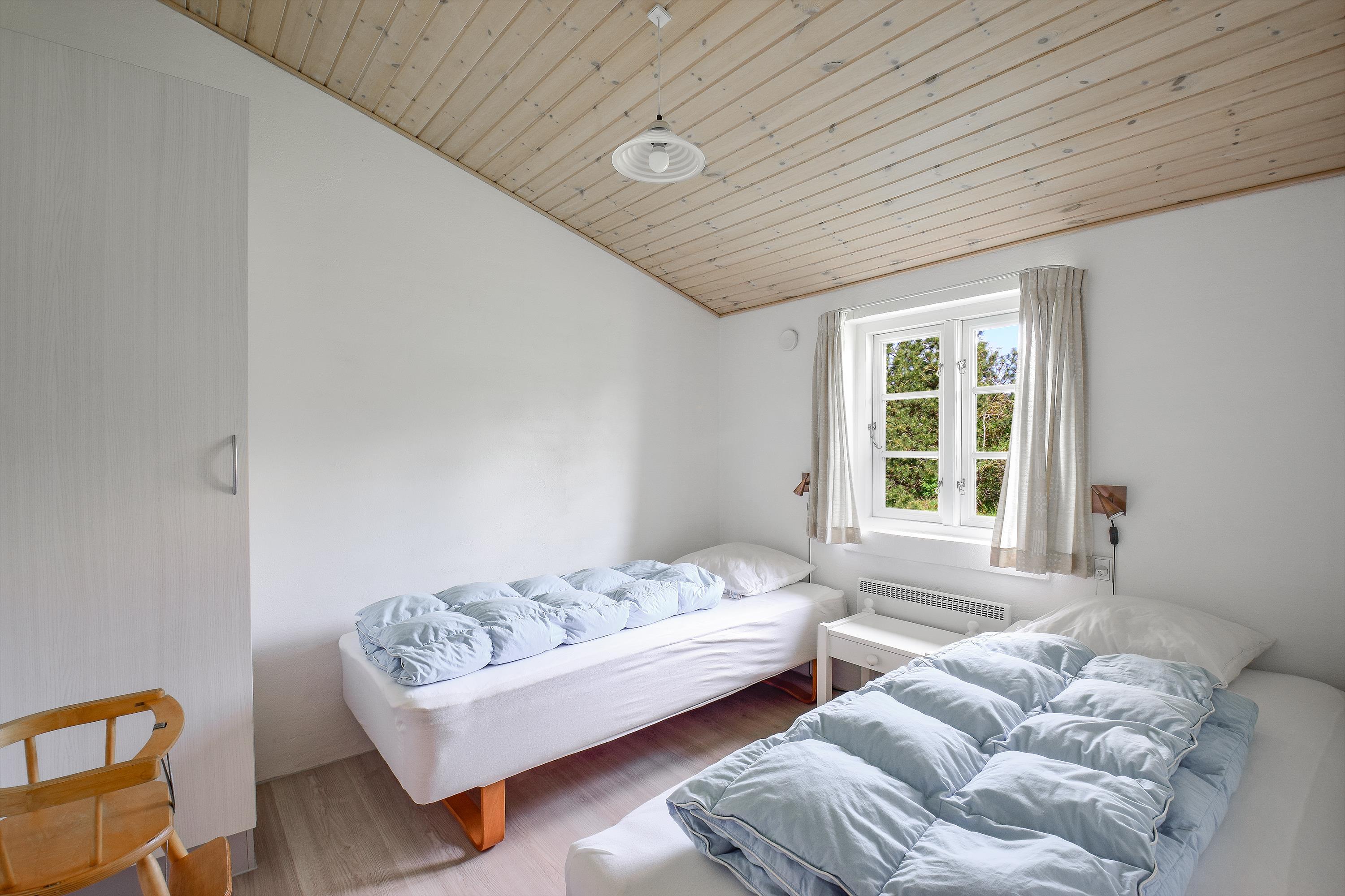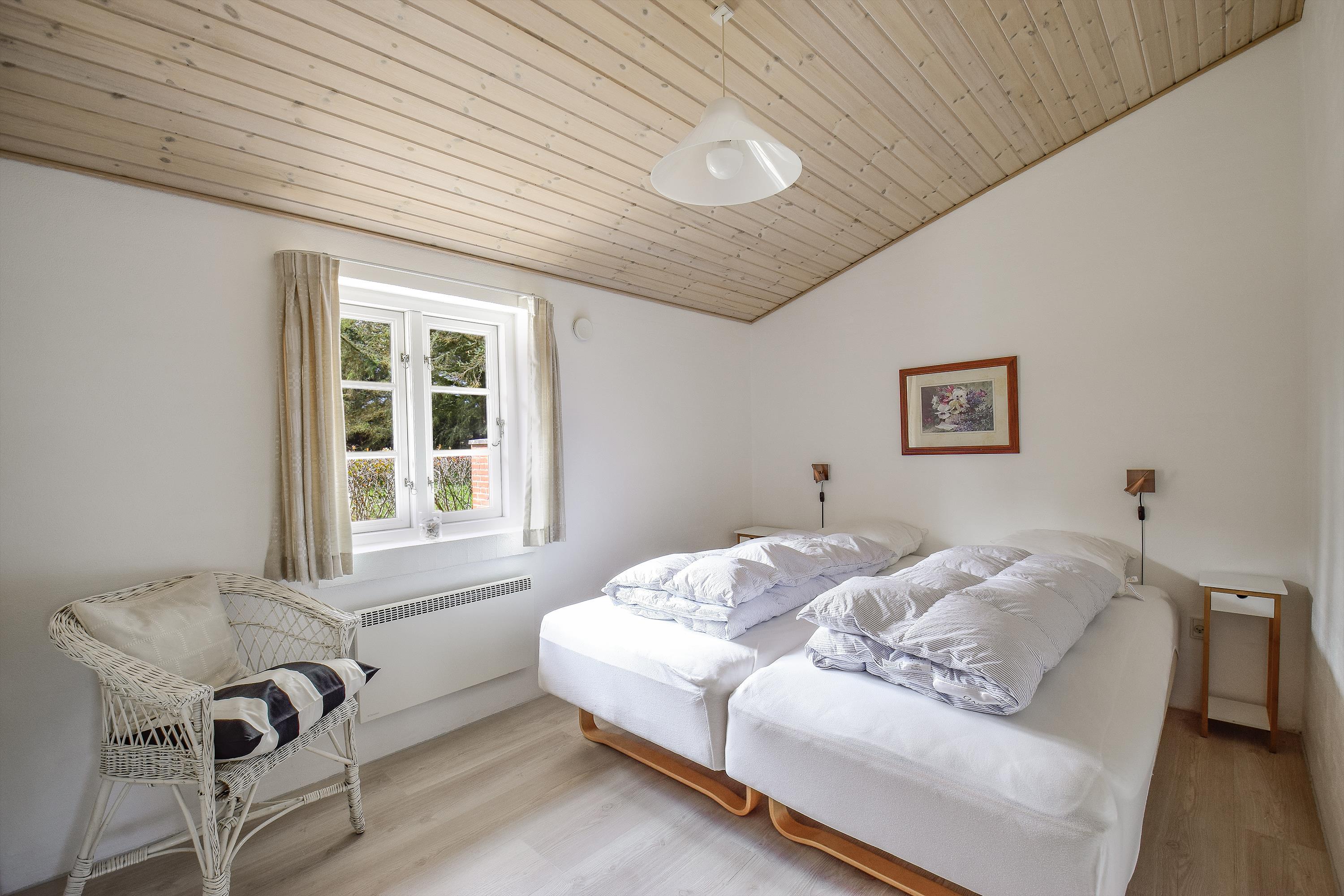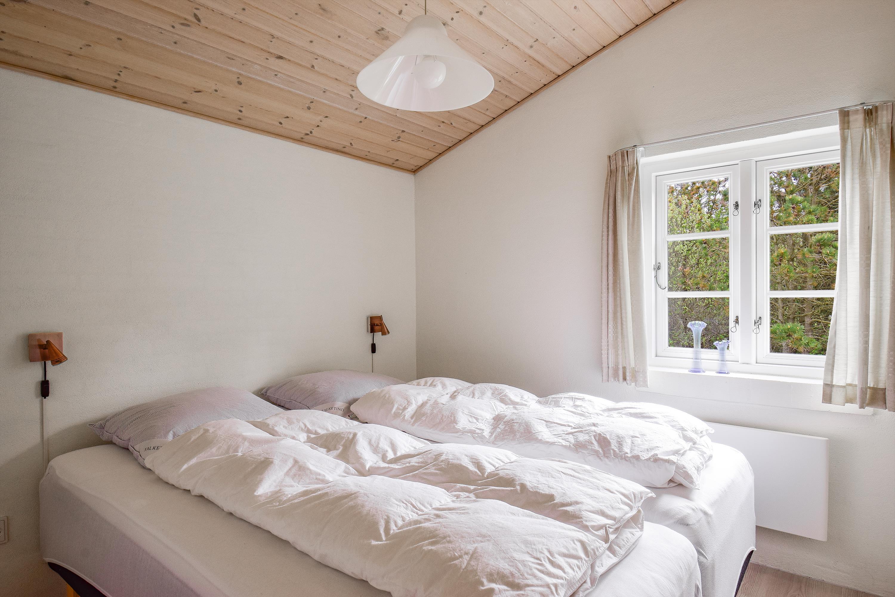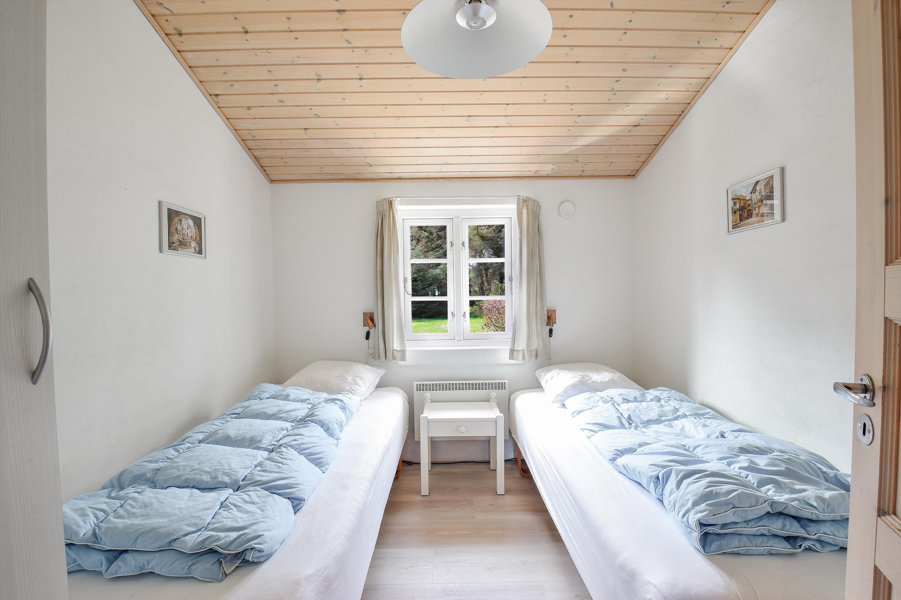 Huset har to separate soveafdelinger – ideelt til både familier og venner, der ønsker lidt privatliv. I hver ende findes to værelser: ét med dobbeltseng og ét med to enkeltsenge, samt et badeværelse.
