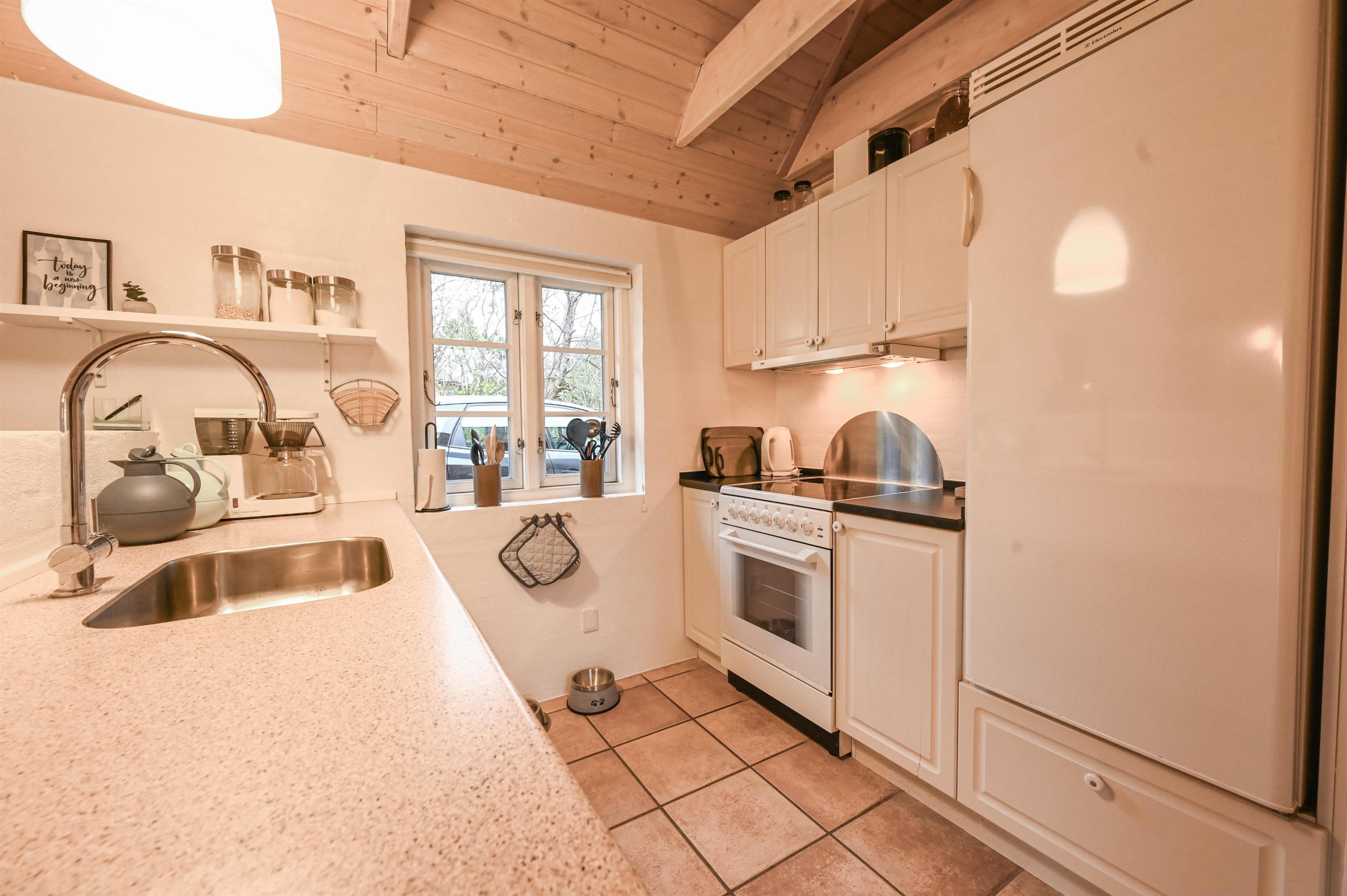 Det veludstyrede køkken ligger i åben forbindelse med stuen, hvor brændeovnen, spiseområdet og sofaafdelingen indbyder til hyggelige stunder. Herfra er der direkte adgang til den sydvendte terrasse, hvor du kan nyde solen dagen lang.