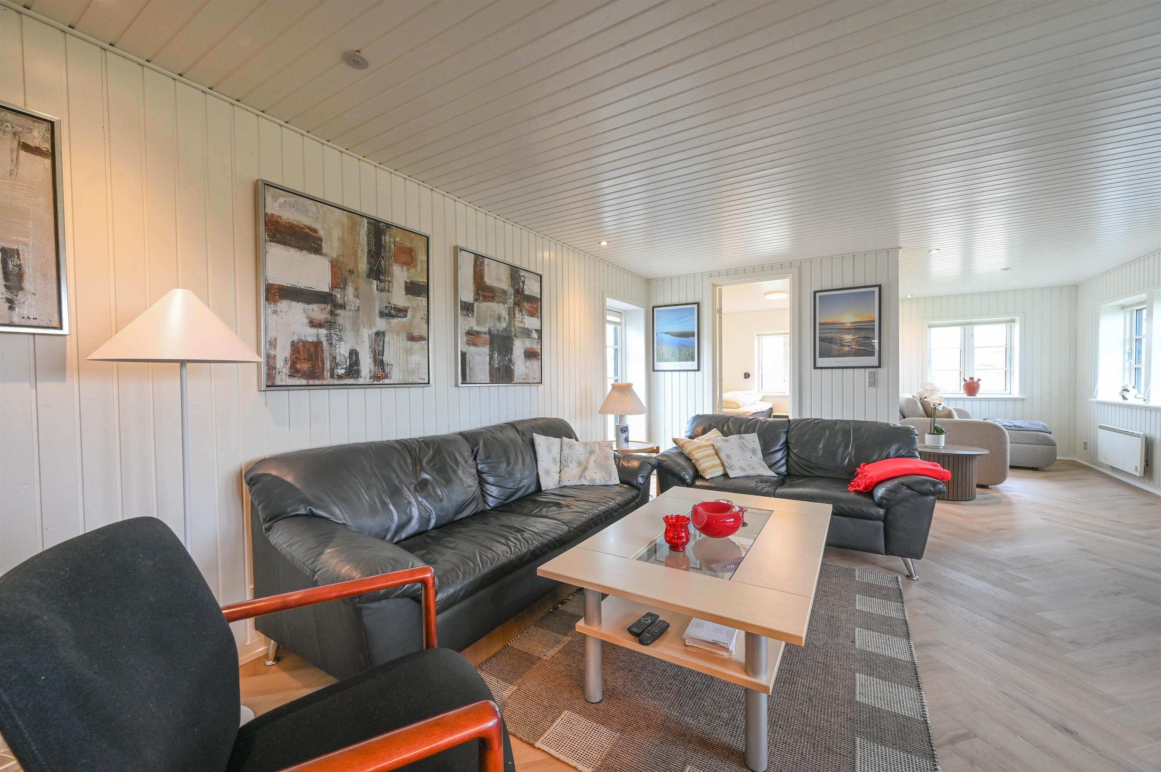 Det åbne køkkenalrum danner hjertet i huset – med spiseplads, sofaområde og en hyggelig brændeovn, der spreder varme og stemning, når vinden rusker udenfor. Herfra er der udgang til en dejlig terrasse med udsigt mod klitterne – et ideelt sted at nyde morgensolen eller dagens sidste lys.