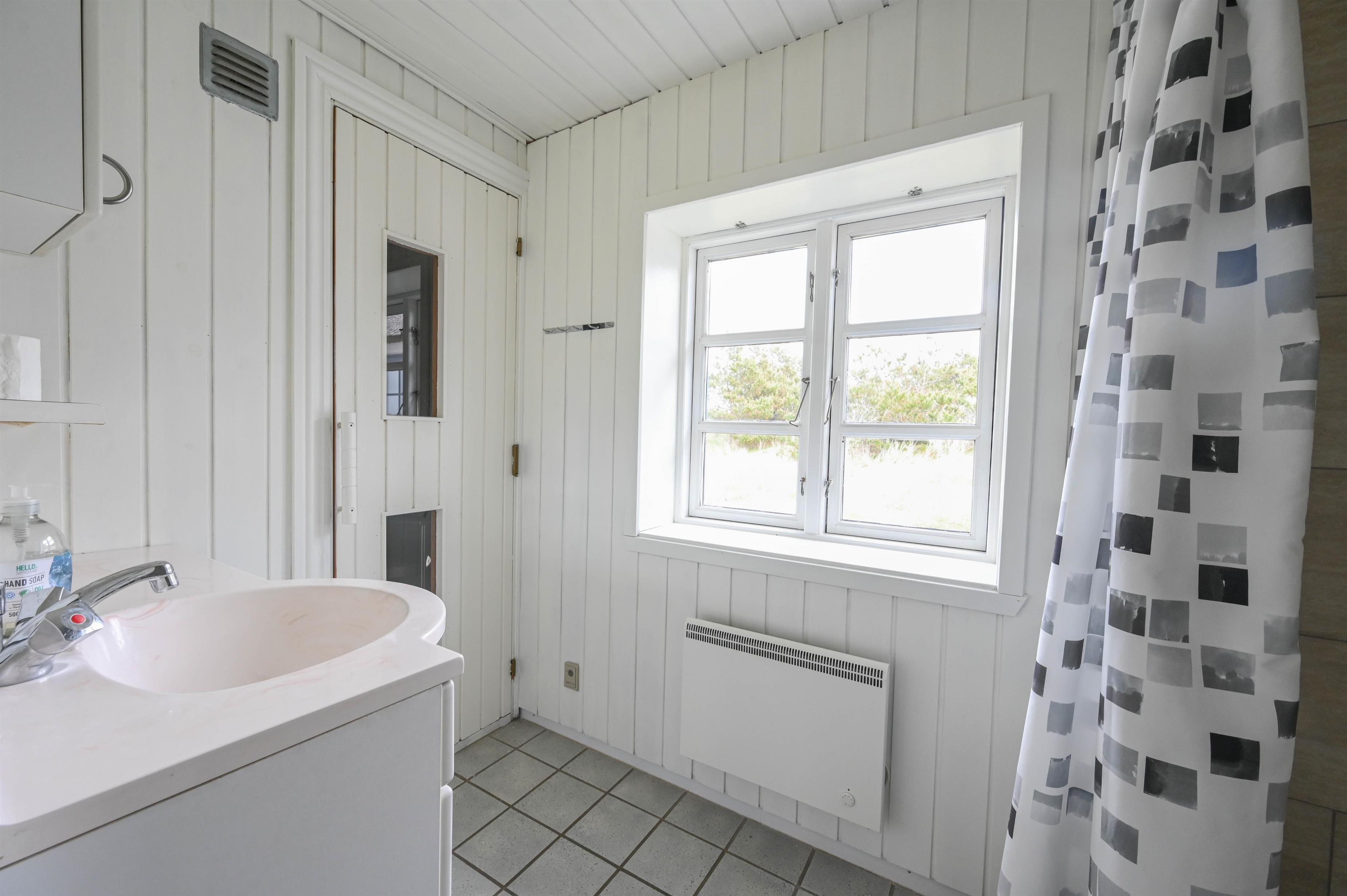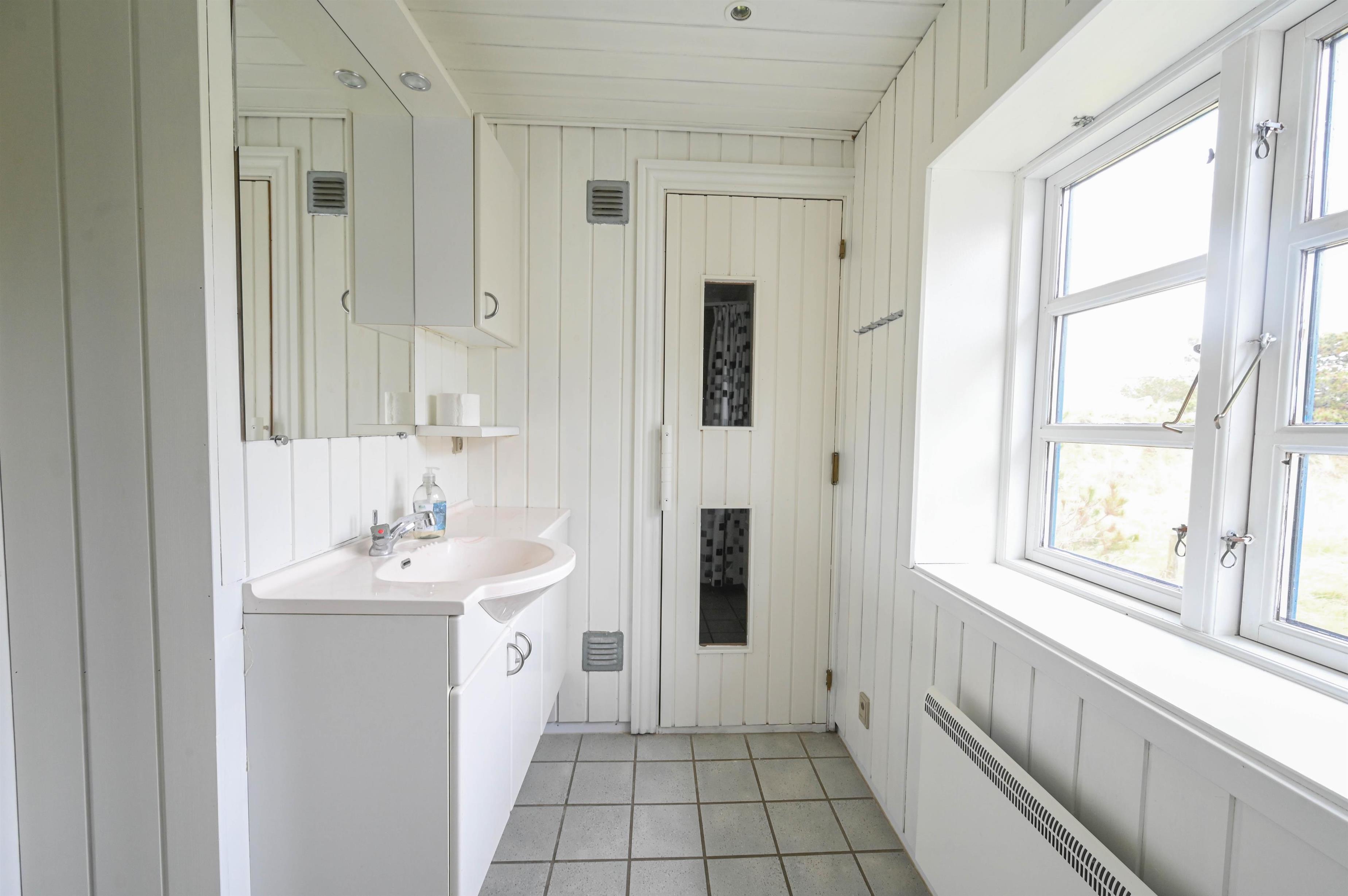 Et lyst badeværelse med sauna – perfekt til afslapning efter en lang dag ved havet