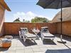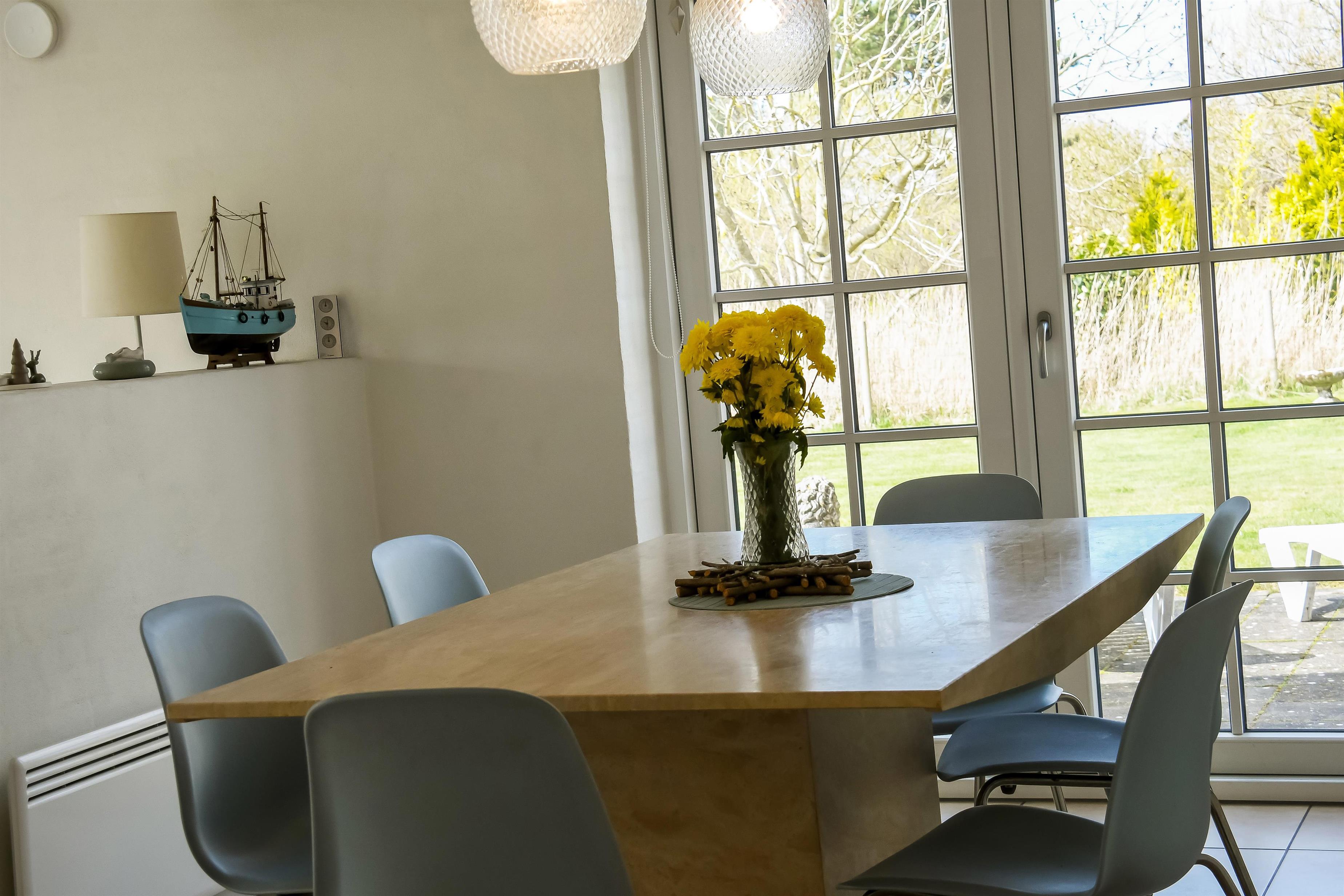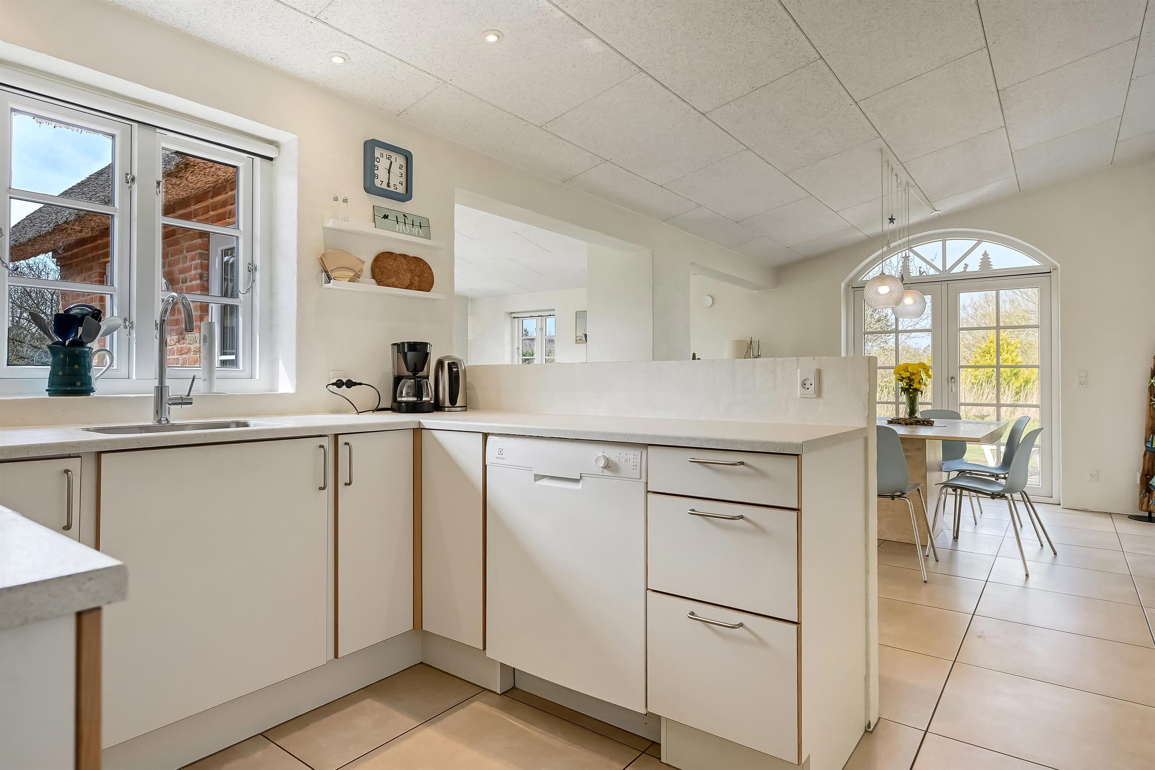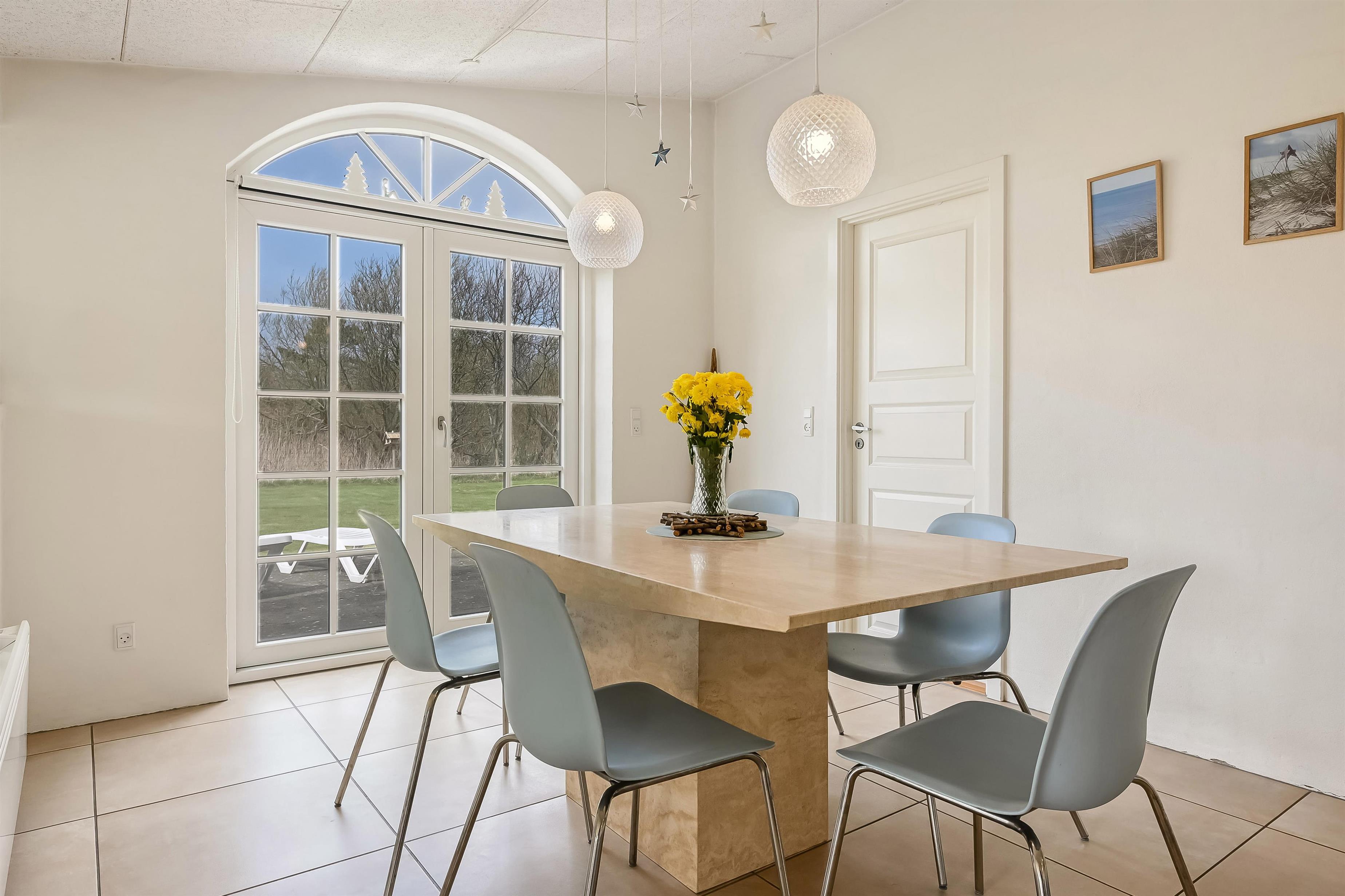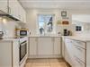 Veludstyret køkken med spiseplads og dobbeltdør til vestvendt terrasse