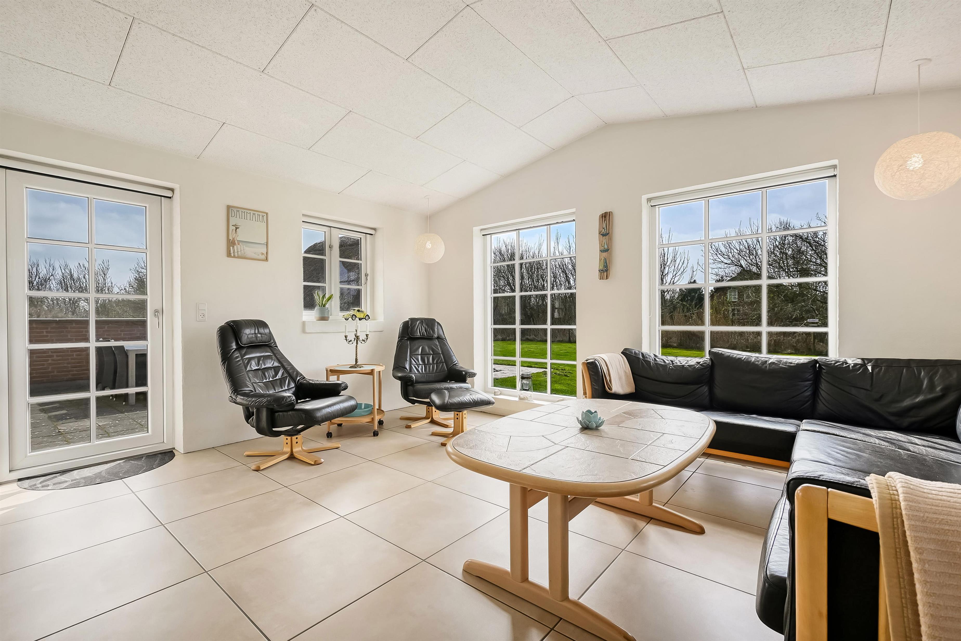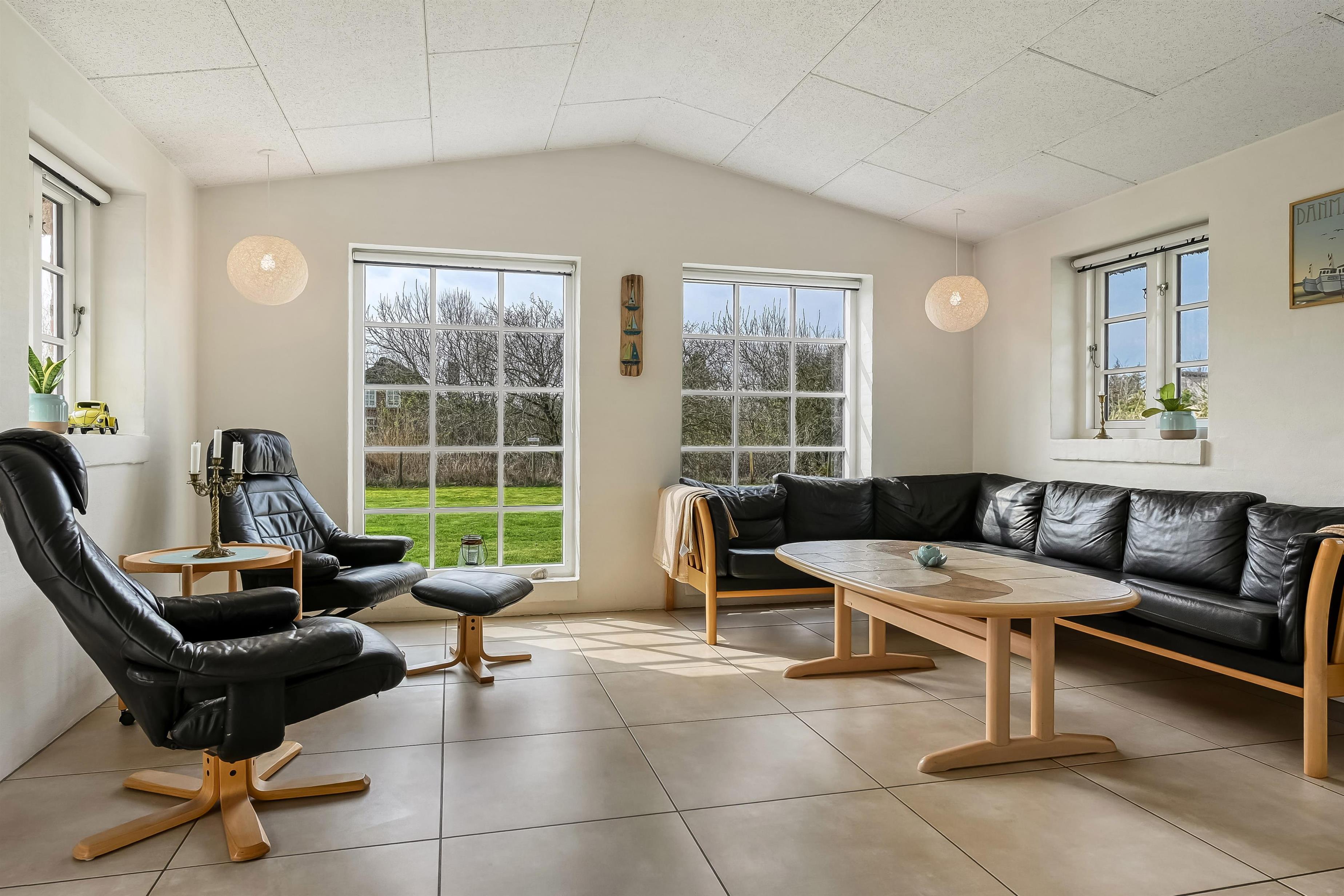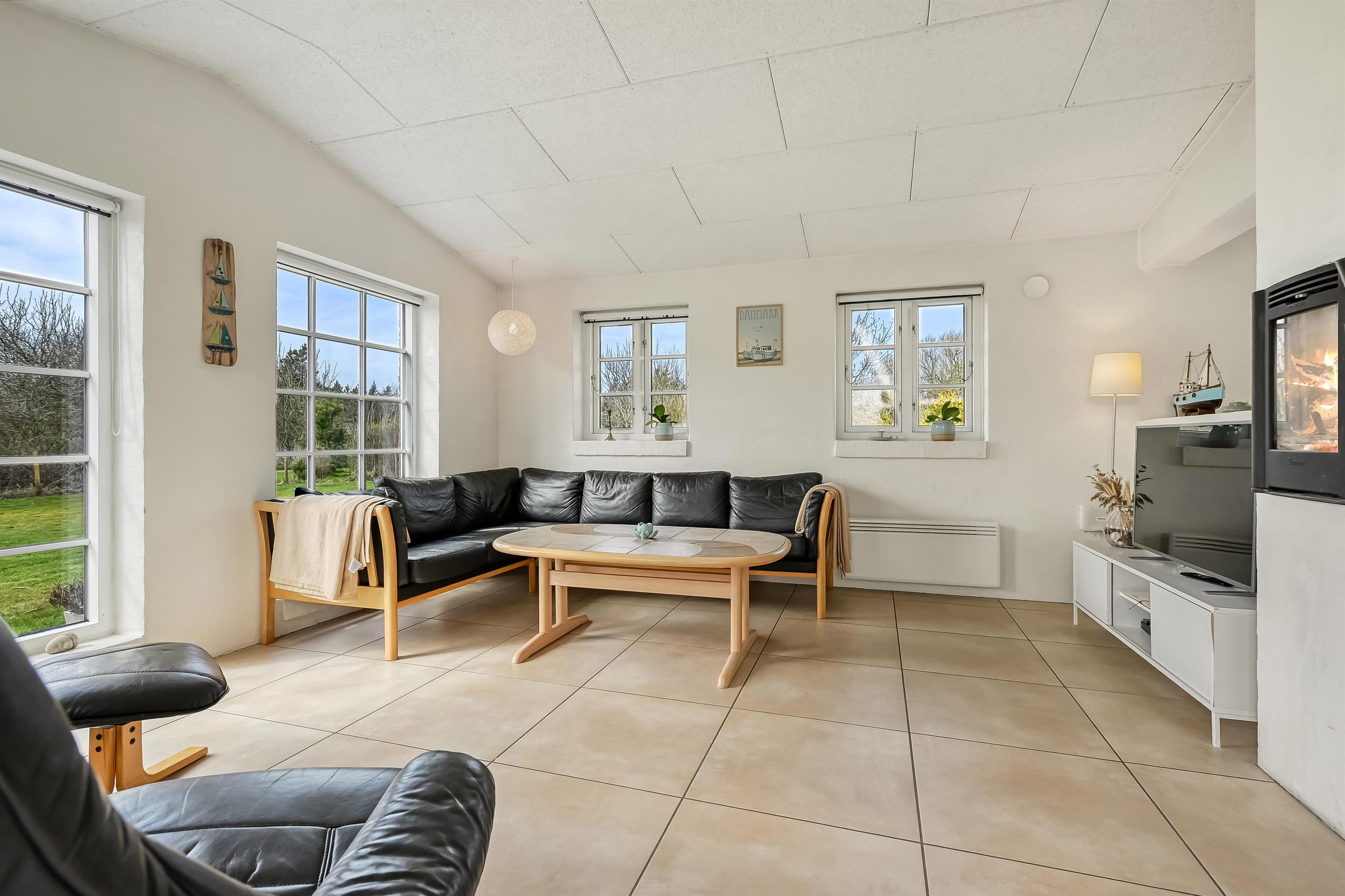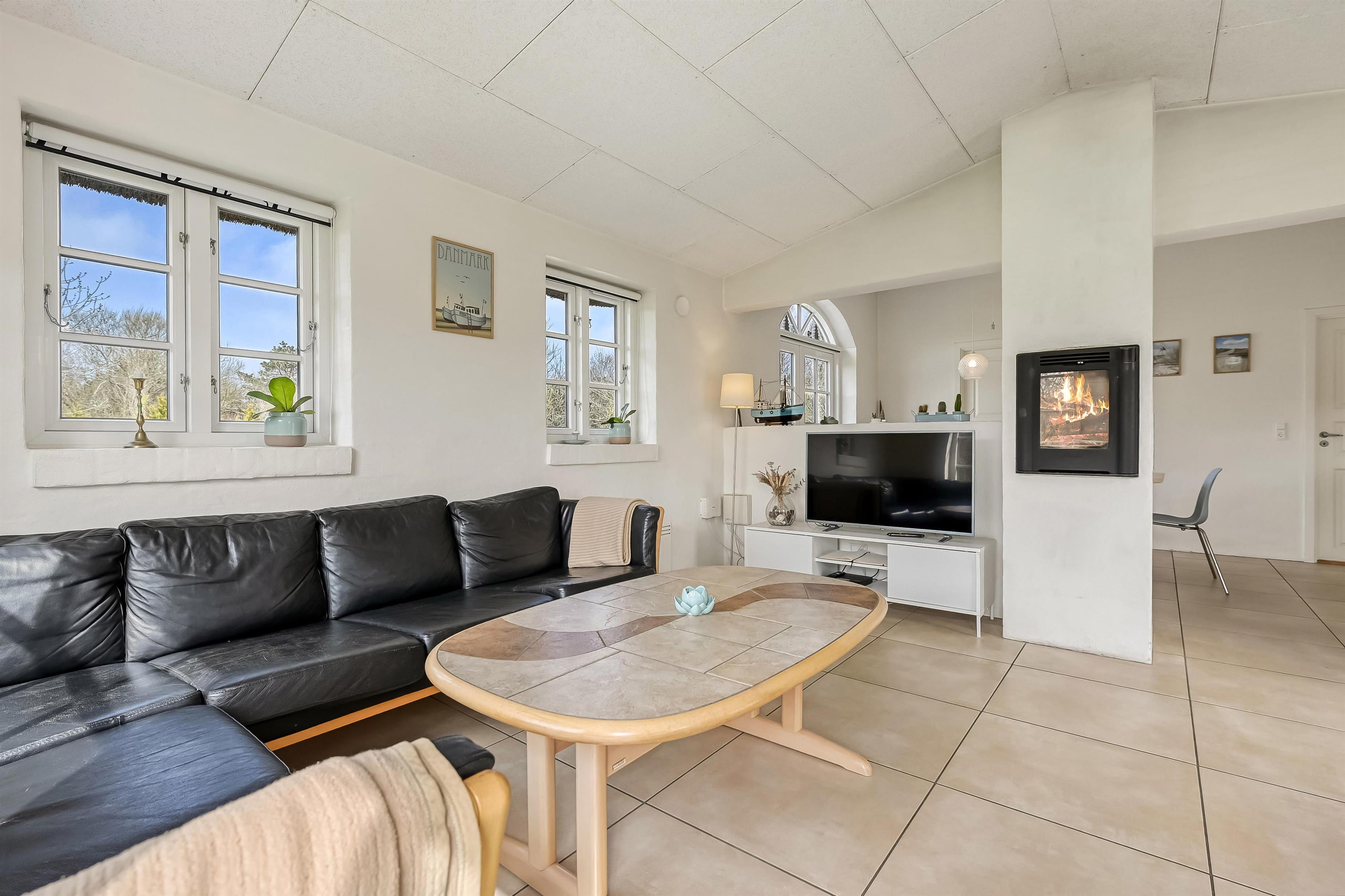 Det lyse opholdsrum med brændeovn og gulvvarme indbyder til hyggelige stunder året rundt – uanset vejret udenfor.