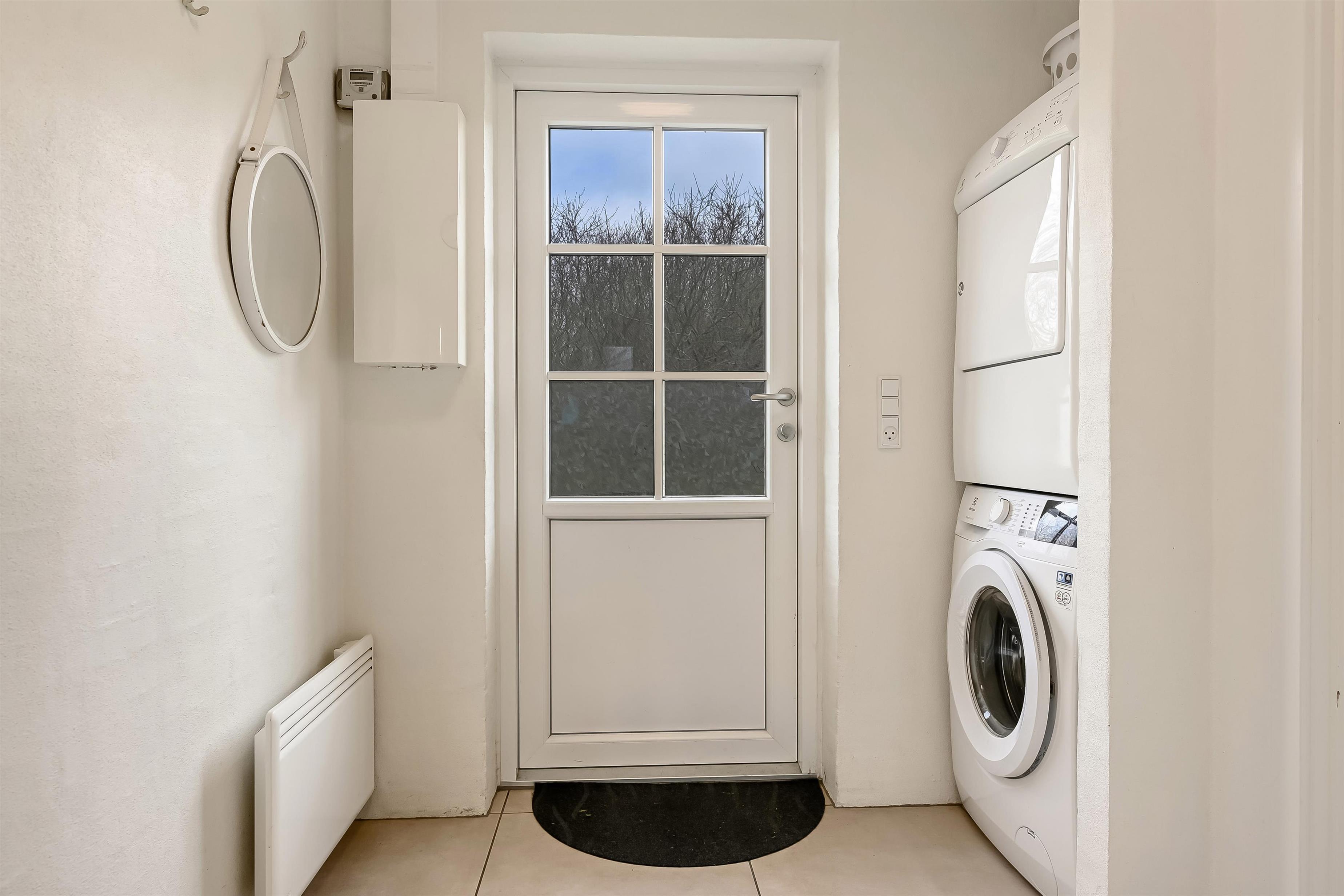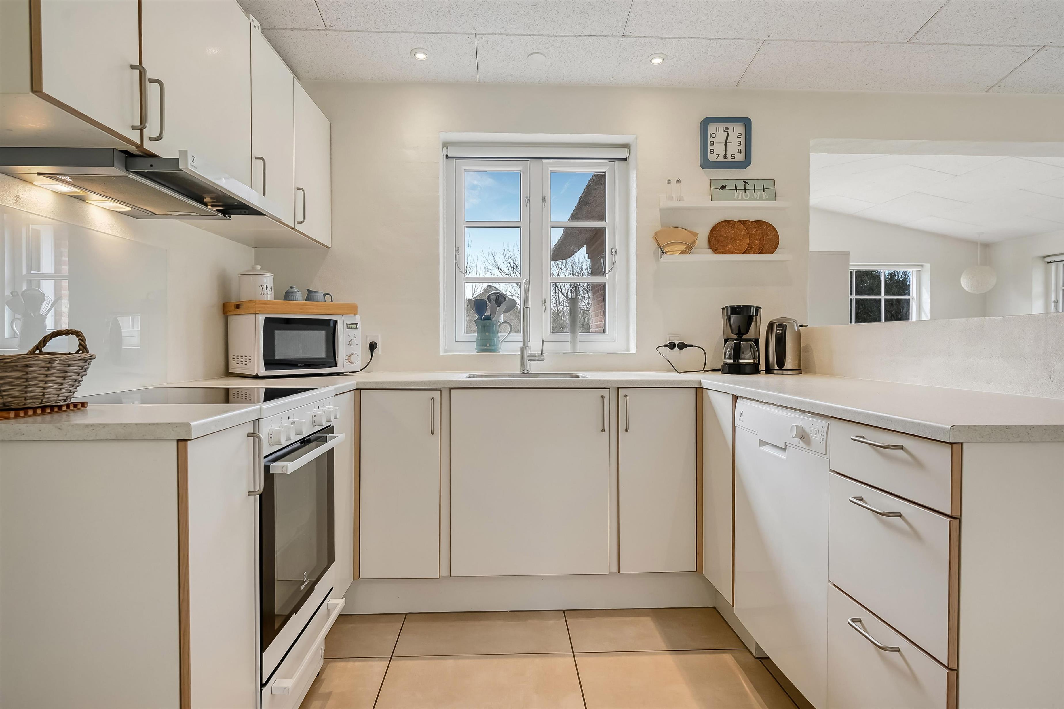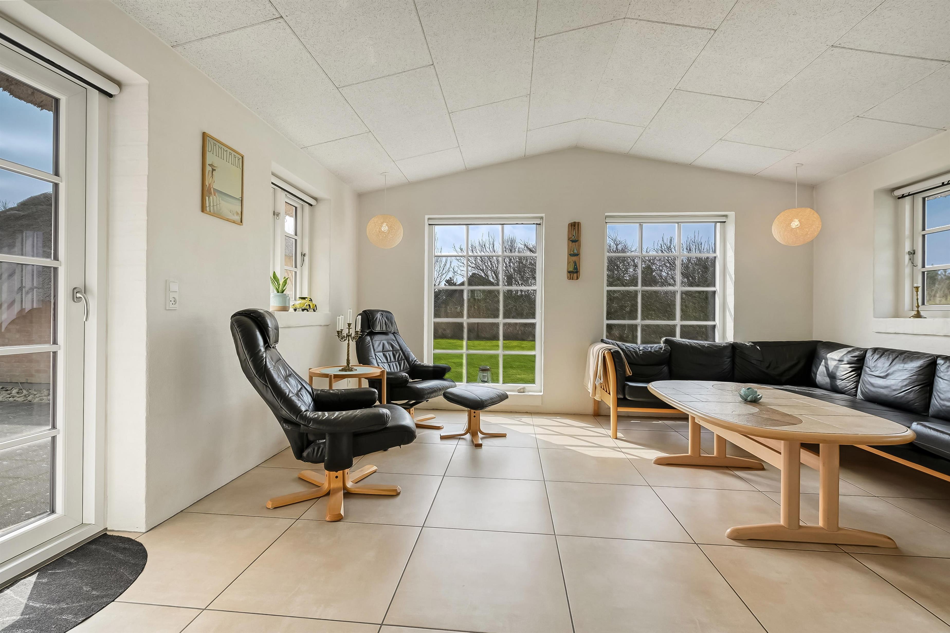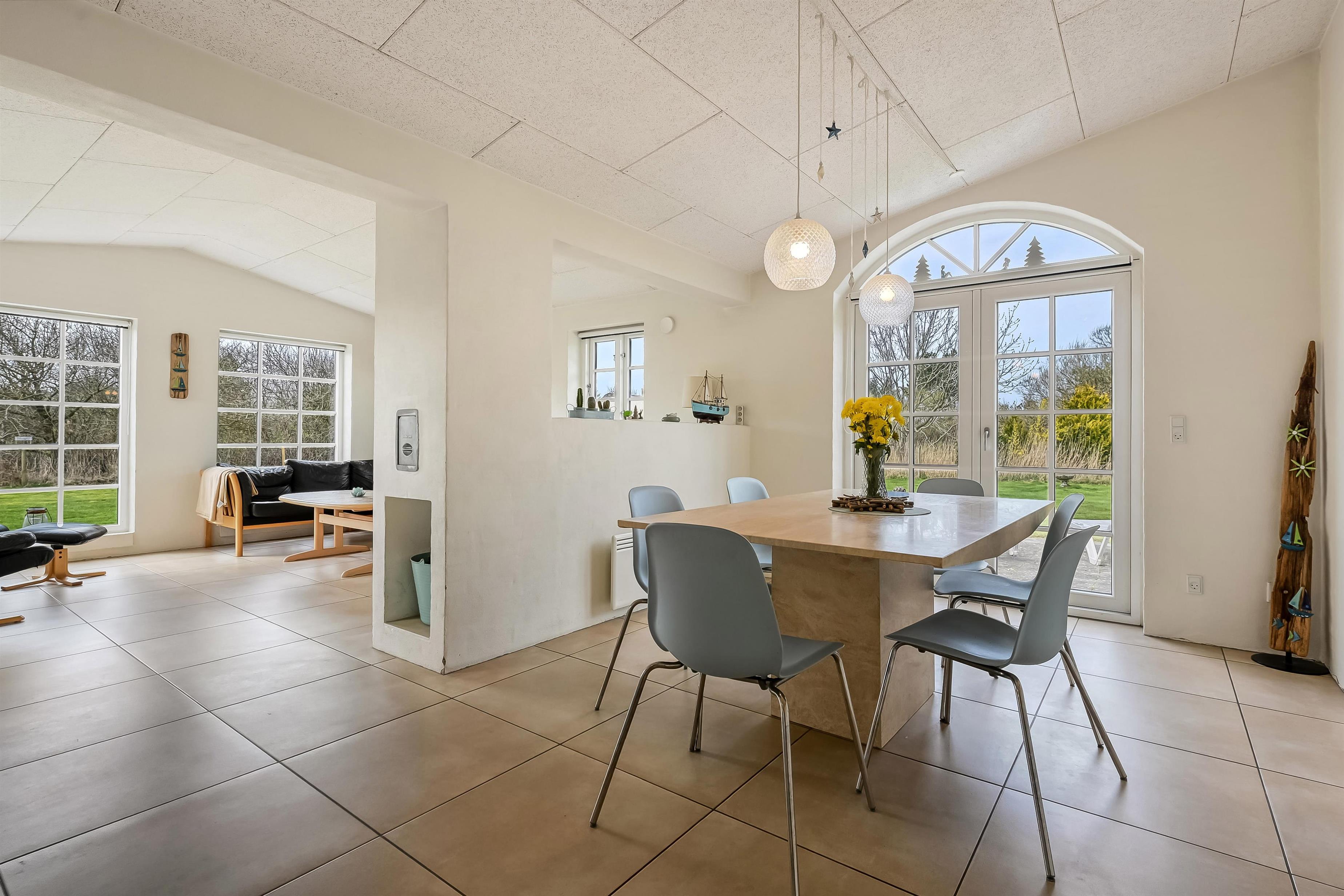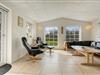 Det lyse opholdsrum med brændeovn og gulvvarme indbyder til hyggelige stunder året rundt – uanset vejret udenfor.