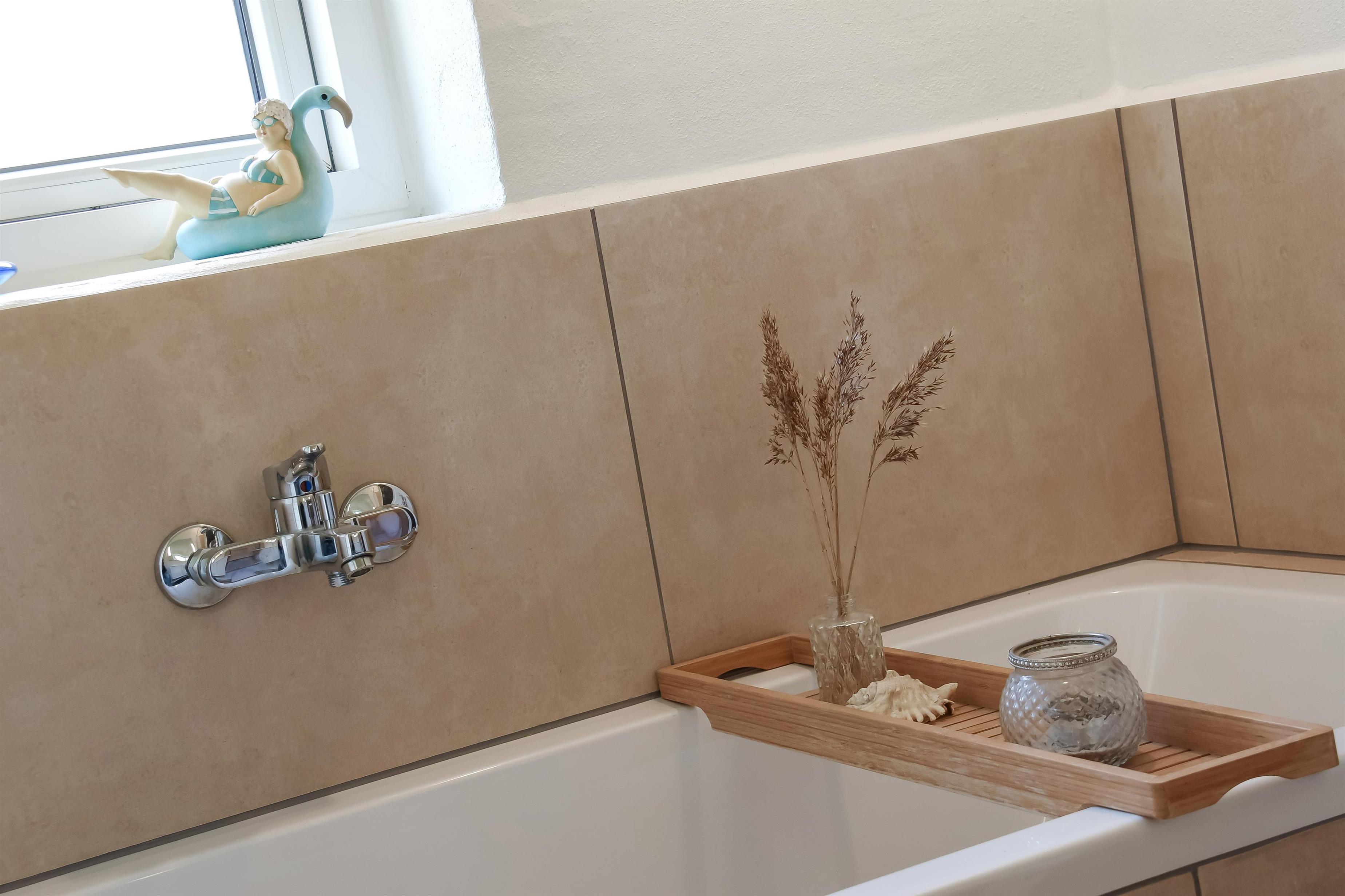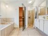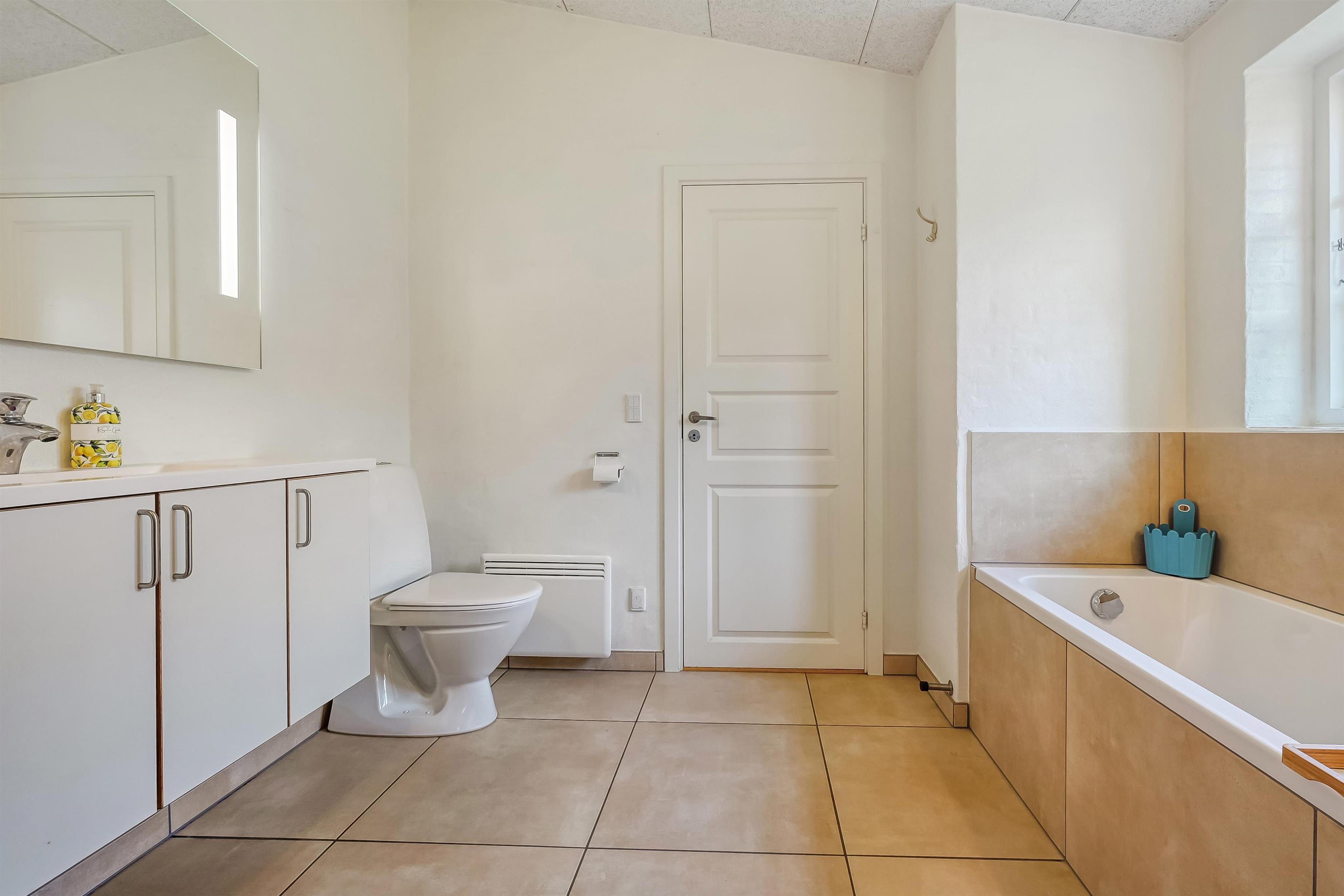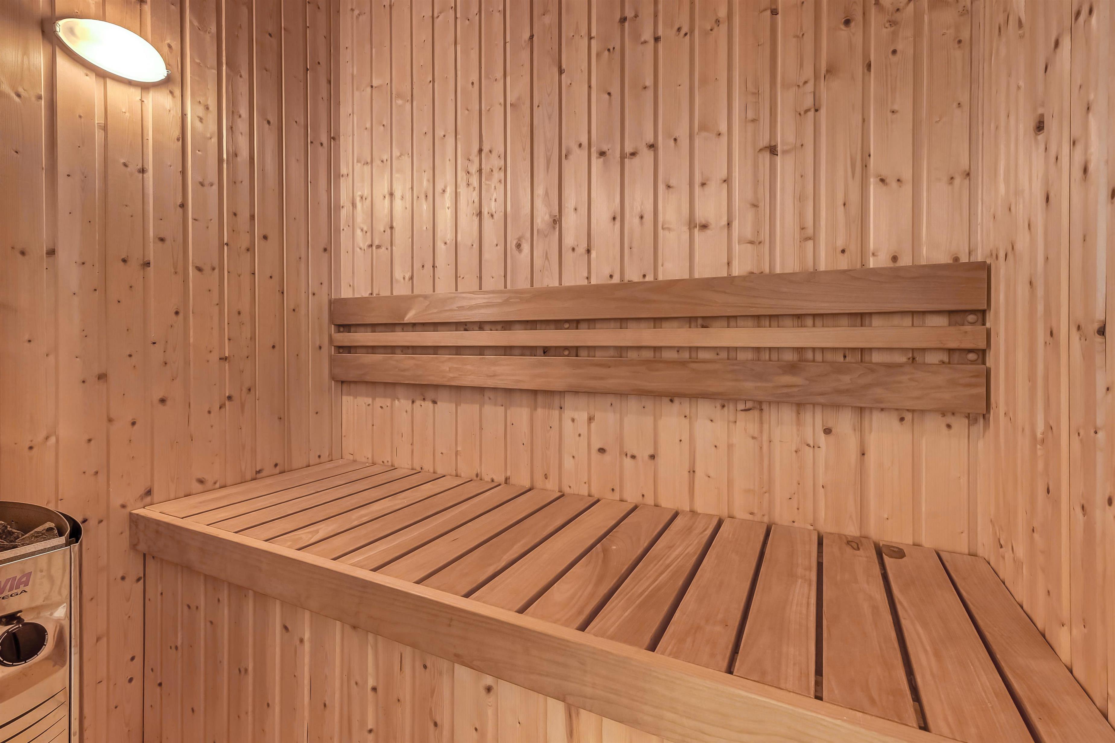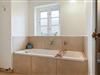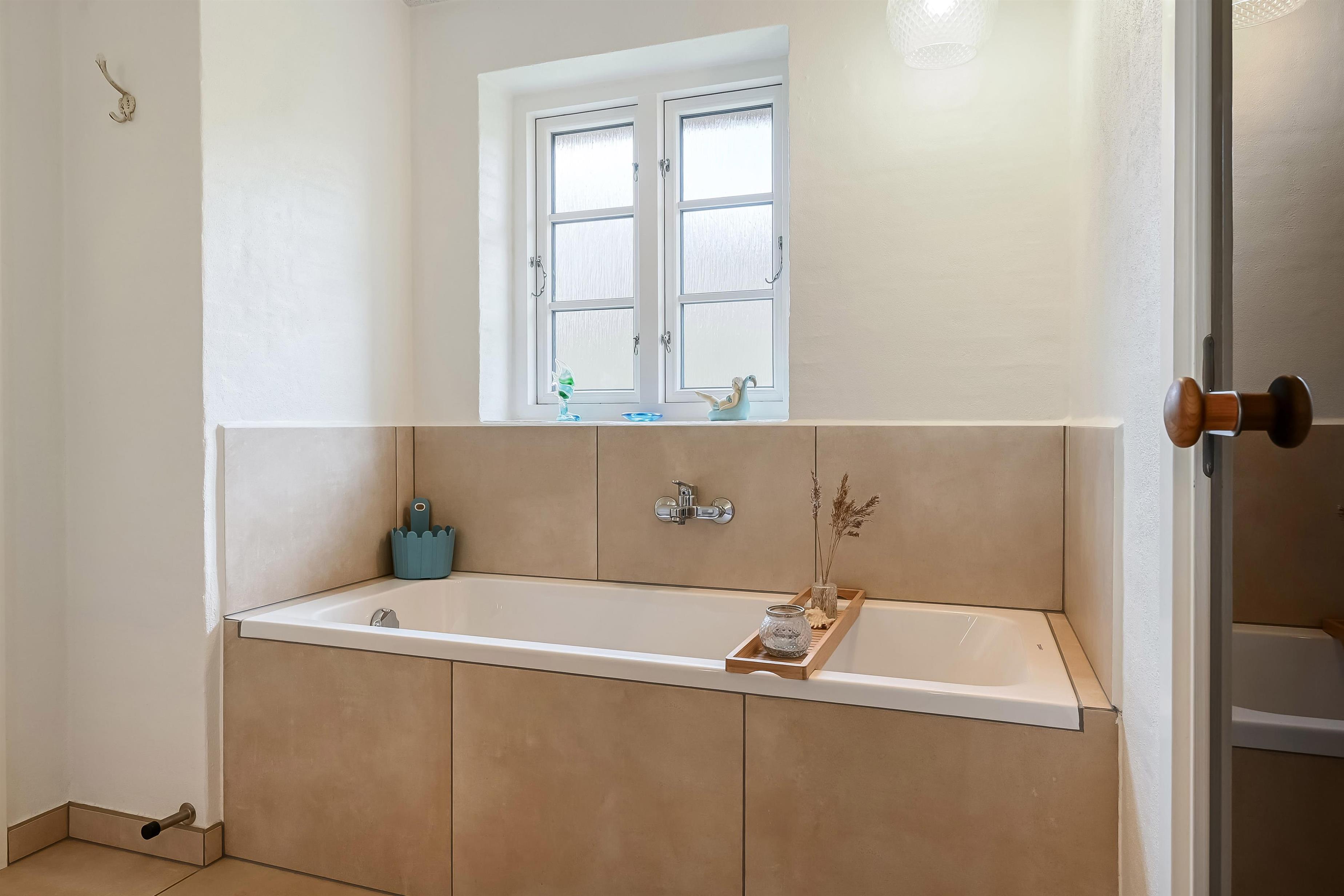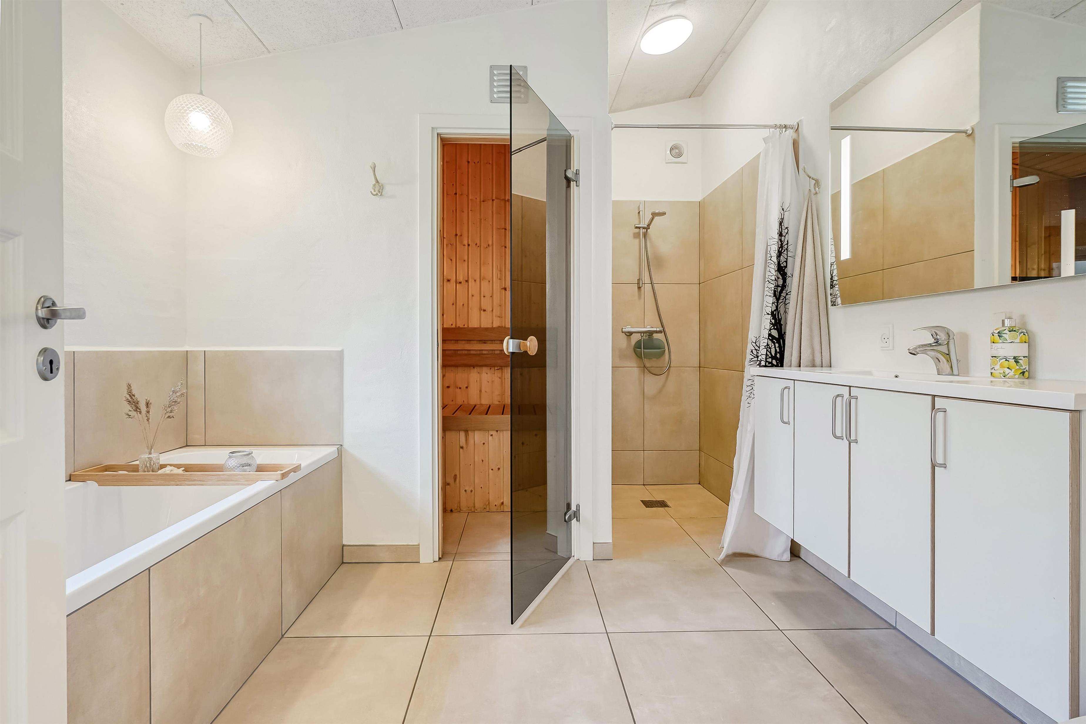Lyst badeværelse med sauna, badekar, gulvvarme og stor bruseniche