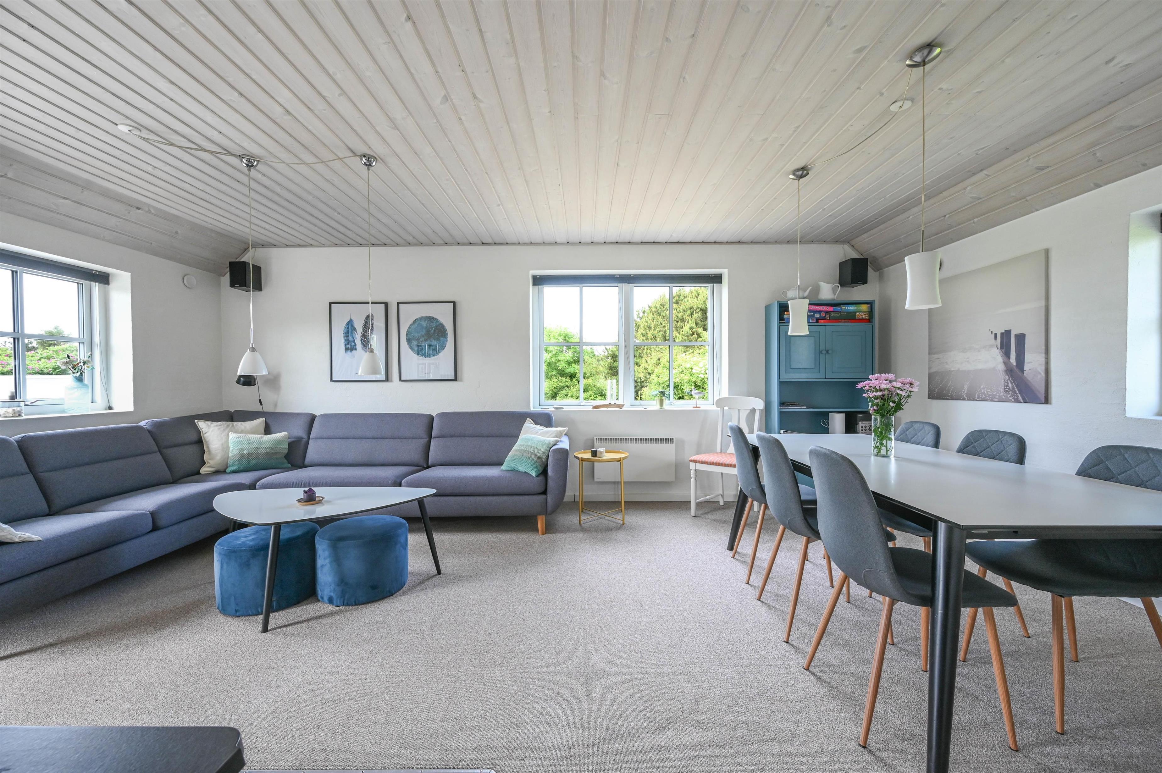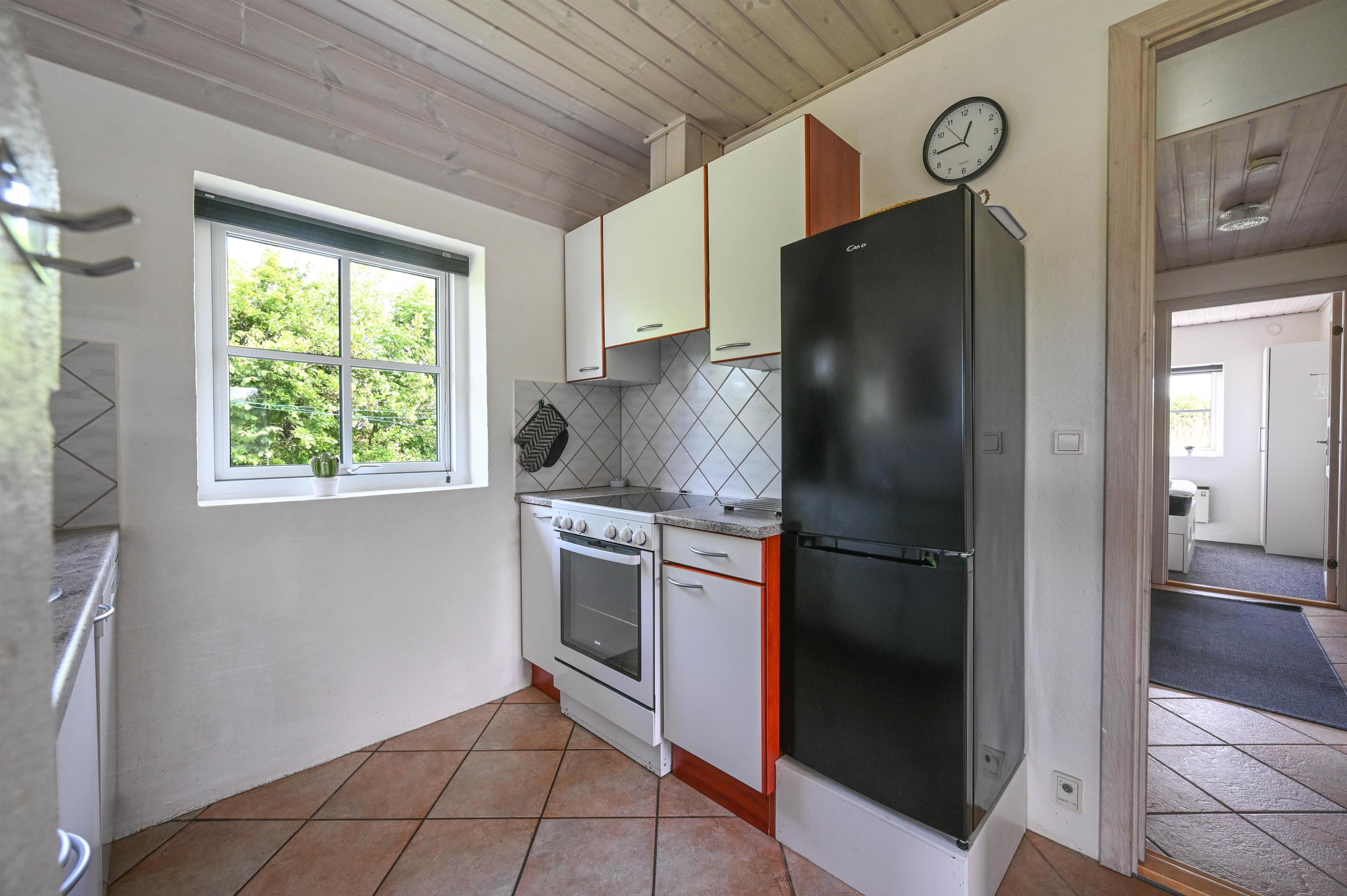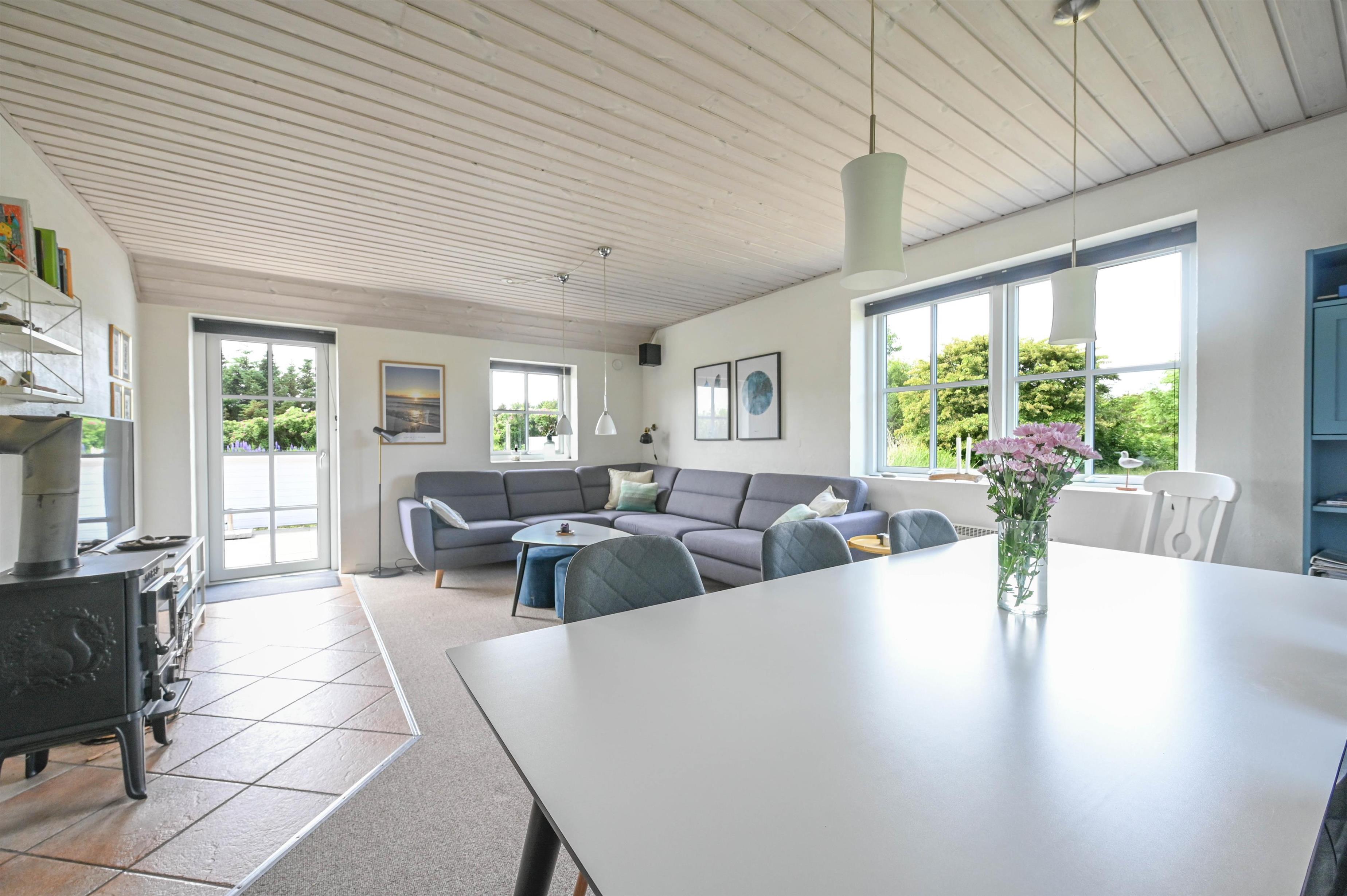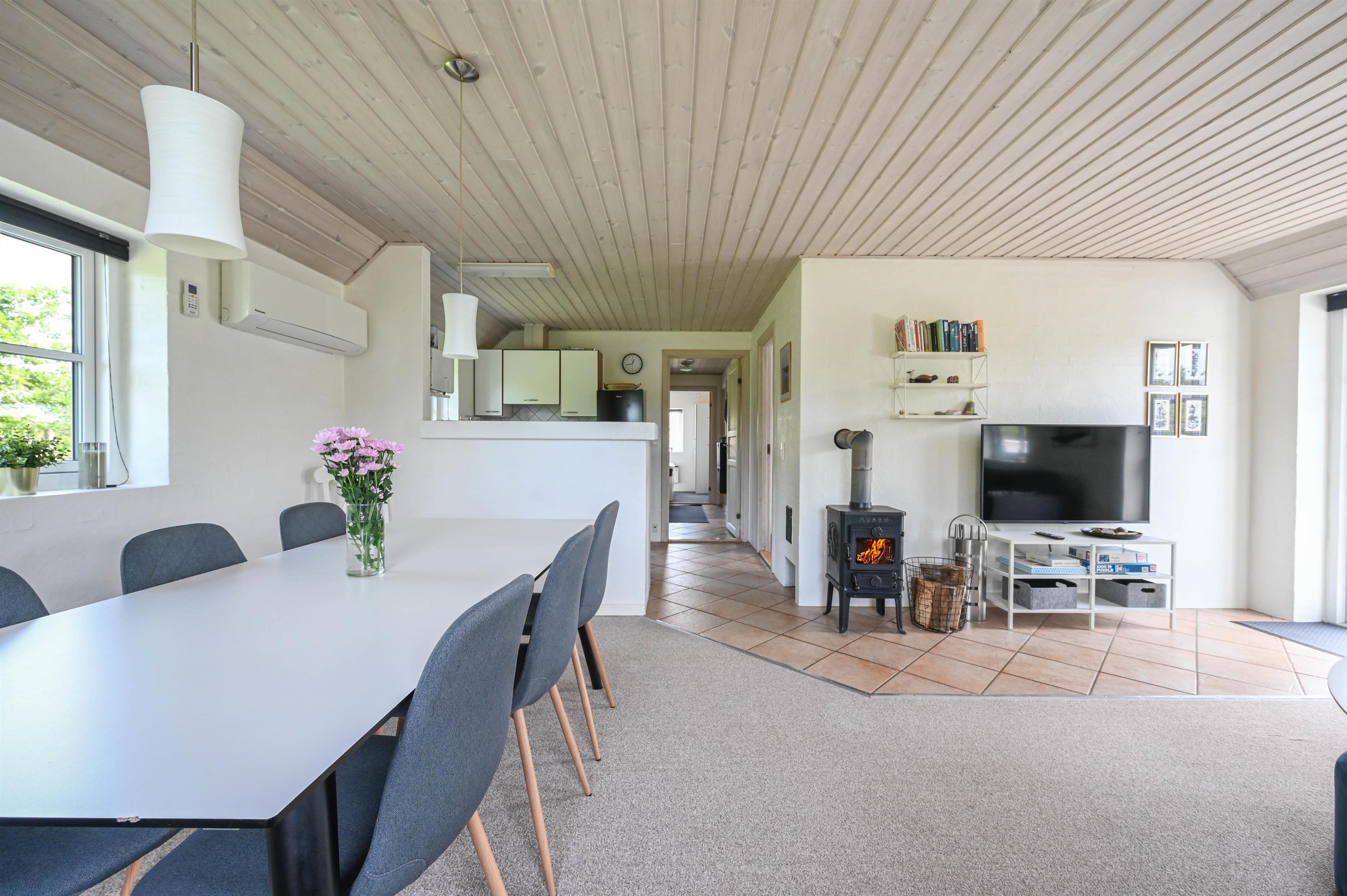 Det veludstyrede køkken ligger i åben forbindelse med stuen, hvor en hjørnesofa, brændeovn og spiseplads indbyder til samvær og hyggelige aftener.