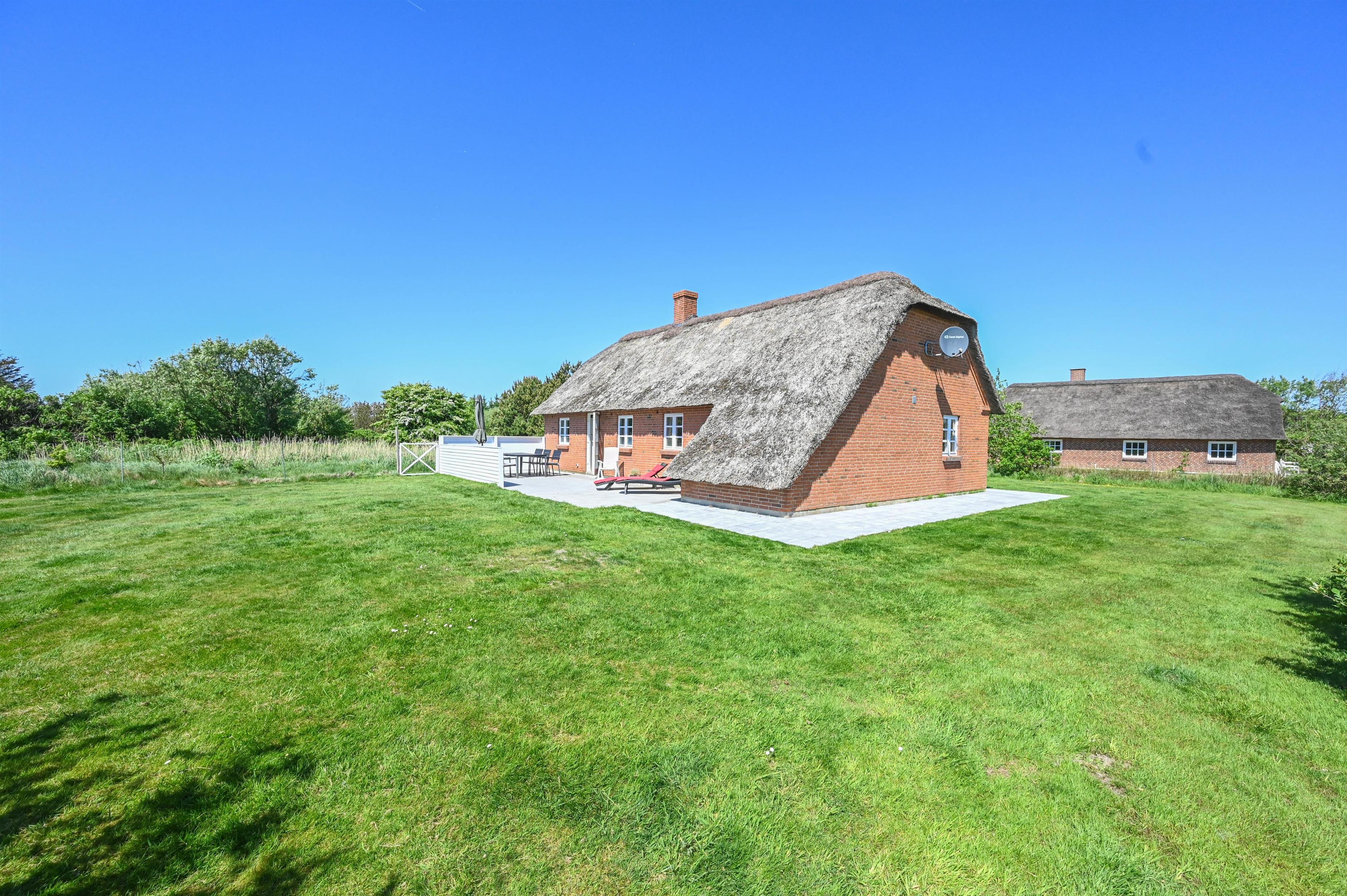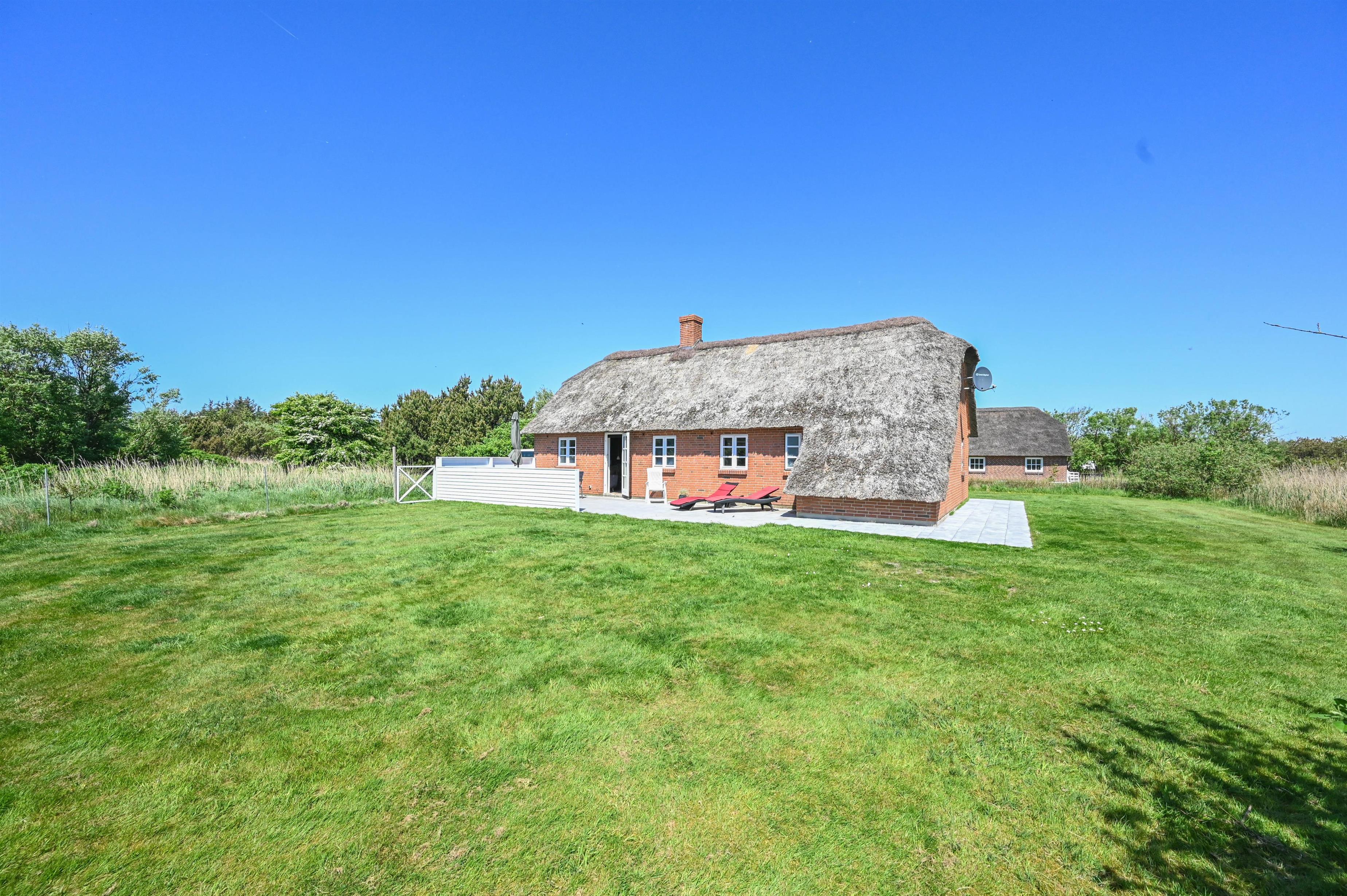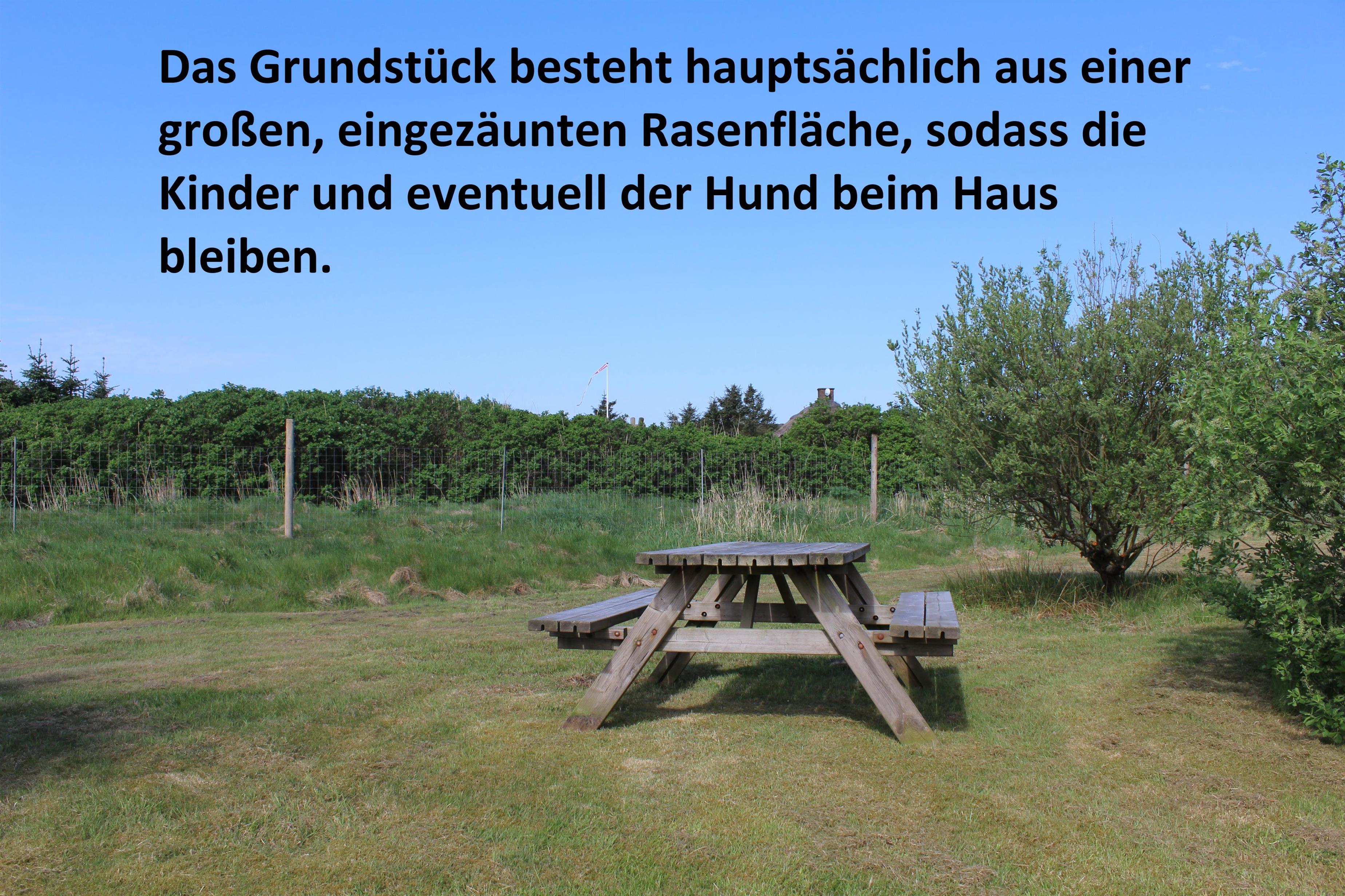 Huset ligger på en dejlig, helt indhegnet grund, hvor både børn og hunde trygt kan lege og nyde ferien. Den ugenert have og den sydvendte terrasse med gode læforhold danner de ideelle rammer for afslapning, solbadning eller en rolig stund med en kop kaffe og fuglesang i baggrunden.