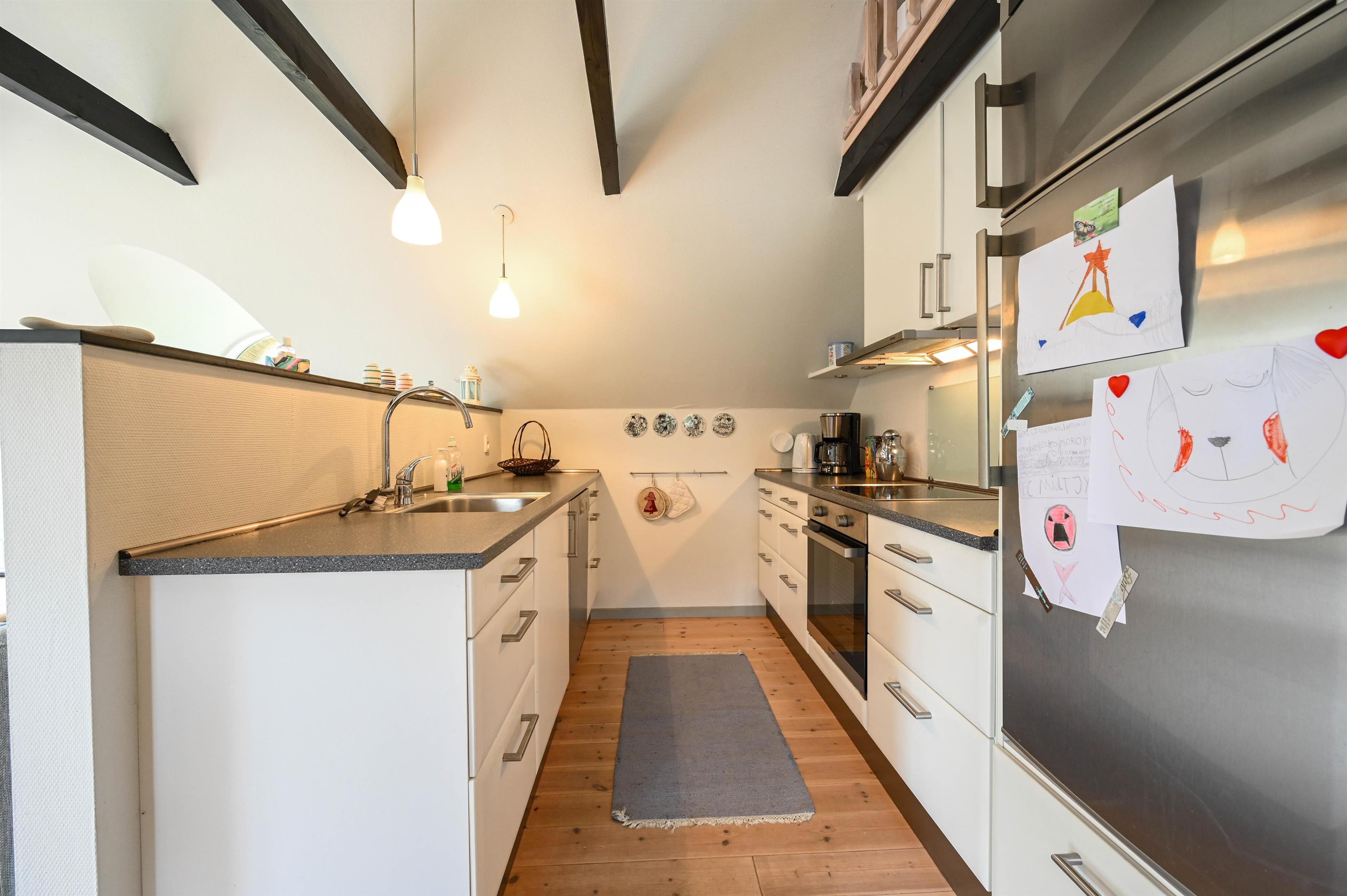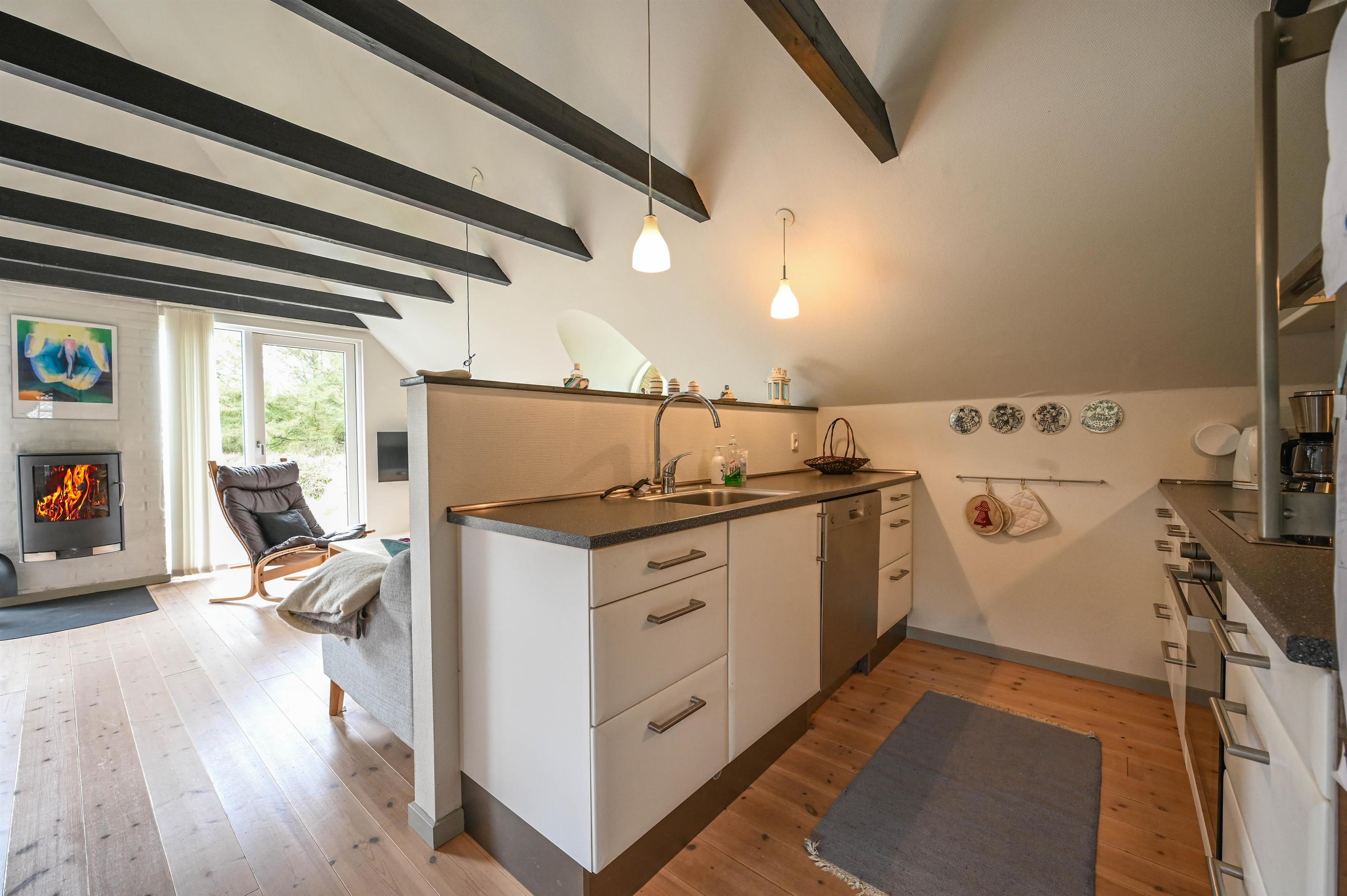 Pænt, lyst køkken i åben forbindelse med stuen