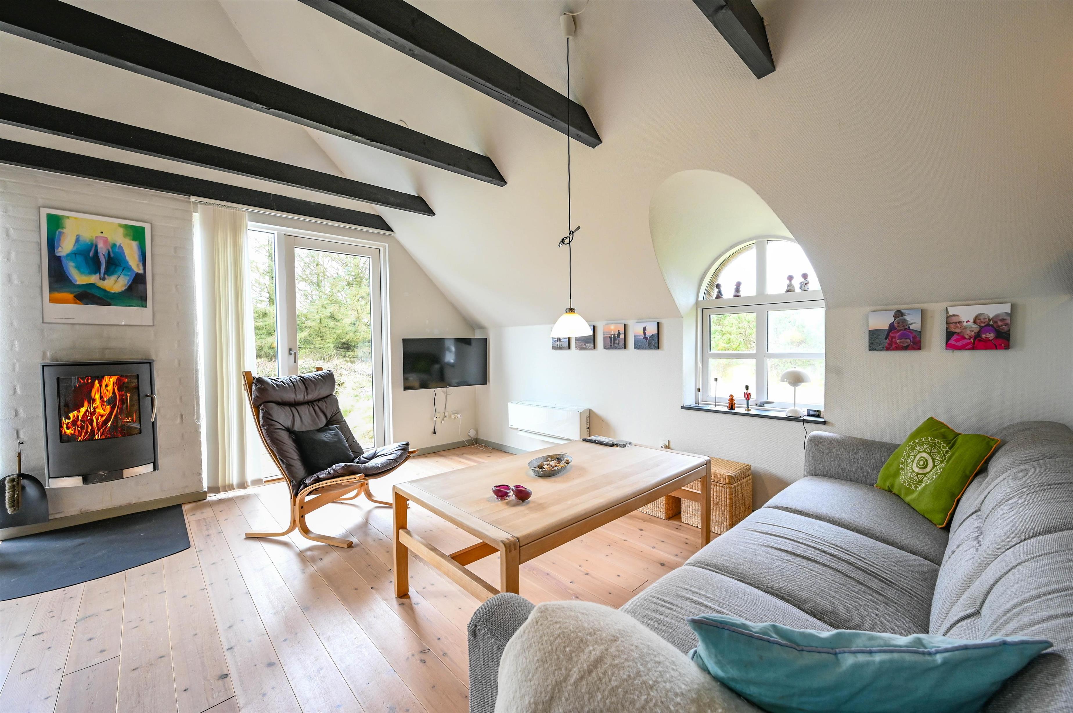 Stue med brændeovn, varmepumpe, sofaområde og udgang til sydvendt terrasse