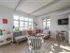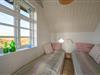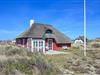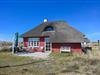 Huset fremstår i sin oprindelige stil med pudset facade, sprossede vinduer og et smukt stråtag, der passer perfekt ind i det klassiske klitlandskab.