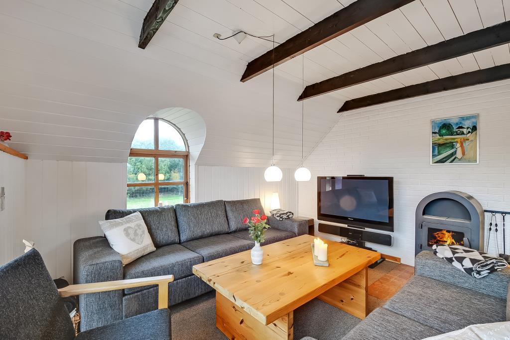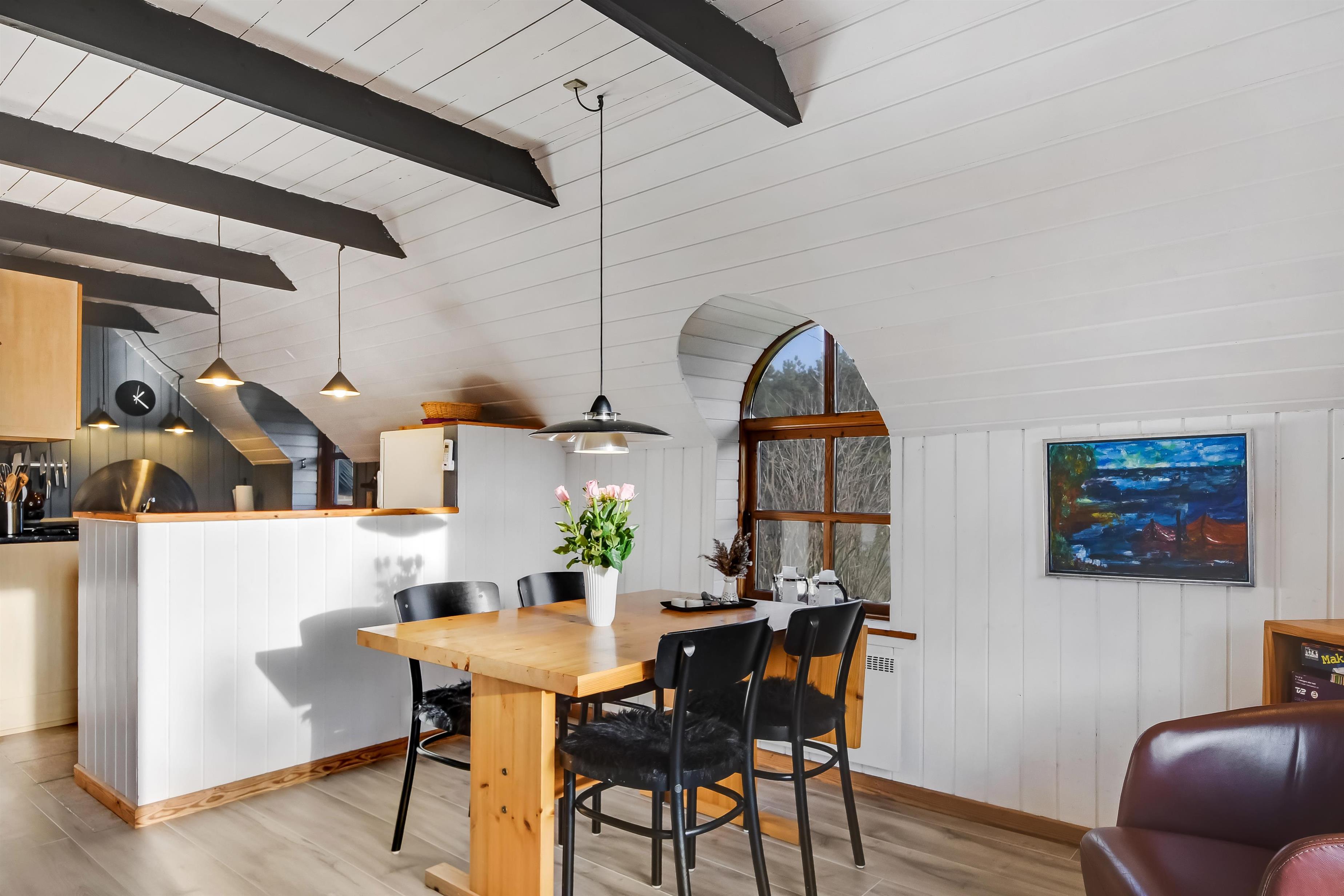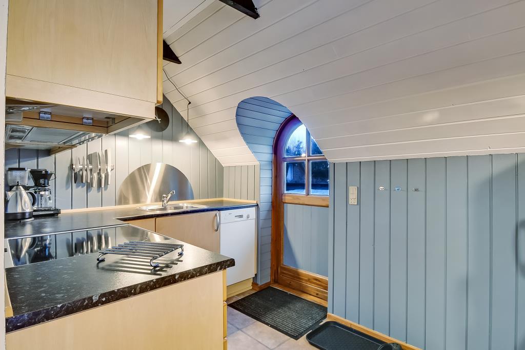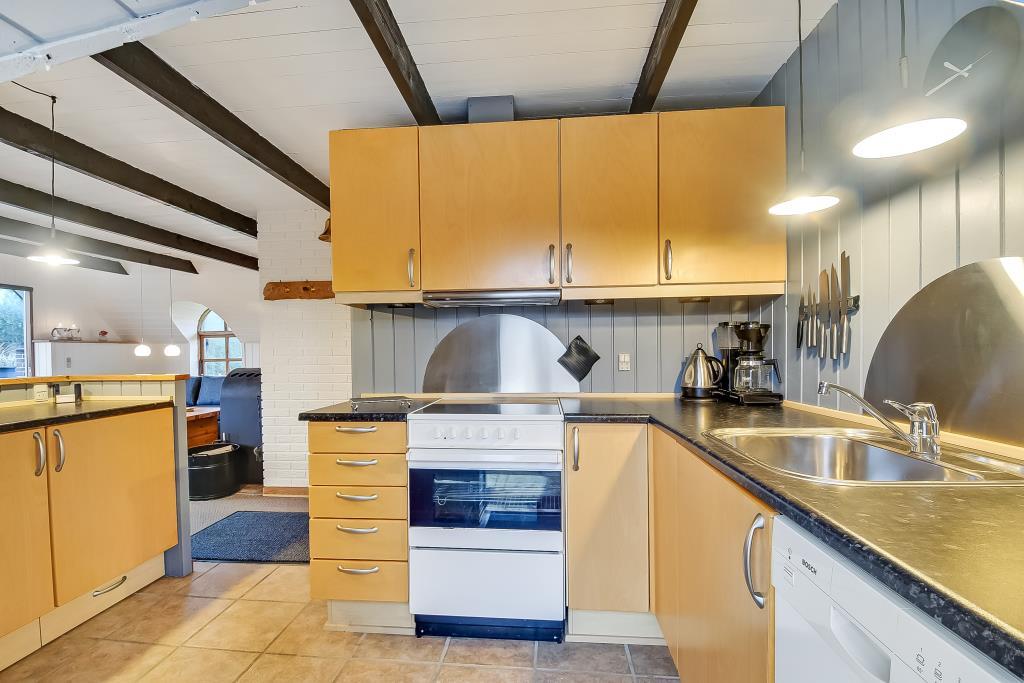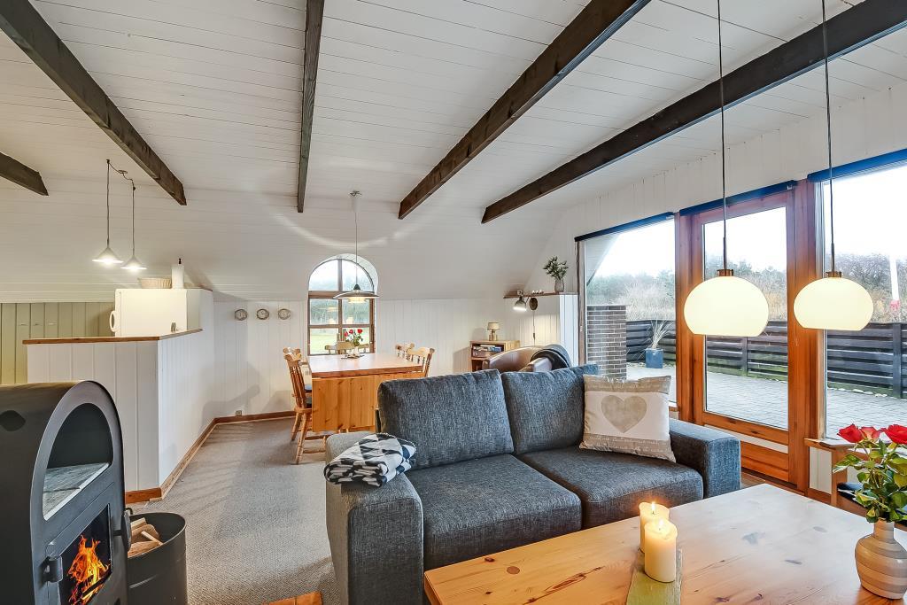 Det kombinerede køkken og stueområde er husets naturlige samlingspunkt, hvor man kan lave mad, hygge sig foran brændeovnen og nyde ferien i et afslappet tempo.