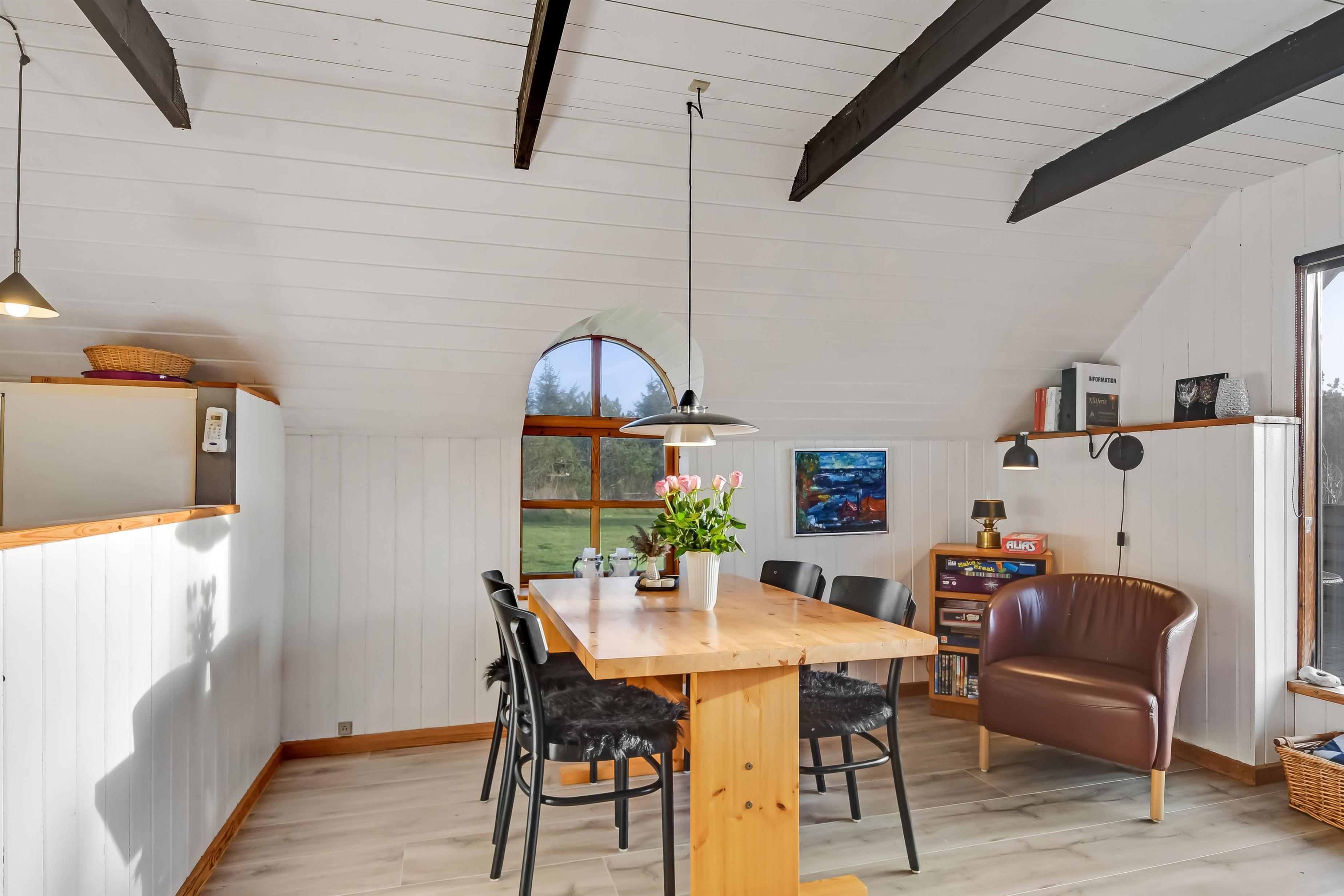 Fra stuen er der udgang til en sydvendt, delvist overdækket terrasse, hvor solen kan nydes fra morgen til aften – med udsigt til haven og lyden af naturen omkring jer.