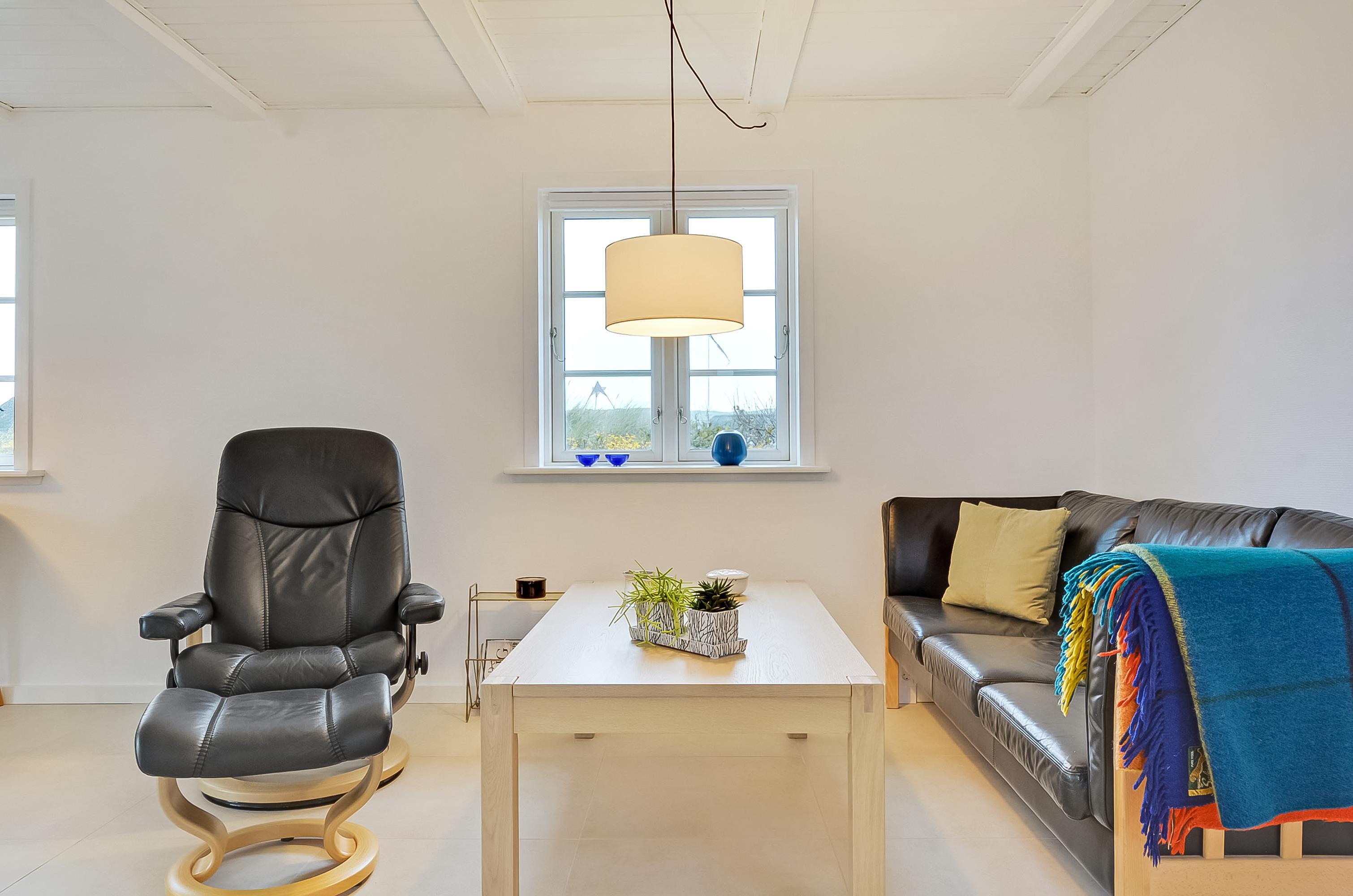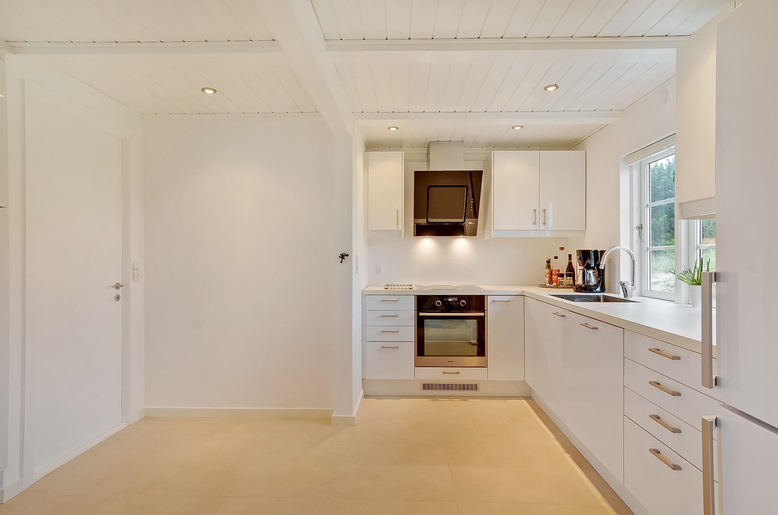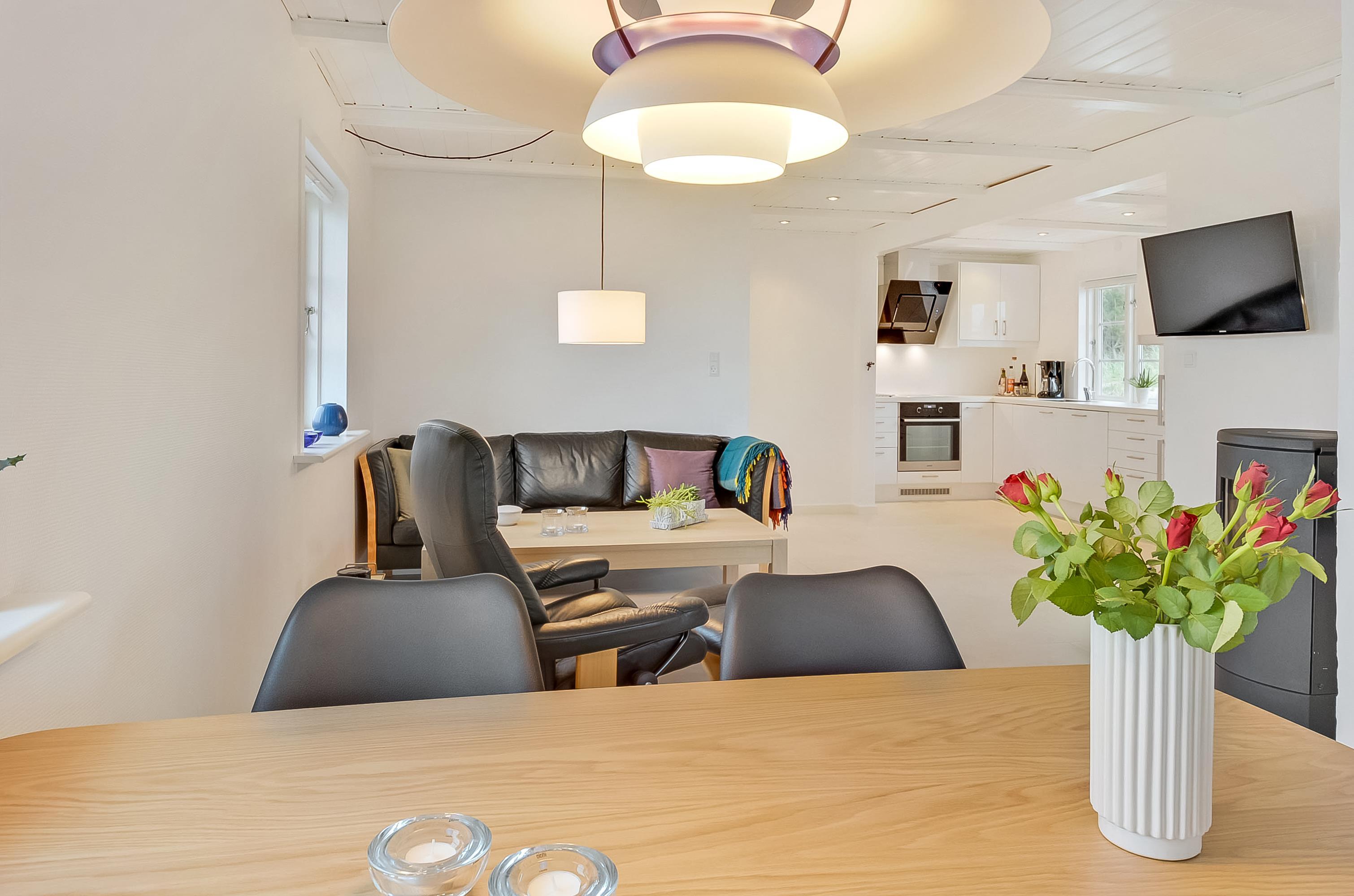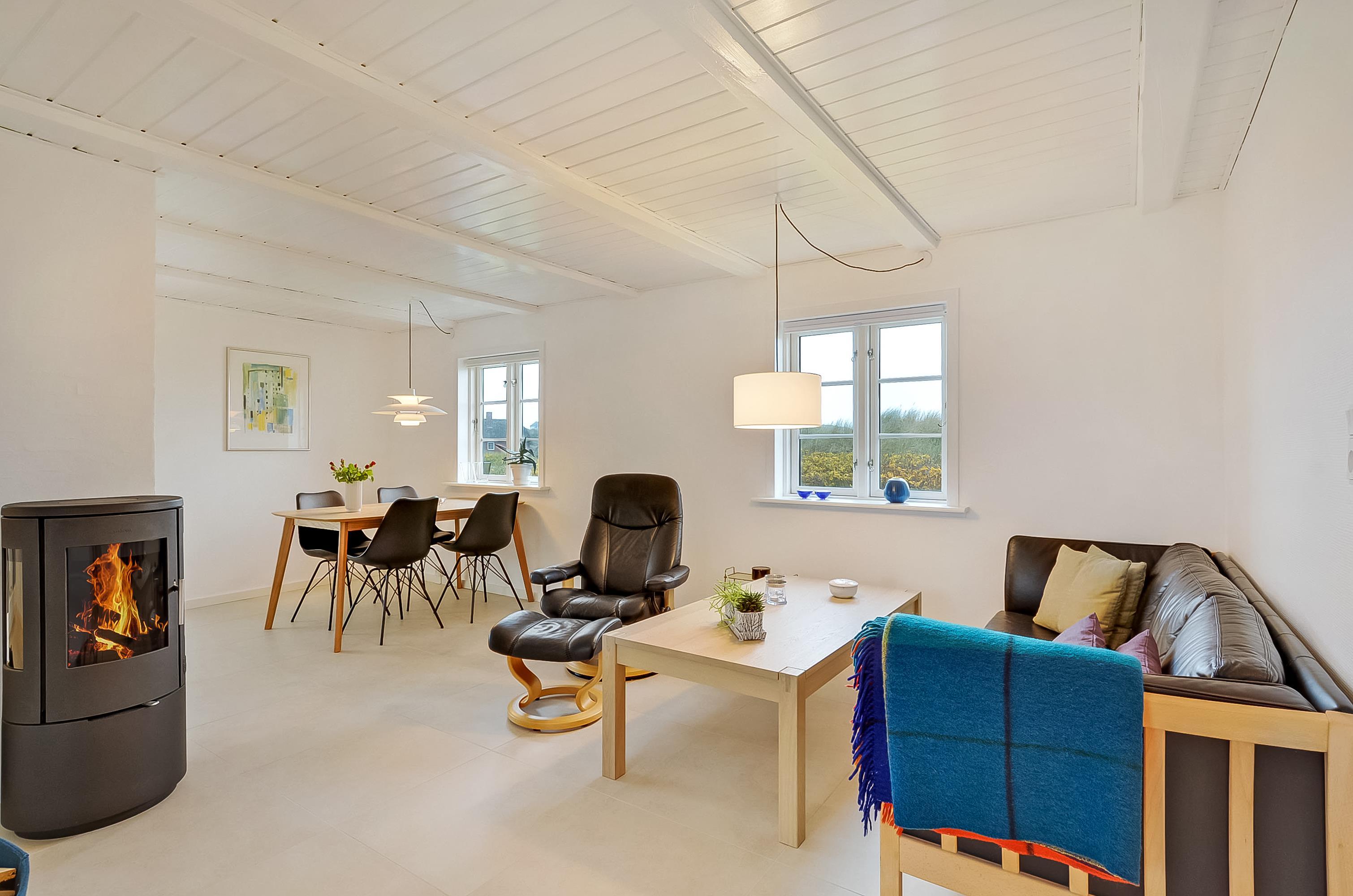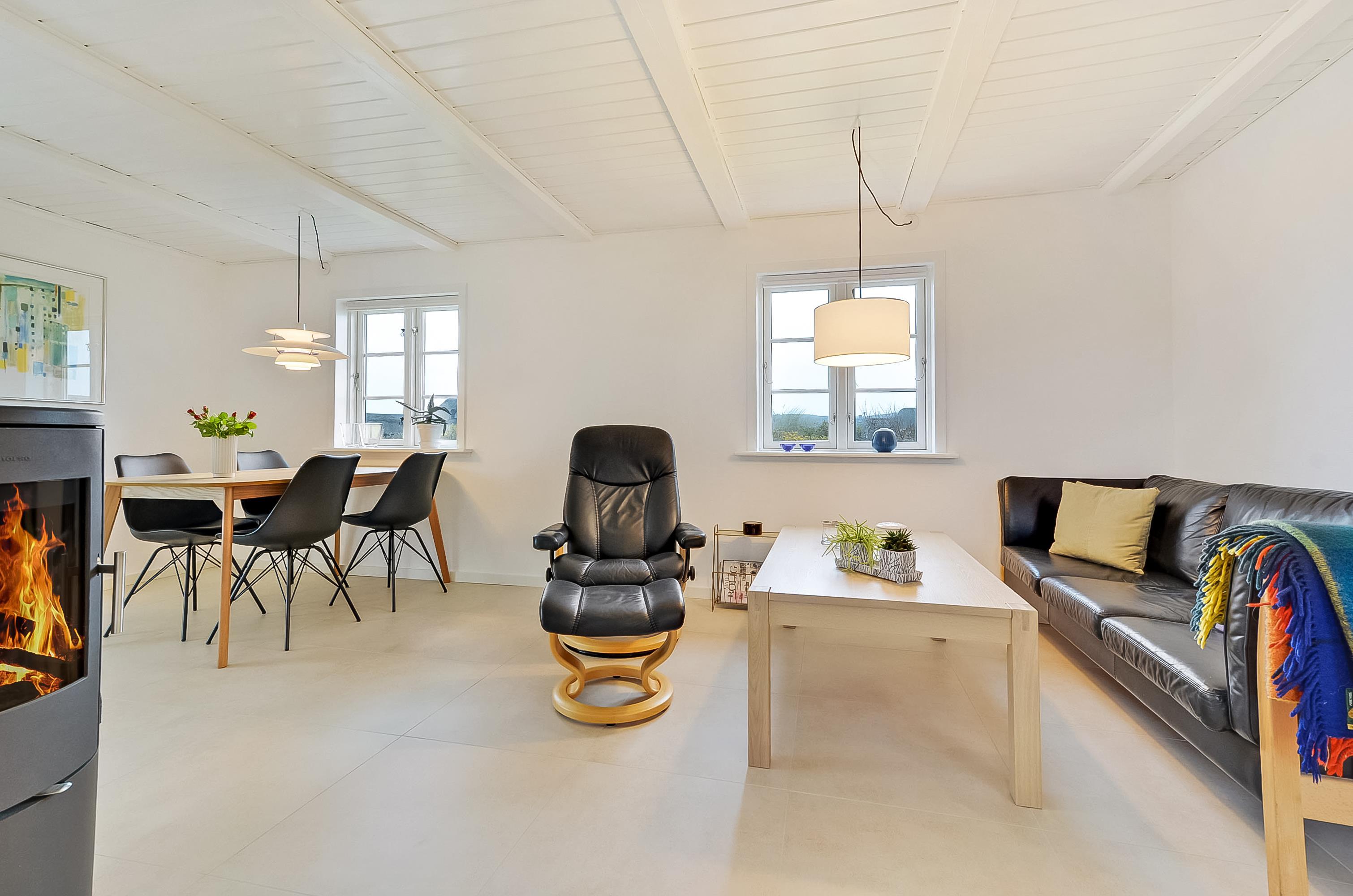Indenfor mødes du af en lys og venlig atmosfære. Det åbne køkken er moderne indrettet og hænger naturligt sammen med stuen og spiseområdet. Her kan du slappe af i sofaområdet, nyde varmen fra brændeovnen og opleve ægte hygge. Fra stuen er der udgang til en delvist overdækket terrasse vendt mod sydvest, hvor du kan sidde i læ, nyde solen og den friske havluft – helt uforstyrret.