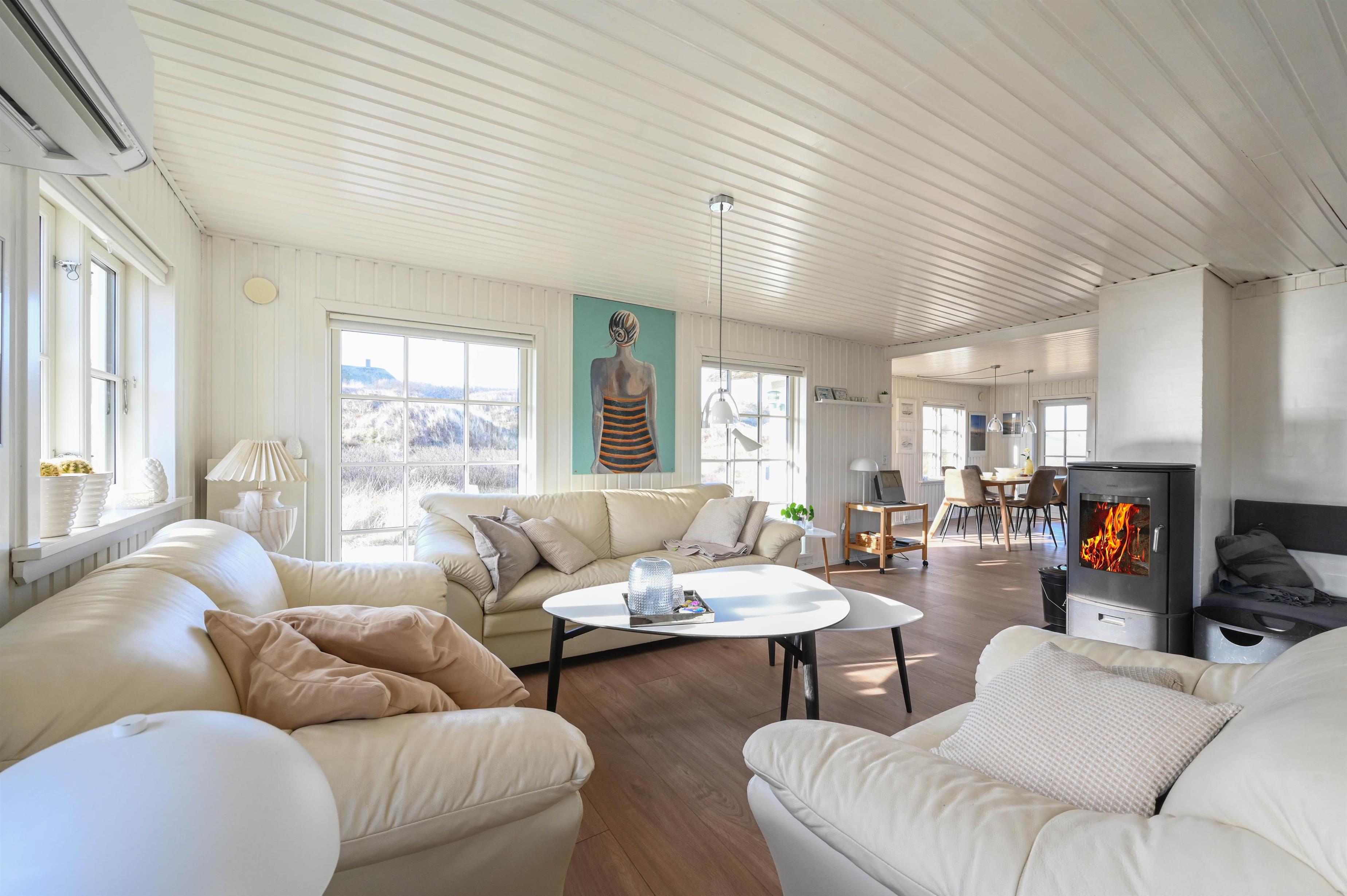 Hyggeligt feriehus nær Vesterhavet med terrasser, brændeovn og moderne faciliteter i Vedersø Klit.