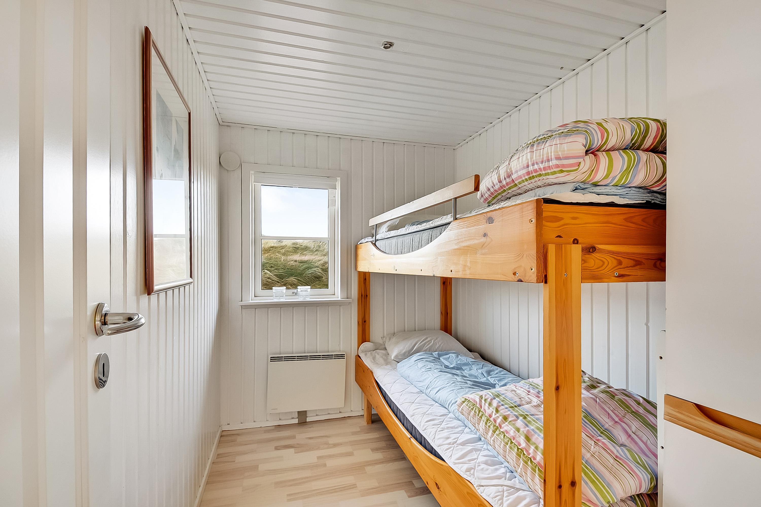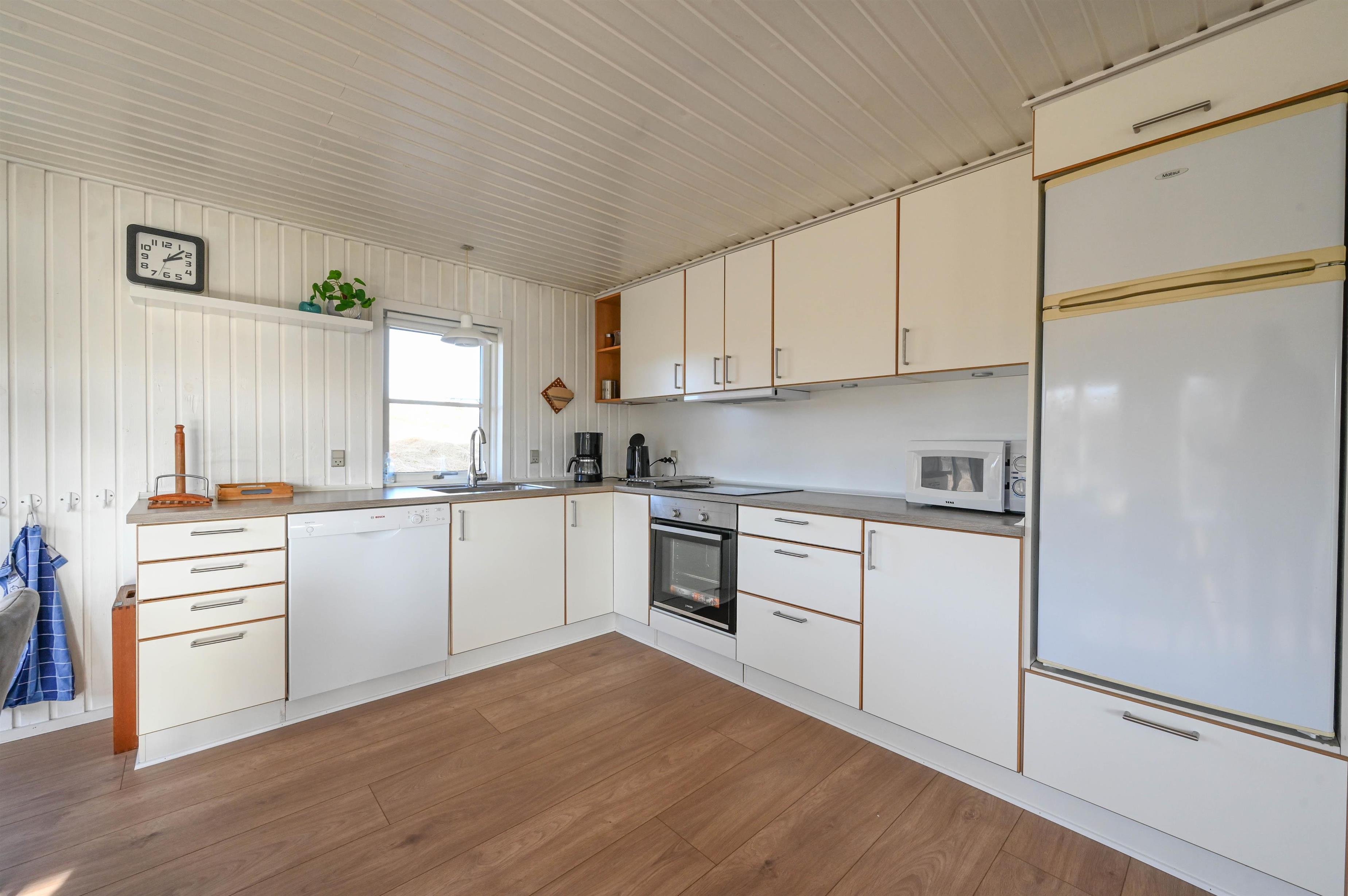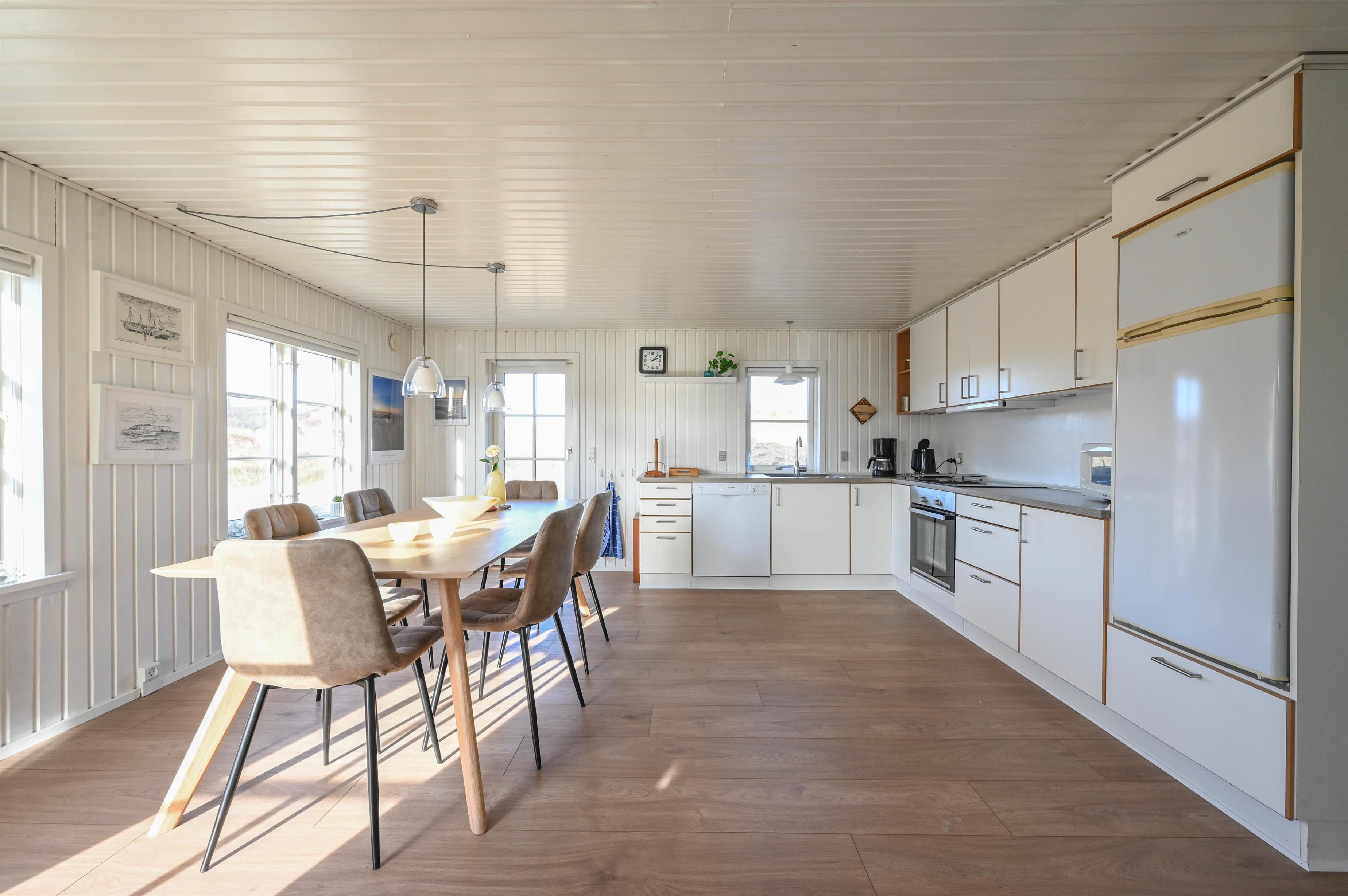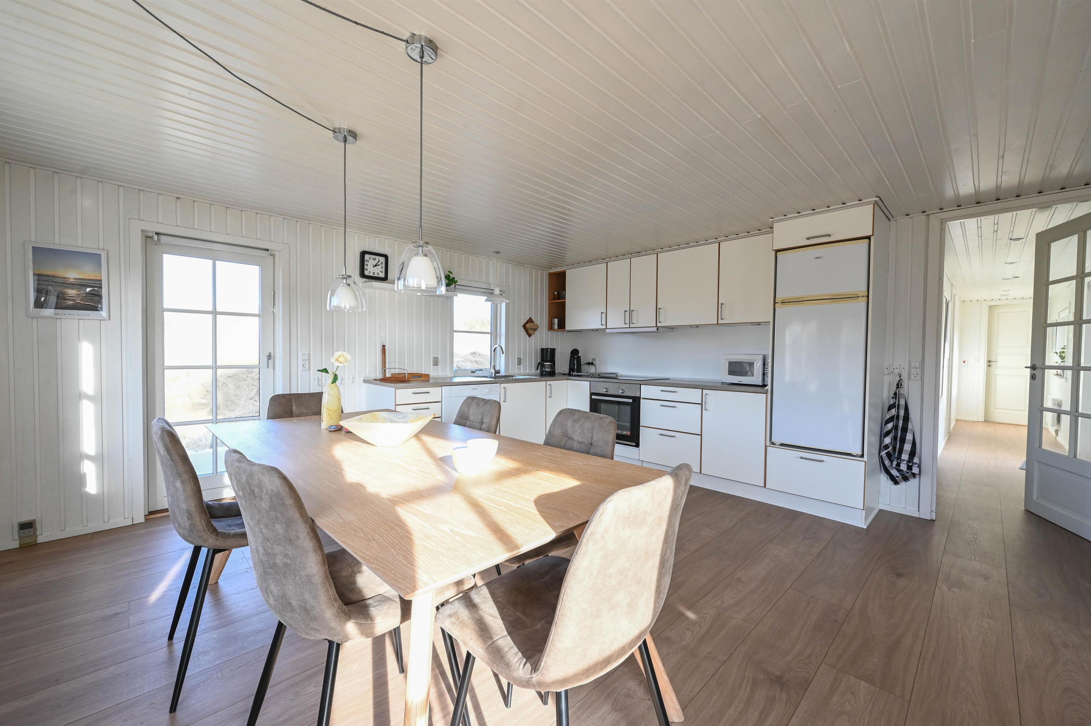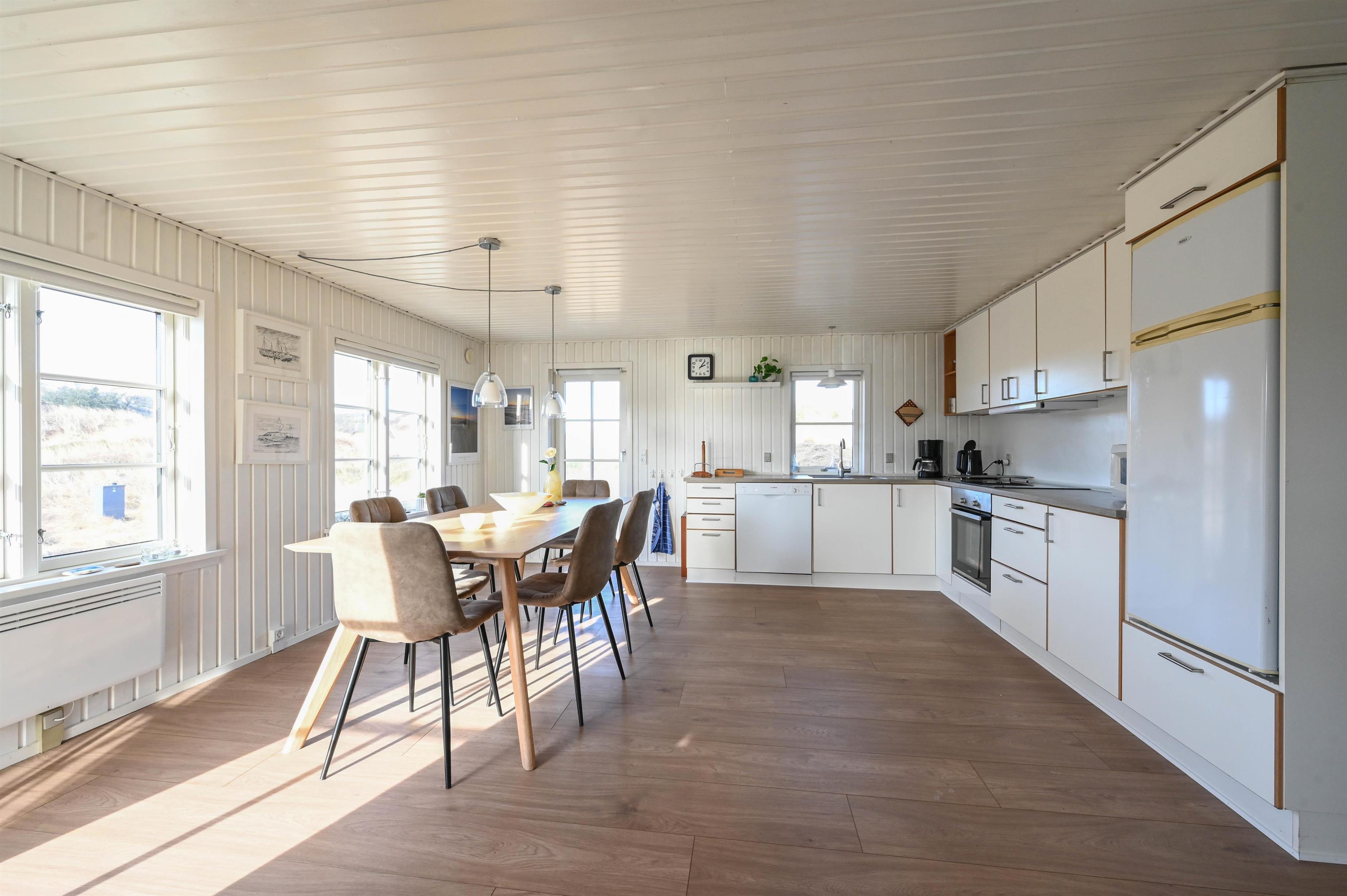 Indretning: Entre som fungerer som fordelingsgang til husets værelser og badeværelse. Fra entreen er der desuden indgang til husets store køkken/alrum, hvorfra der er udgang til terrasse mod vest og udsigt til klitterne. Køkken/alrum ligger i åben forbindelse med stuen, der er hyggeligt indrettet med komfortable møbler og brændeovn.