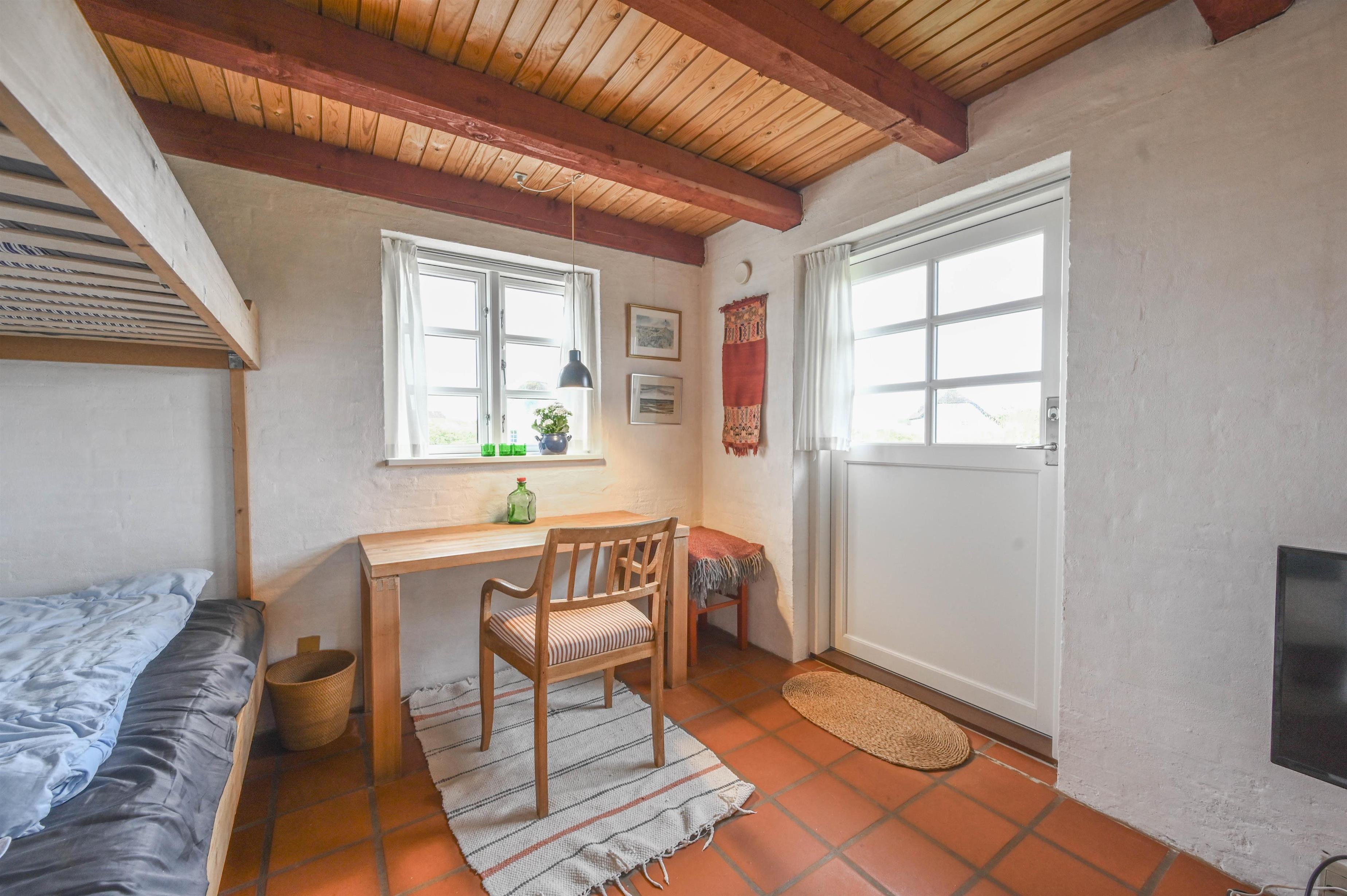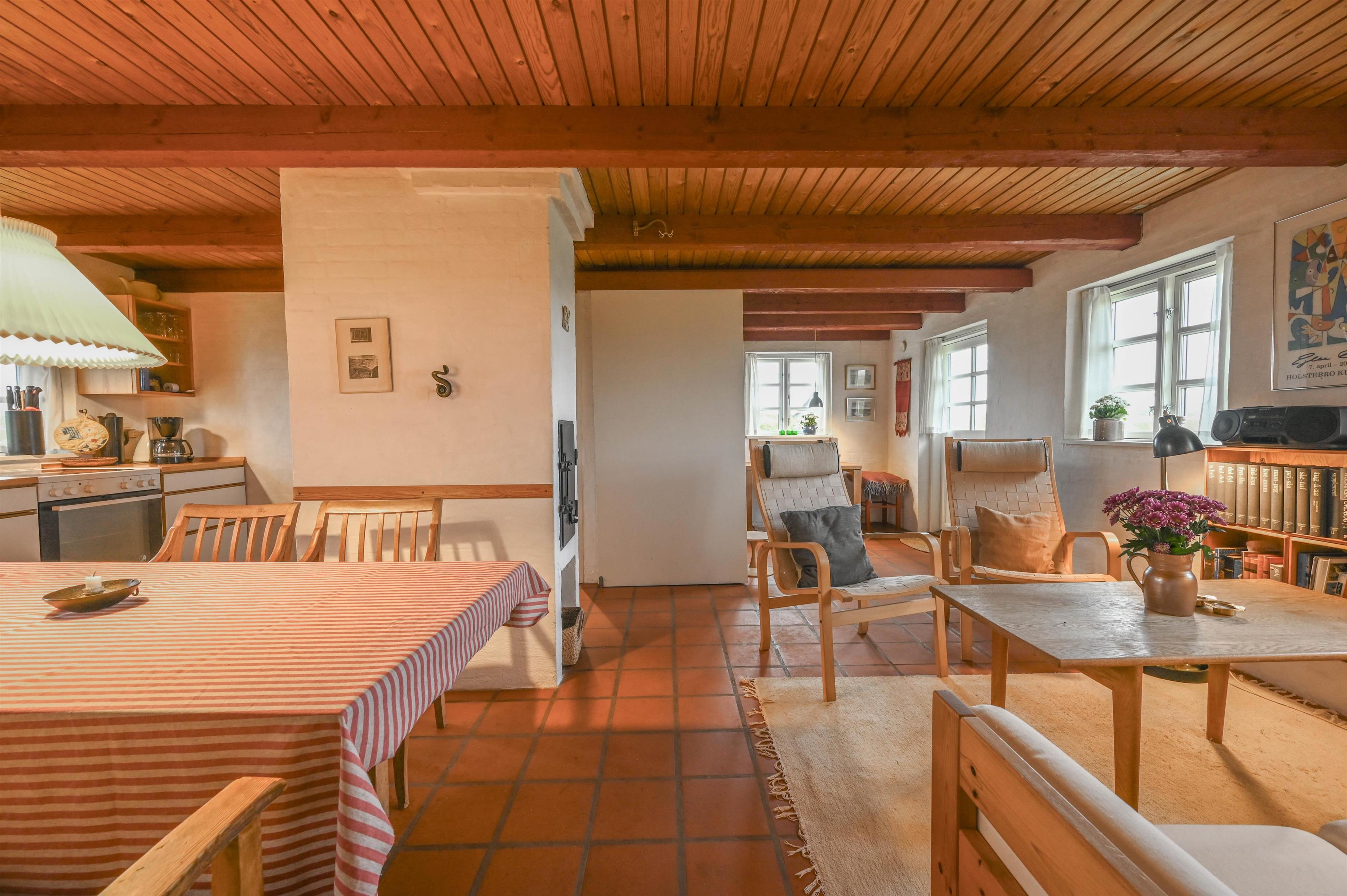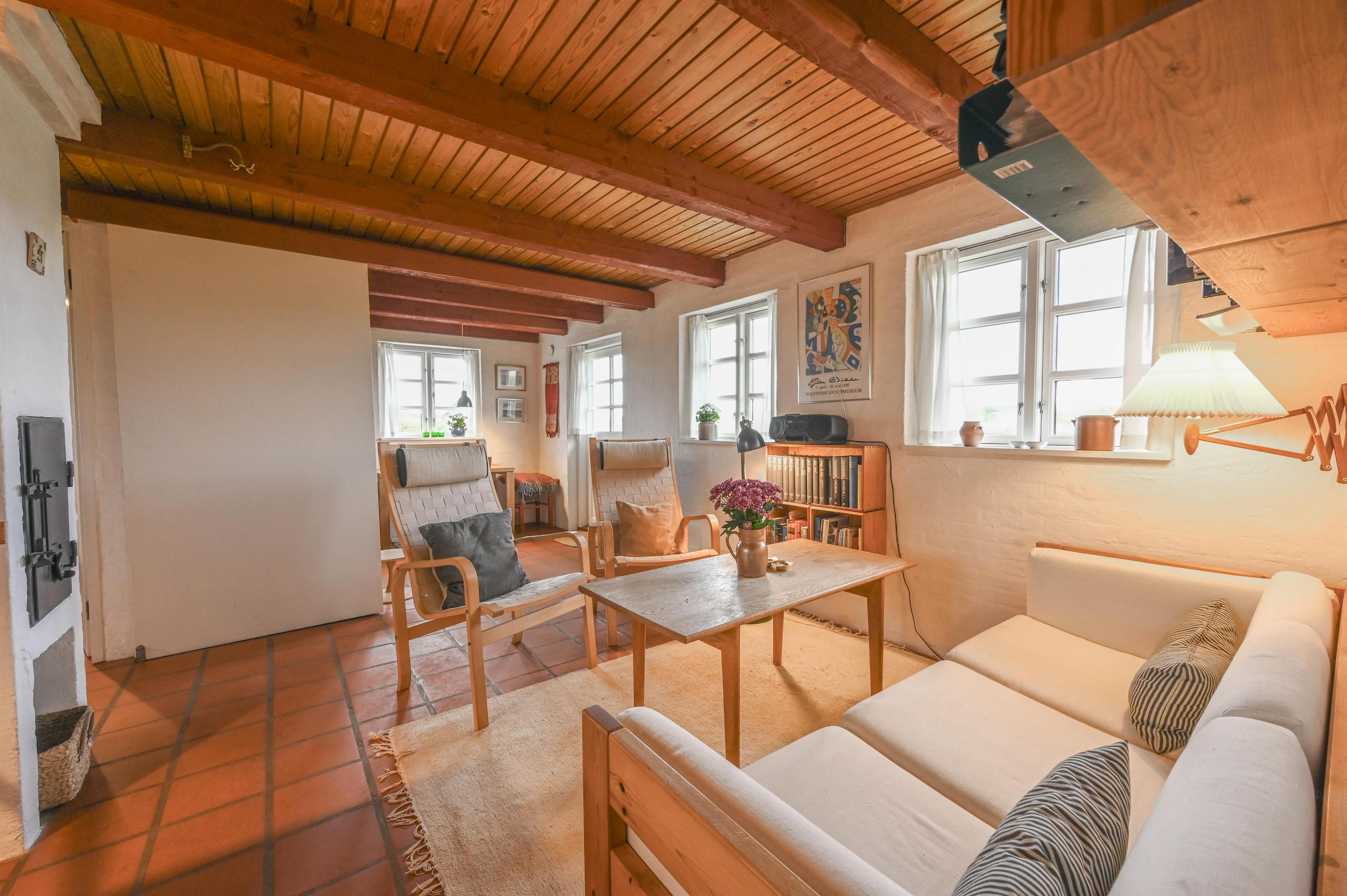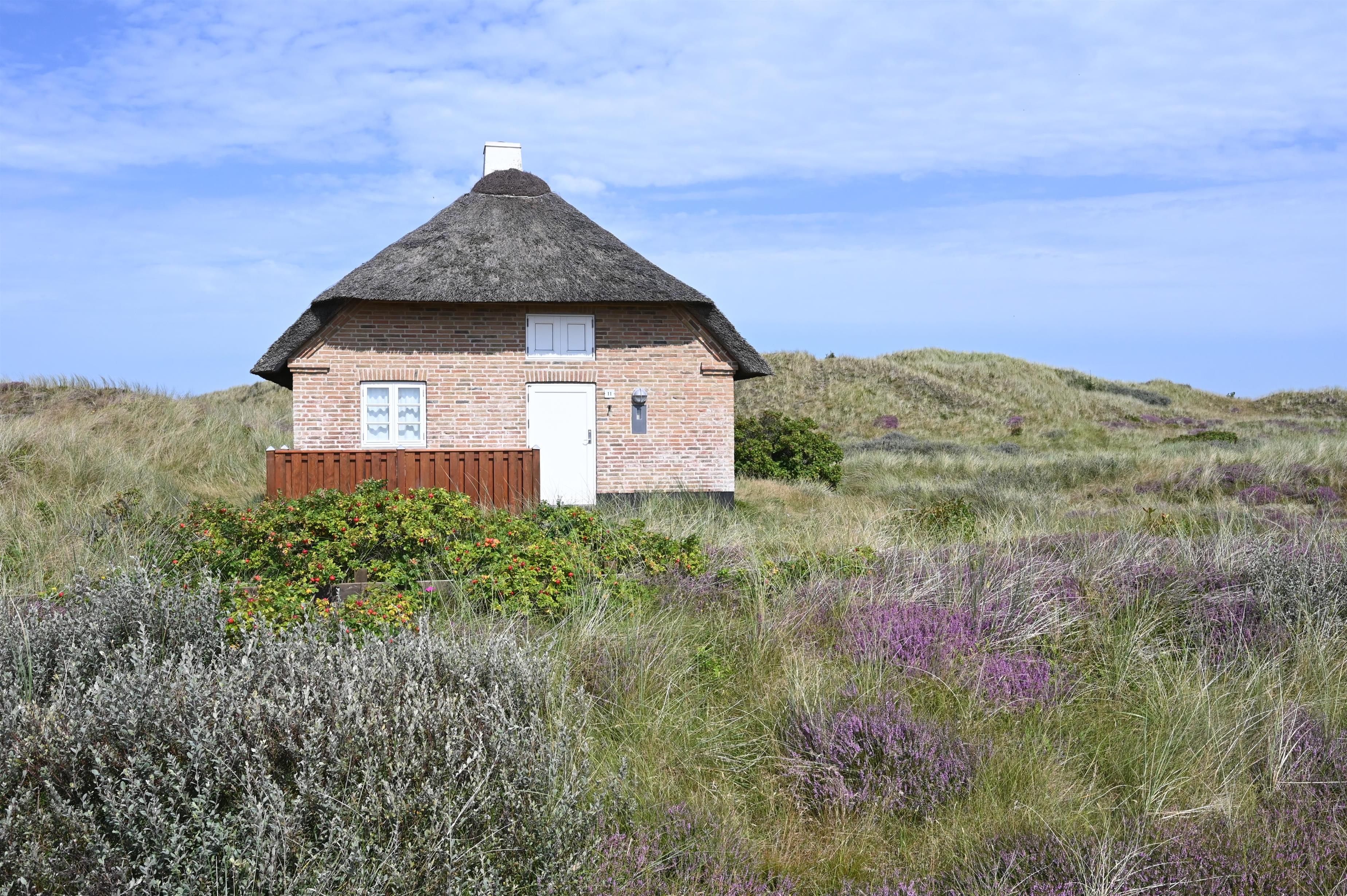 Huset, der er bygget i røde mursten og med et smukt stråtag, minder om de traditionelle vestkystklitgårde og tilføjer en autentisk charme til området. De synlige bjælker og murstensgulve giver huset en rustik og hyggelig atmosfære, som skaber en helt særlig stemning. Brændeovnen i stuen skaber varme og hygge på de køligere dage, hvilket gør huset til et behageligt sted året rundt.