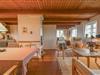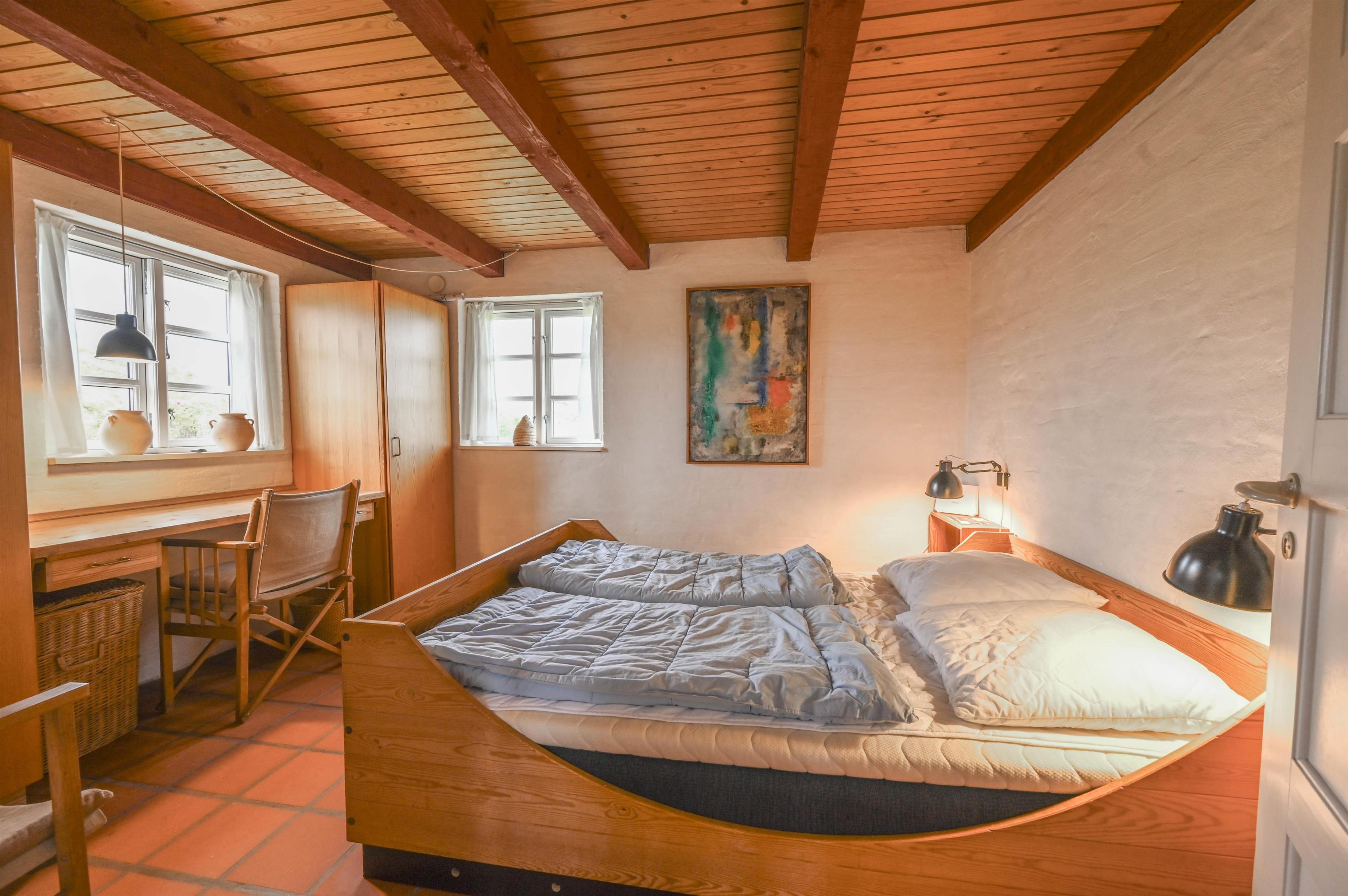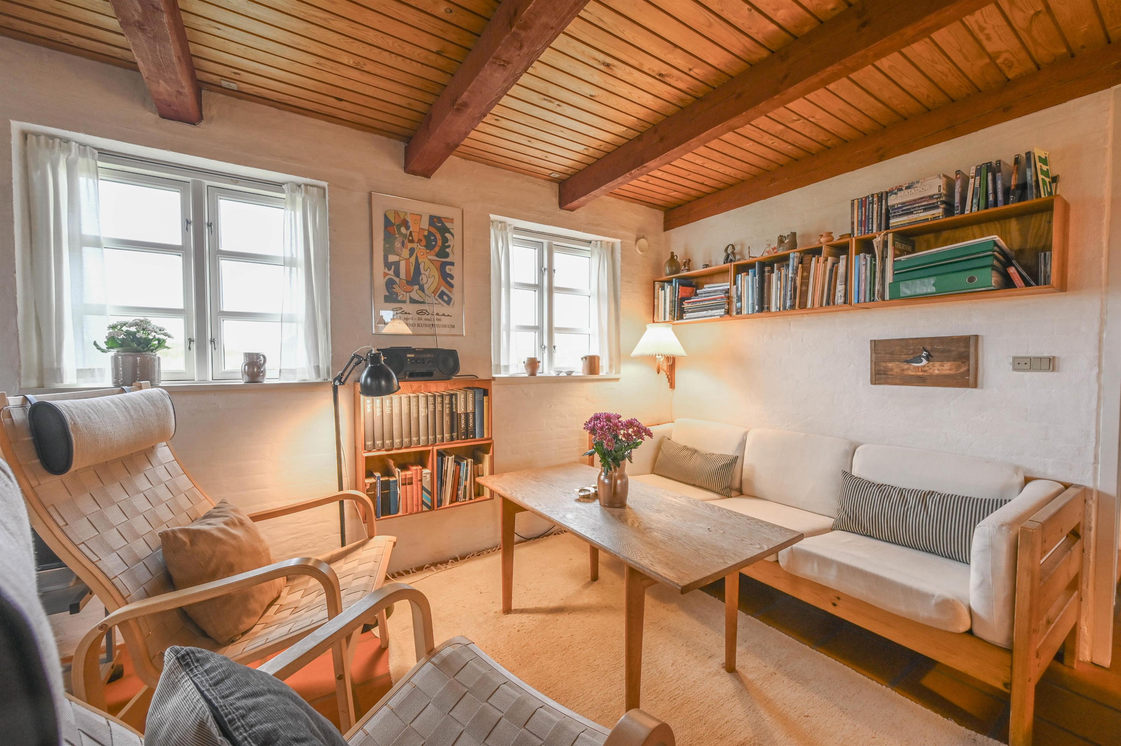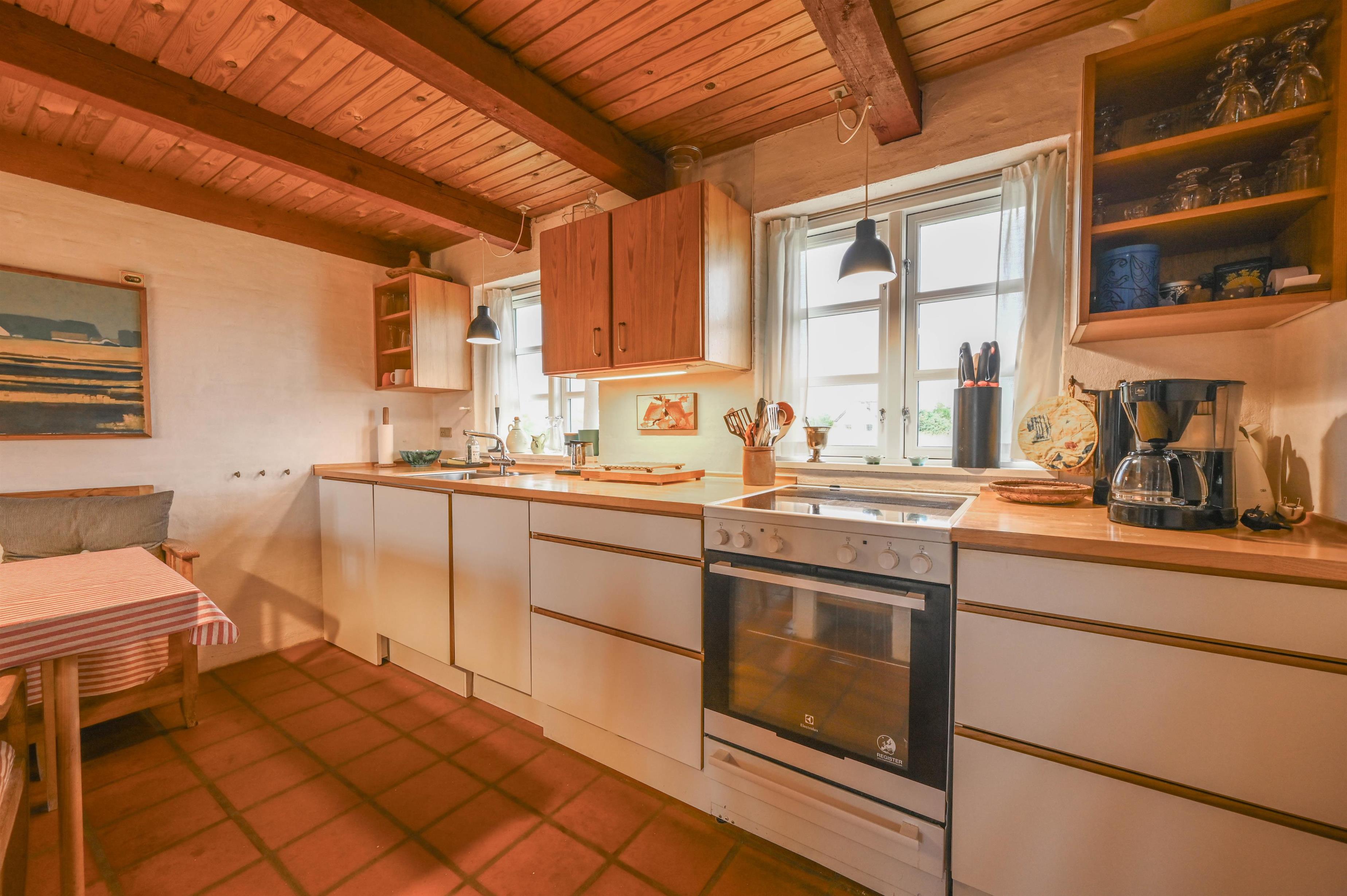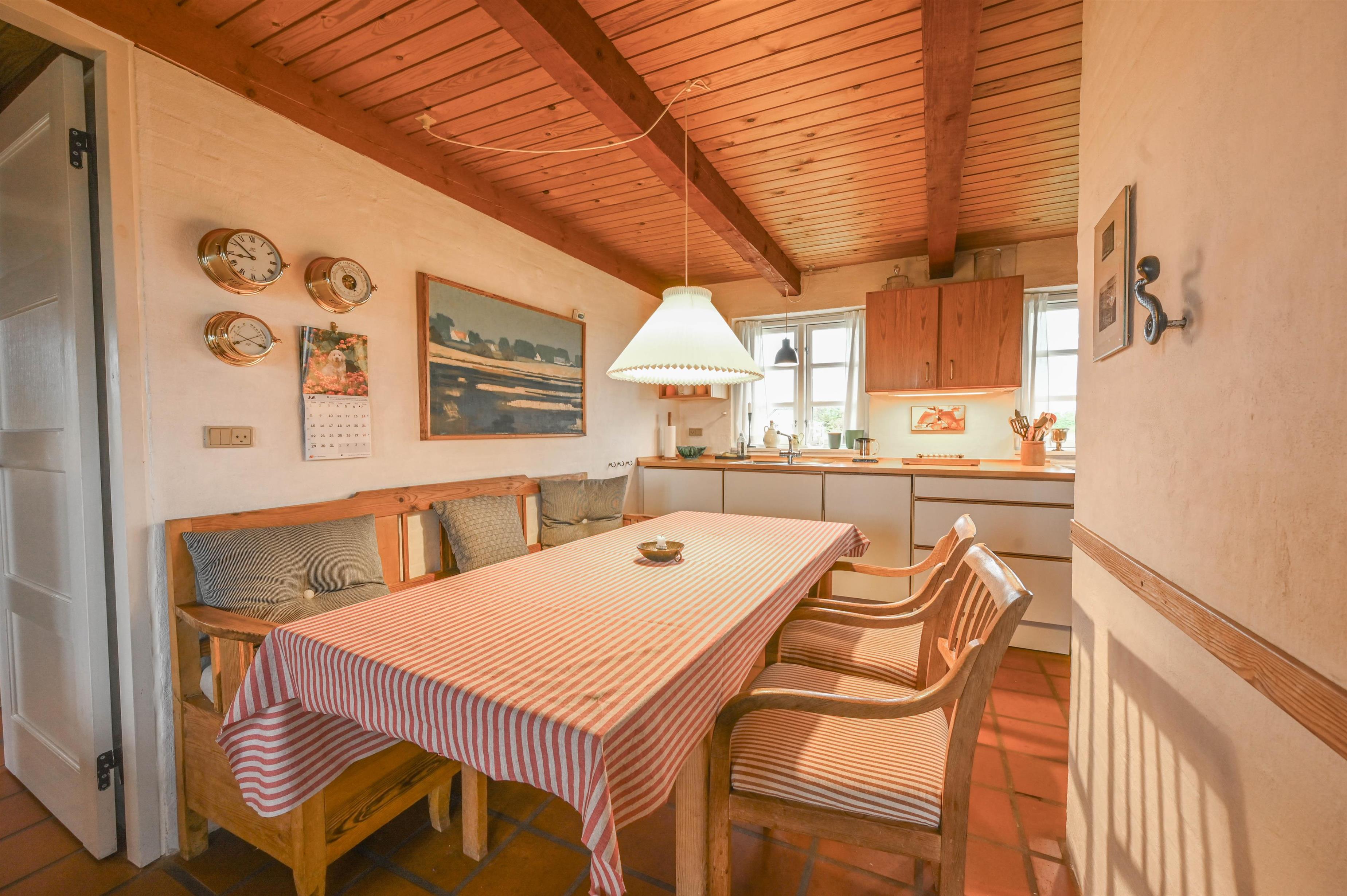 Huset, der er bygget i røde mursten og med et smukt stråtag, minder om de traditionelle vestkystklitgårde og tilføjer en autentisk charme til området. De synlige bjælker og murstensgulve giver huset en rustik og hyggelig atmosfære, som skaber en helt særlig stemning. Brændeovnen i stuen skaber varme og hygge på de køligere dage, hvilket gør huset til et behageligt sted året rundt.