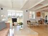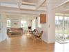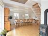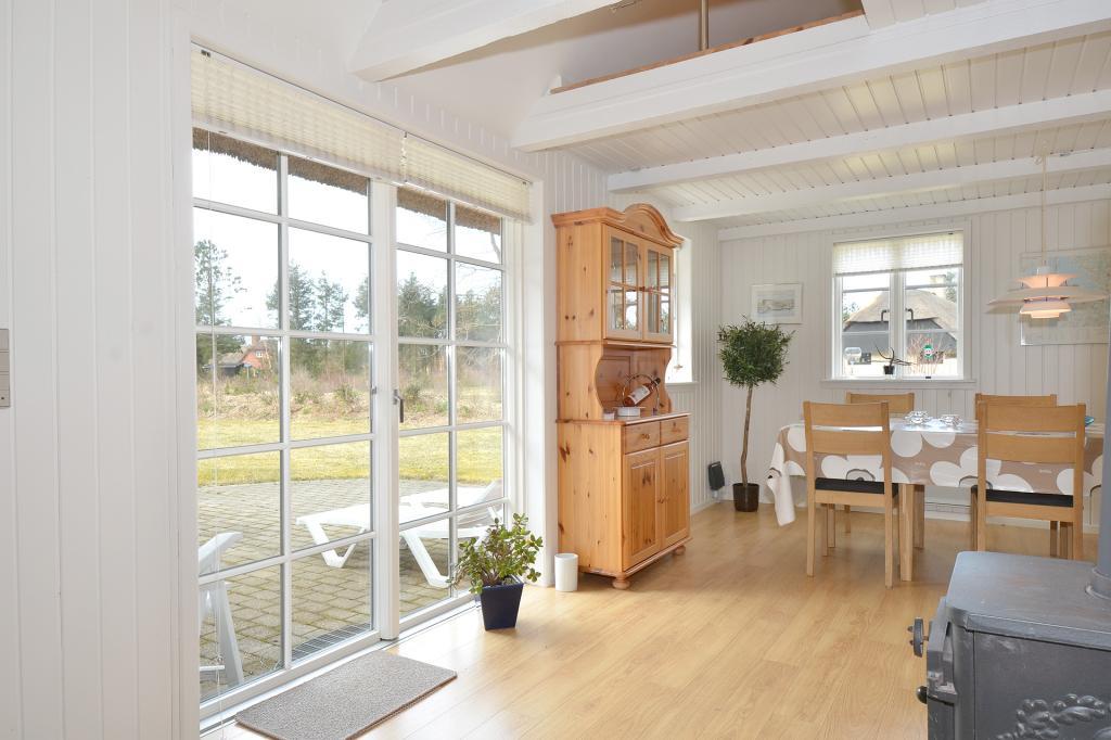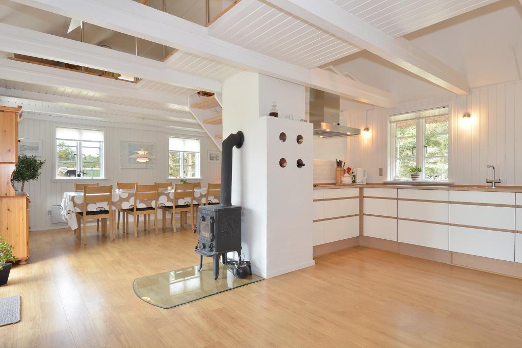 Den rummelige stue byder på komfortable møbler, et flot stort spisebord og en centralt placeret brændeovn, der skaber hygge på kølige aftener. Herfra er der direkte udgang til terrassen, hvor man kan nyde solen eller en stille aften i læ.