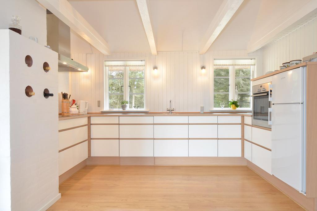 Køkkenet ligger i åben forbindelse med stuen – lyst, moderne og godt udstyret, så madlavningen bliver en del af samværet.