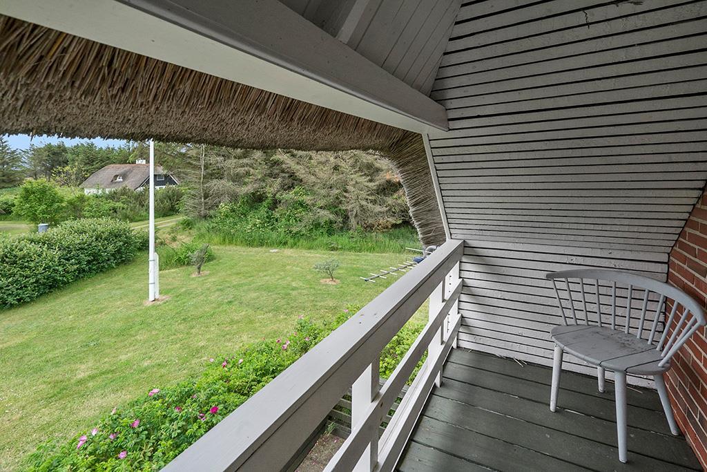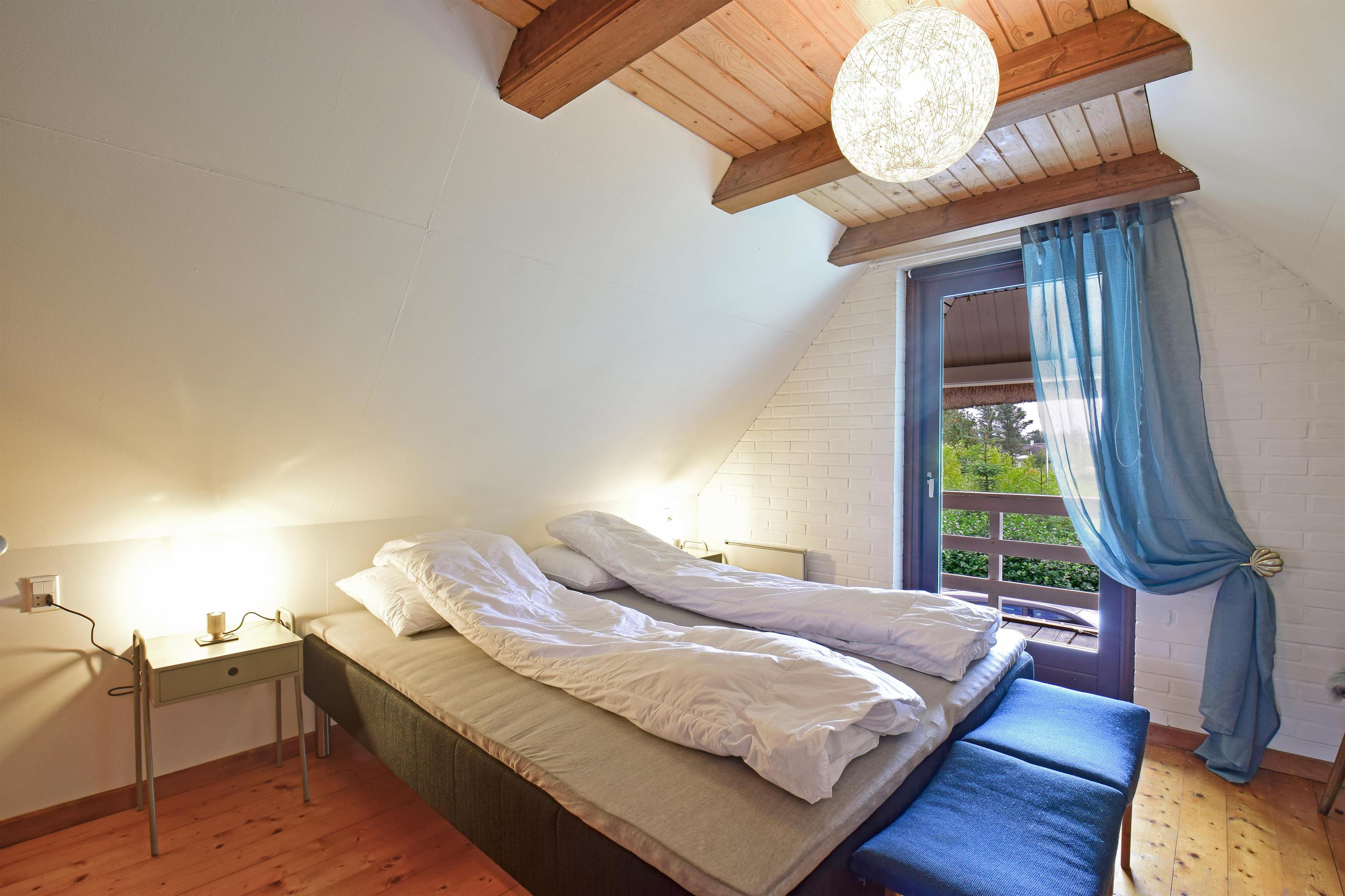 Dobbeltværelse med plankegulv og udgang til lille altan med kig mod klitterne og engene