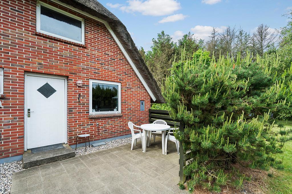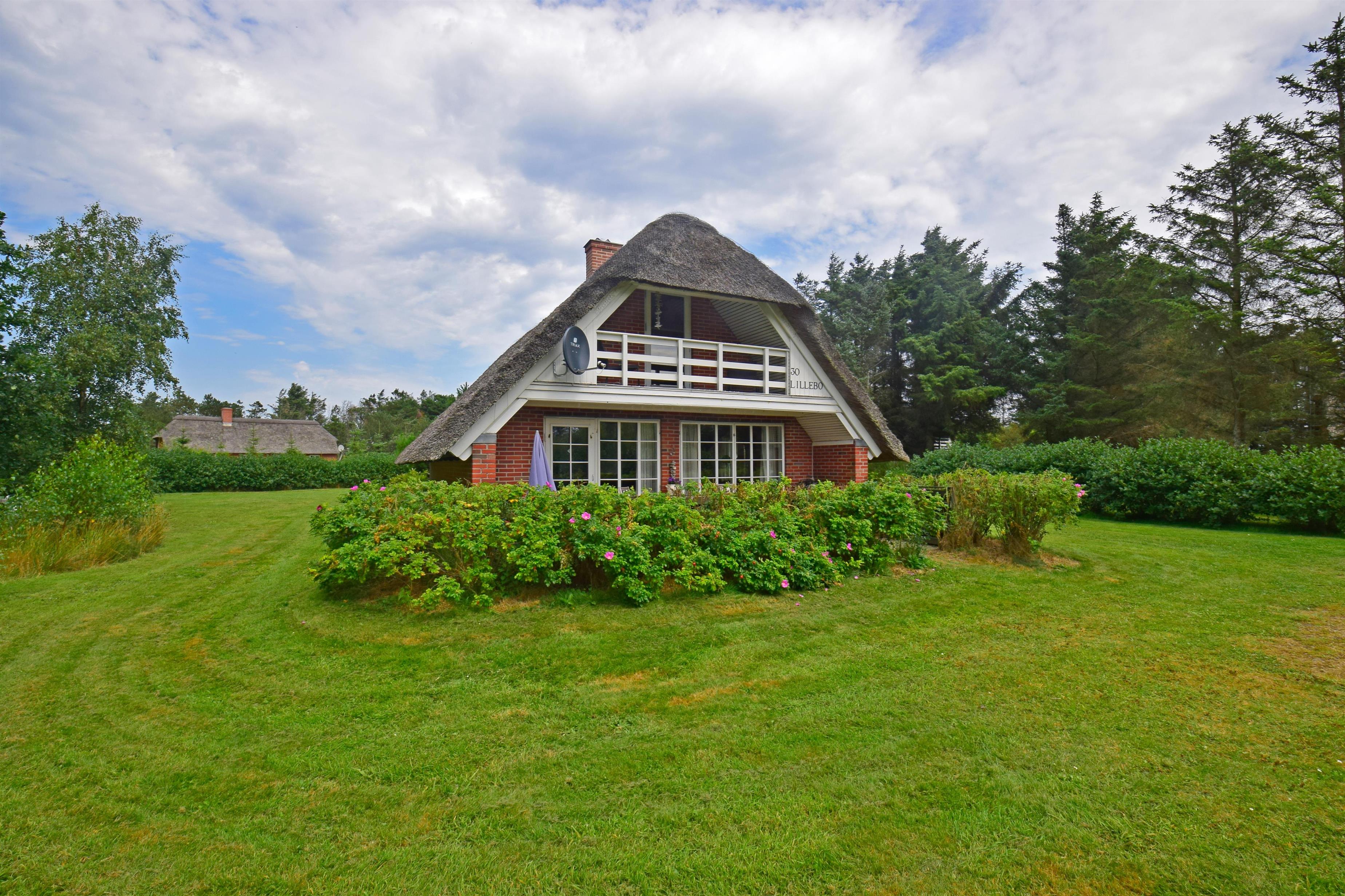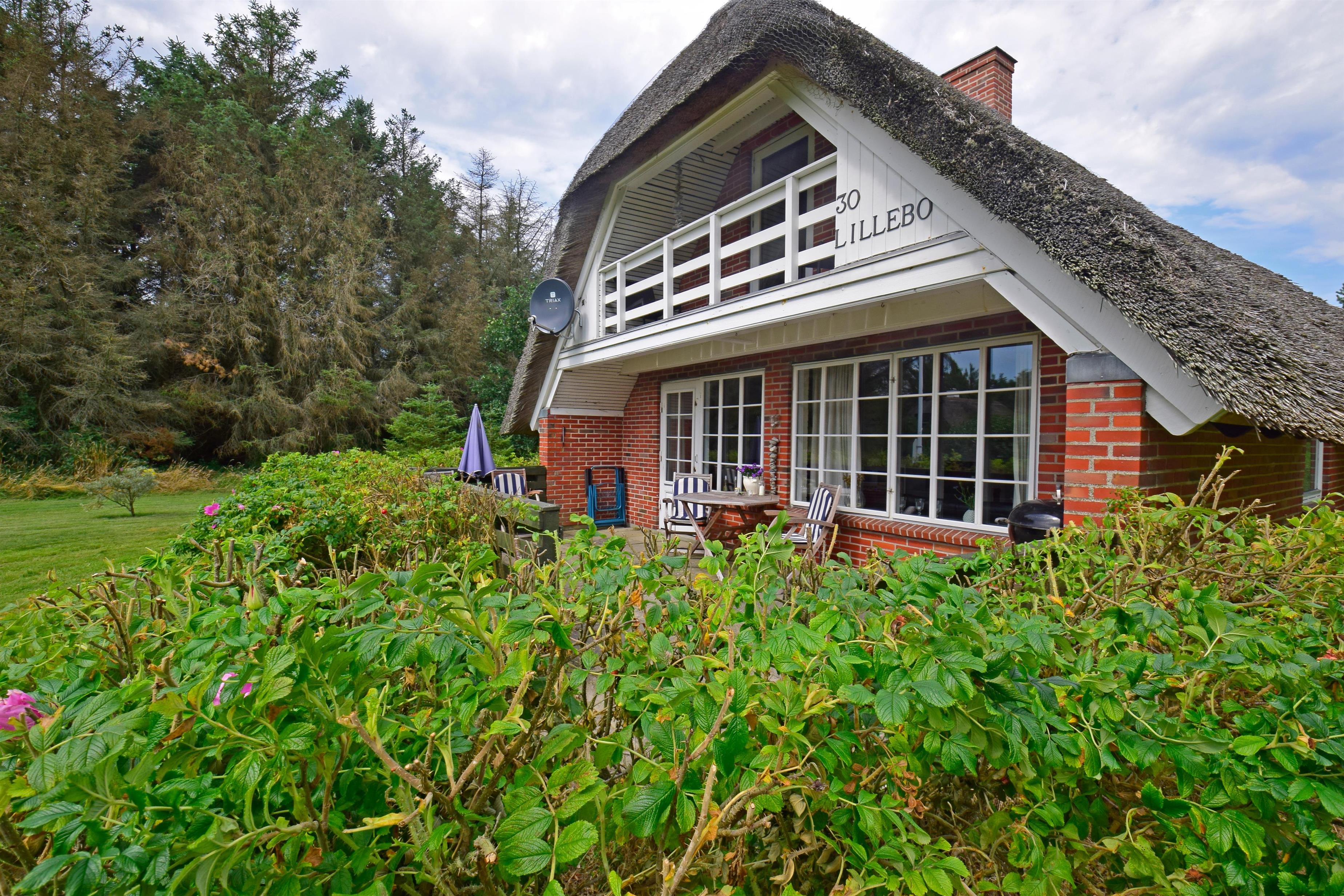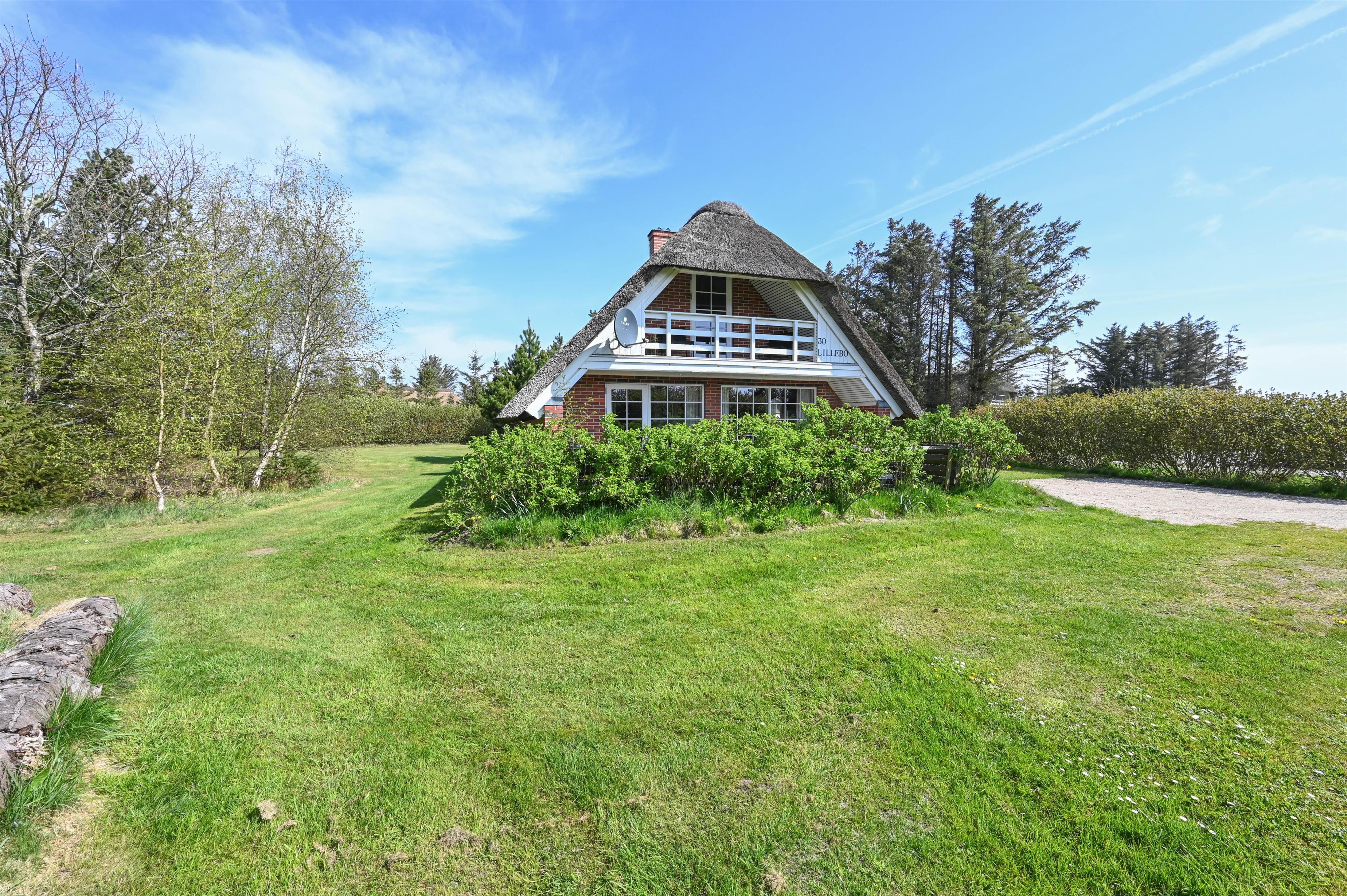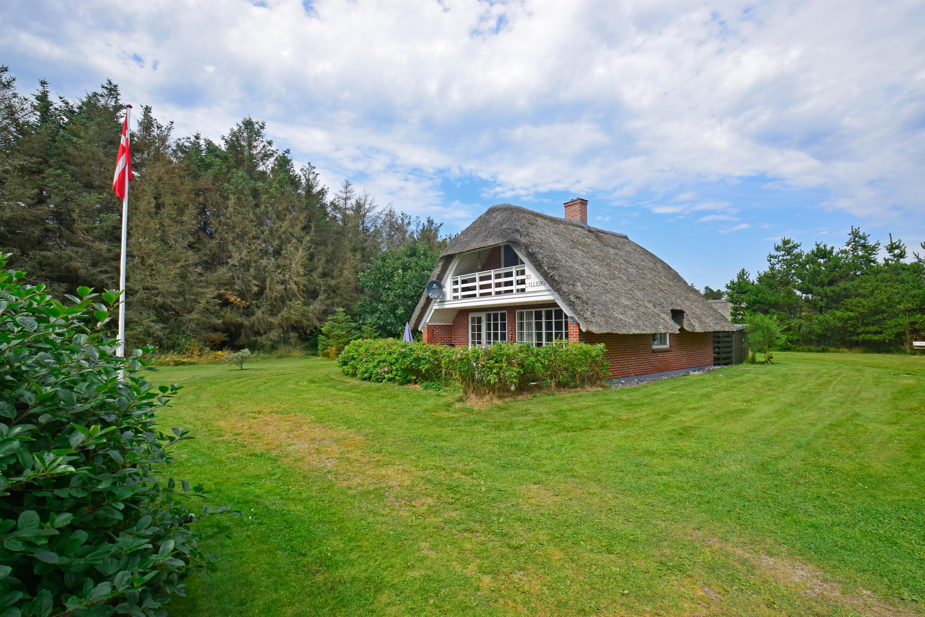 Dette charmerende feriehus ligger på en dejlig grund, delvist omkranset af træer, som giver læ for vestenvinden og en følelse af privatliv midt i naturen.