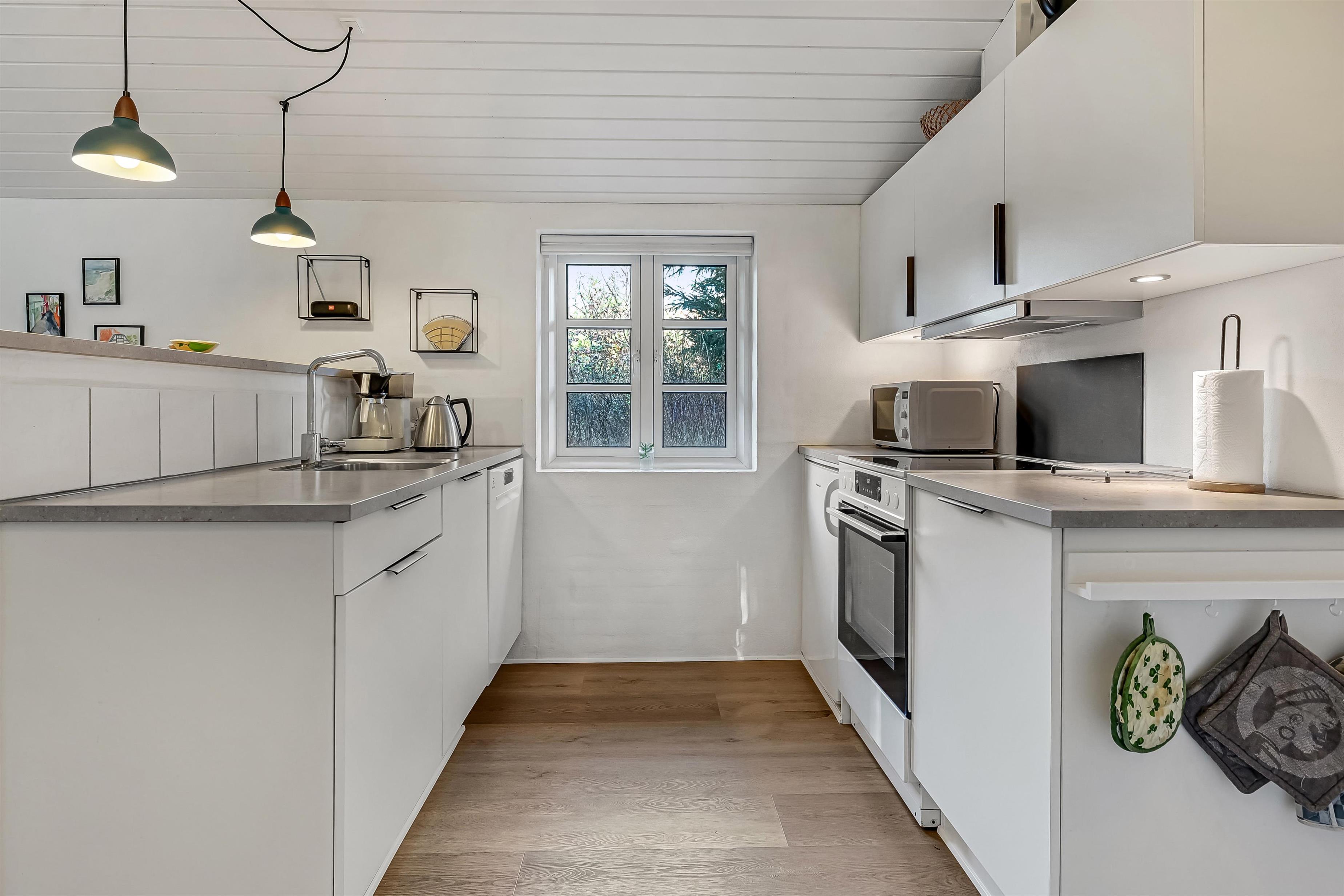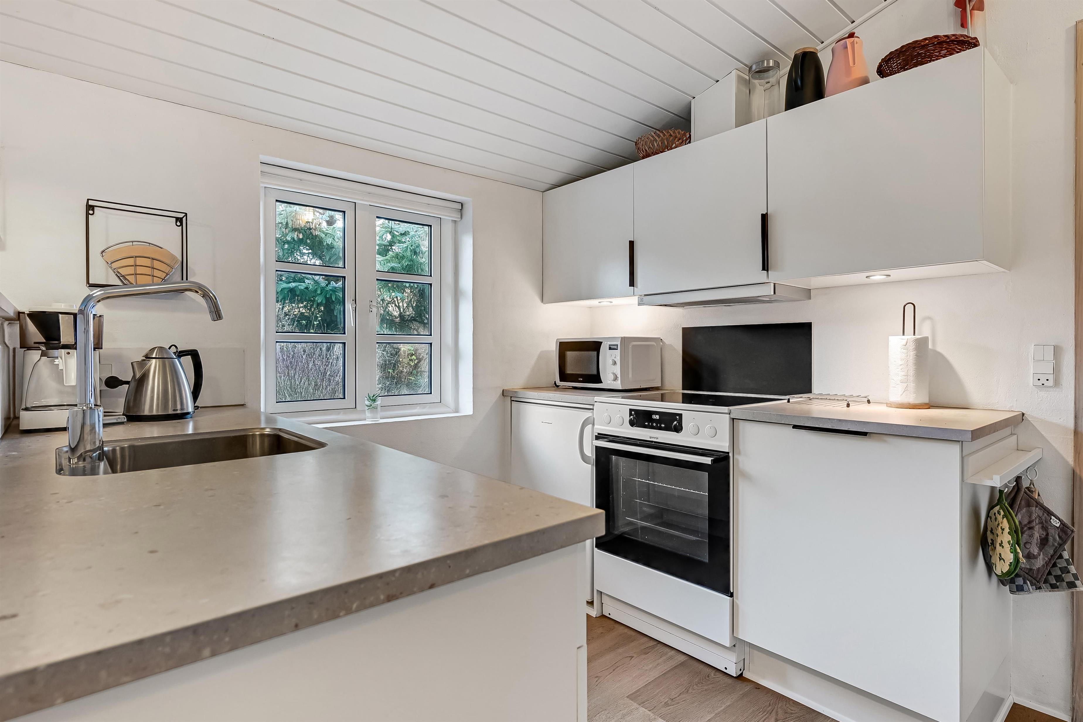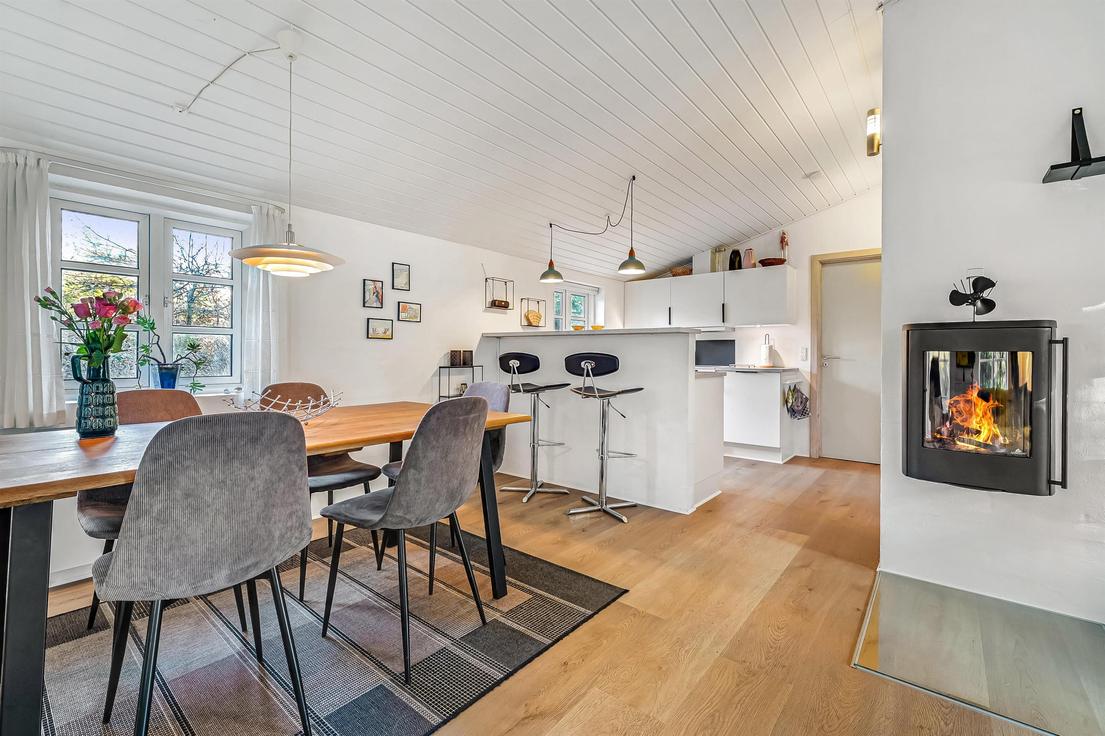 Indretning: Huset byder på en entre med garderobe, hvorfra der er adgang til sauna og et badeværelse med brusekabine, spa og vaskemaskine. Fra entreen er der også adgang til et soveværelse med dobbeltseng og et værelse med 2 enkeltsenge. Fra køkkenet er der adgang til husets sidste værelse med et lille slå-ud-bord og en daybed, der let kan forvandles til en komfortabel enkeltseng. Alle værelser er udstyret med nye senge og har god skabsplads. Husets køkken og stue er i ét og er lyst og hyggeligt indrettet. Stuen har stofmøbler og en væghængt brændeovn, der spreder ekstra hygge og varme. Fra stuen er der direkte udgang til den syd- og vestvendte terrasse, hvor I kan nyde solen. Loftet er nymalet og giver rummet et frisk og lyst udtryk.