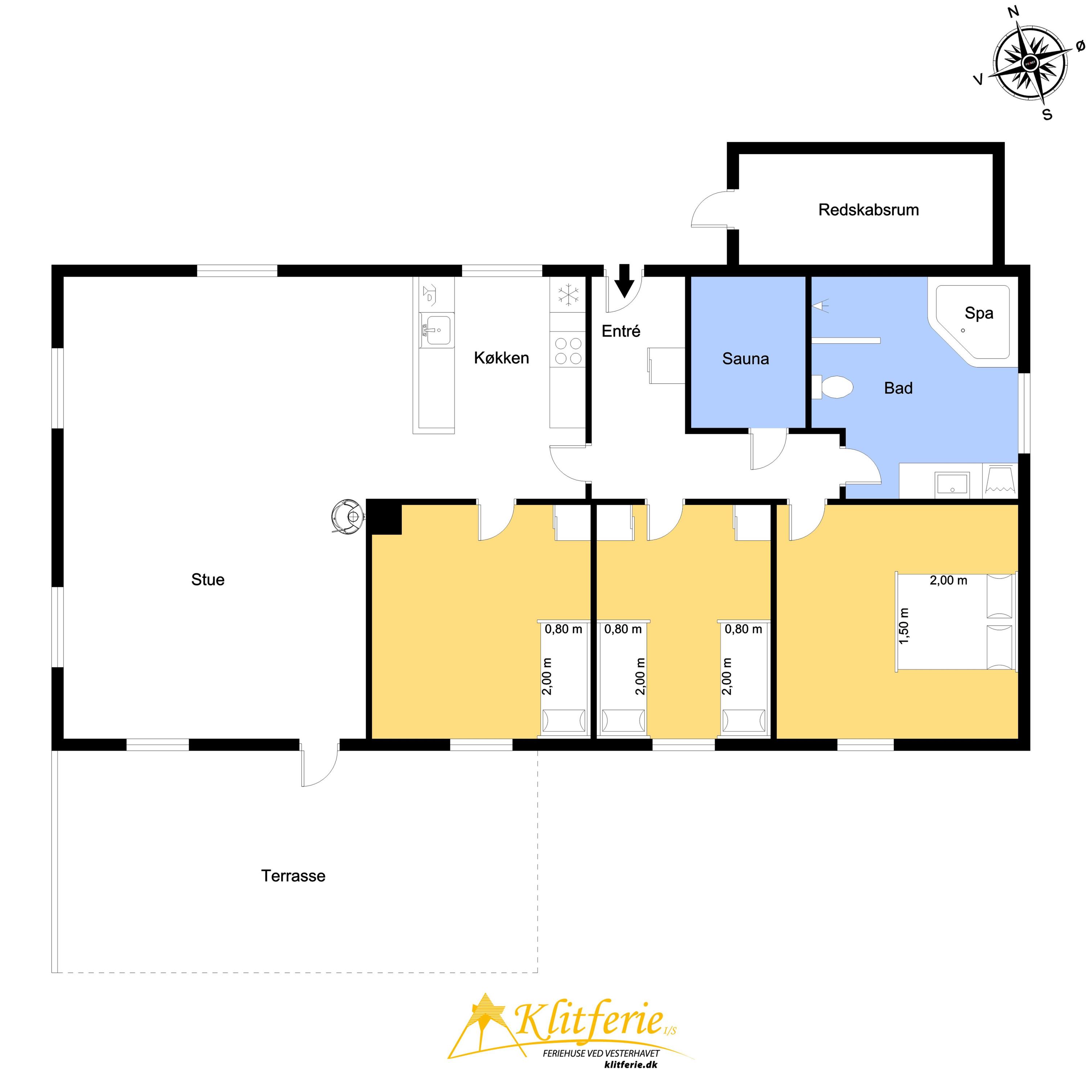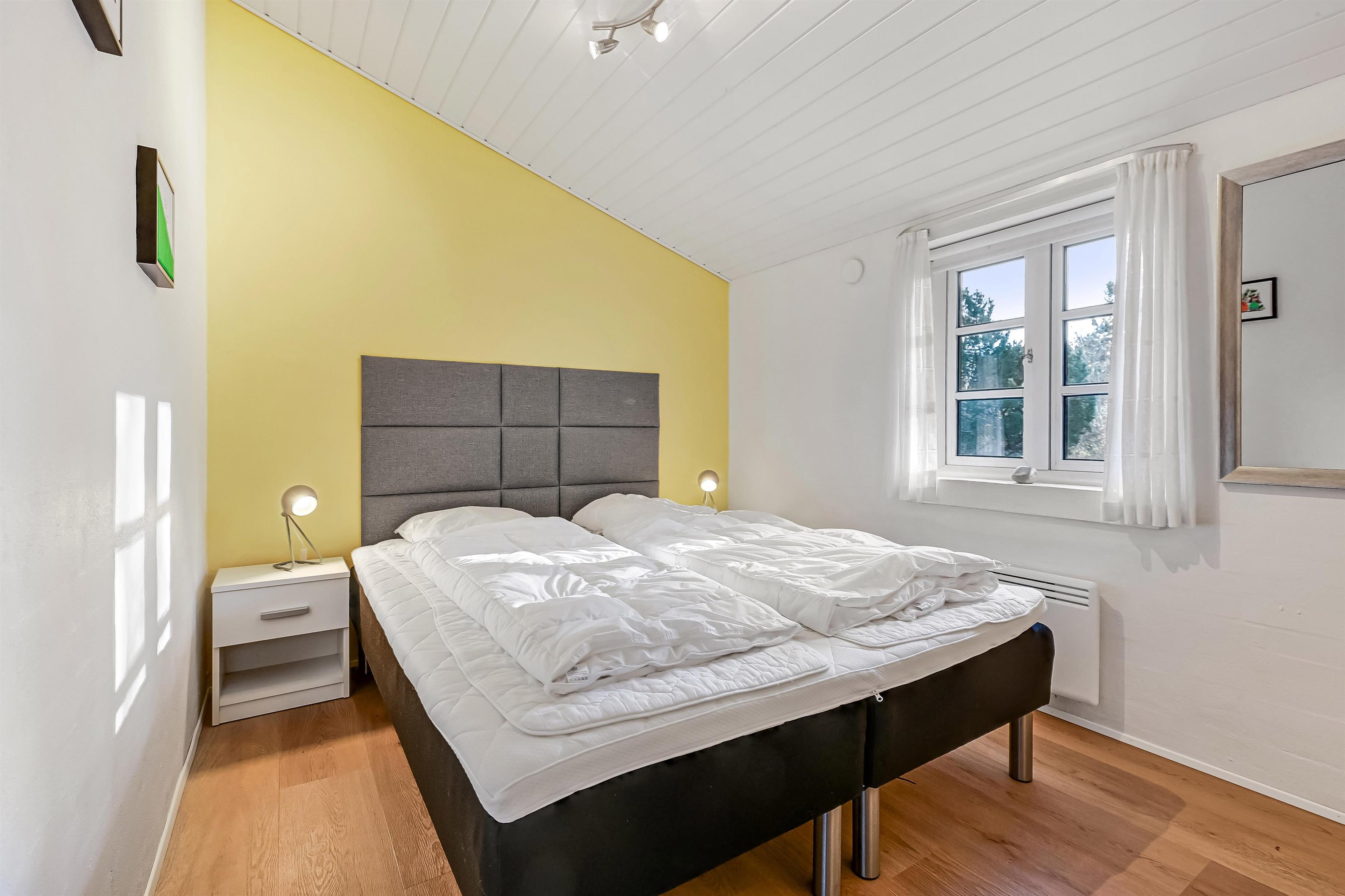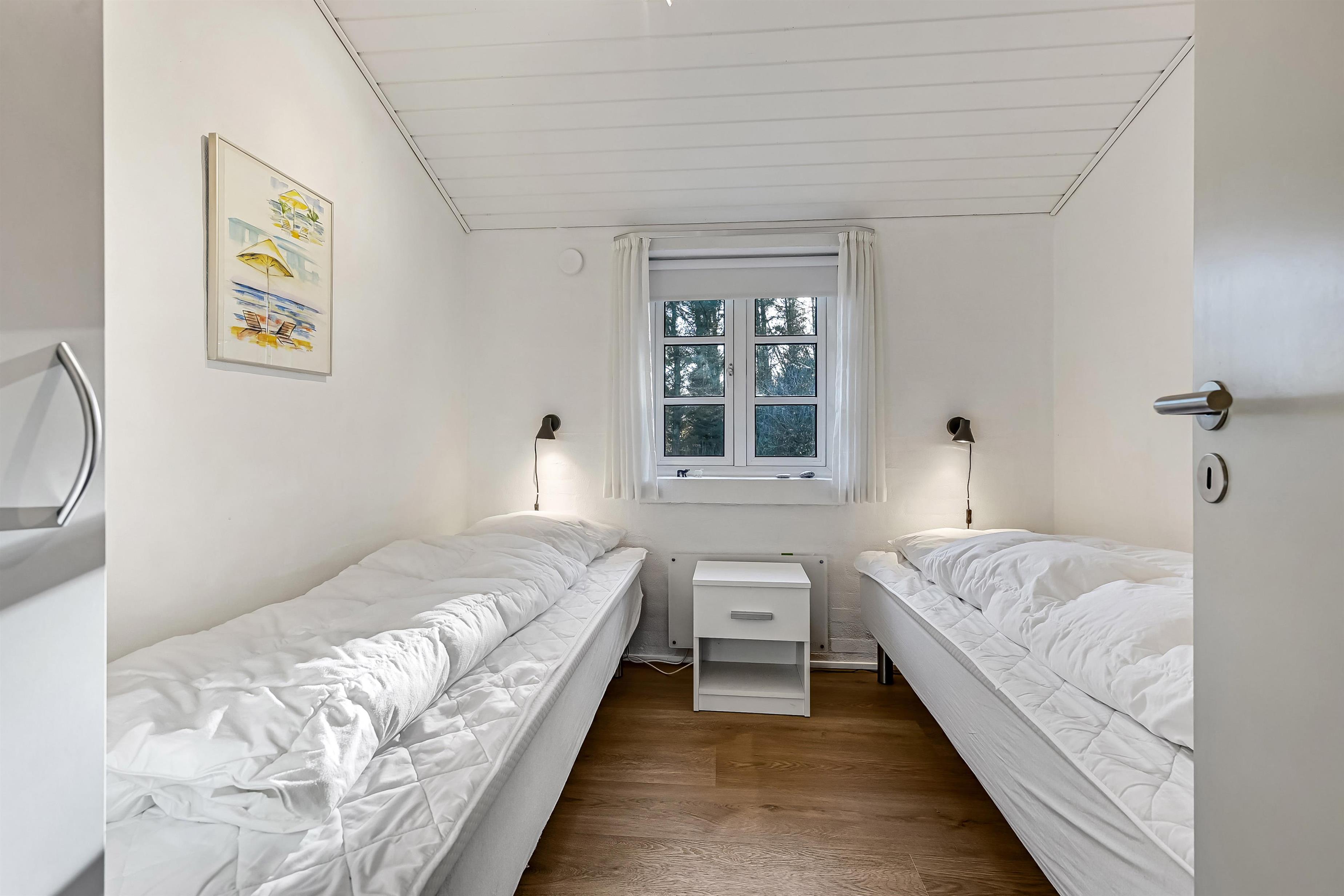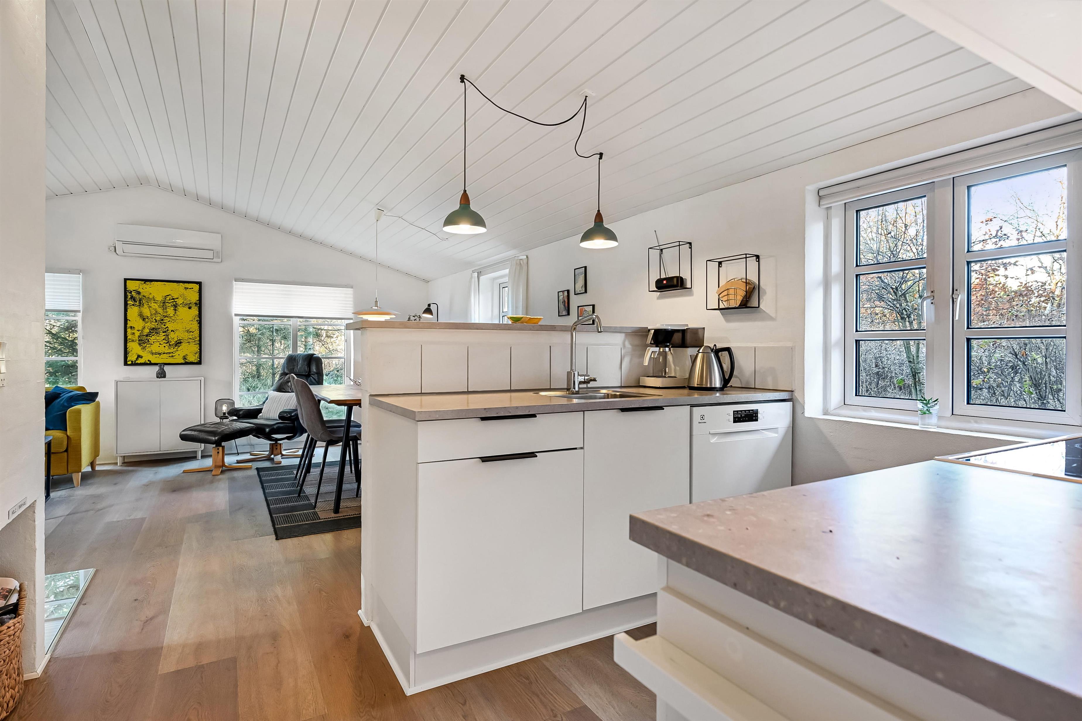 Indretning: Huset byder på en entre med garderobe, hvorfra der er adgang til sauna og et badeværelse med brusekabine, spa og vaskemaskine. Fra entreen er der også adgang til et soveværelse med dobbeltseng og et værelse med 2 enkeltsenge. Fra køkkenet er der adgang til husets sidste værelse med et lille slå-ud-bord og en daybed, der let kan forvandles til en komfortabel enkeltseng. Alle værelser er udstyret med nye senge og har god skabsplads. Husets køkken og stue er i ét og er lyst og hyggeligt indrettet. Stuen har stofmøbler og en væghængt brændeovn, der spreder ekstra hygge og varme. Fra stuen er der direkte udgang til den syd- og vestvendte terrasse, hvor I kan nyde solen. Loftet er nymalet og giver rummet et frisk og lyst udtryk.