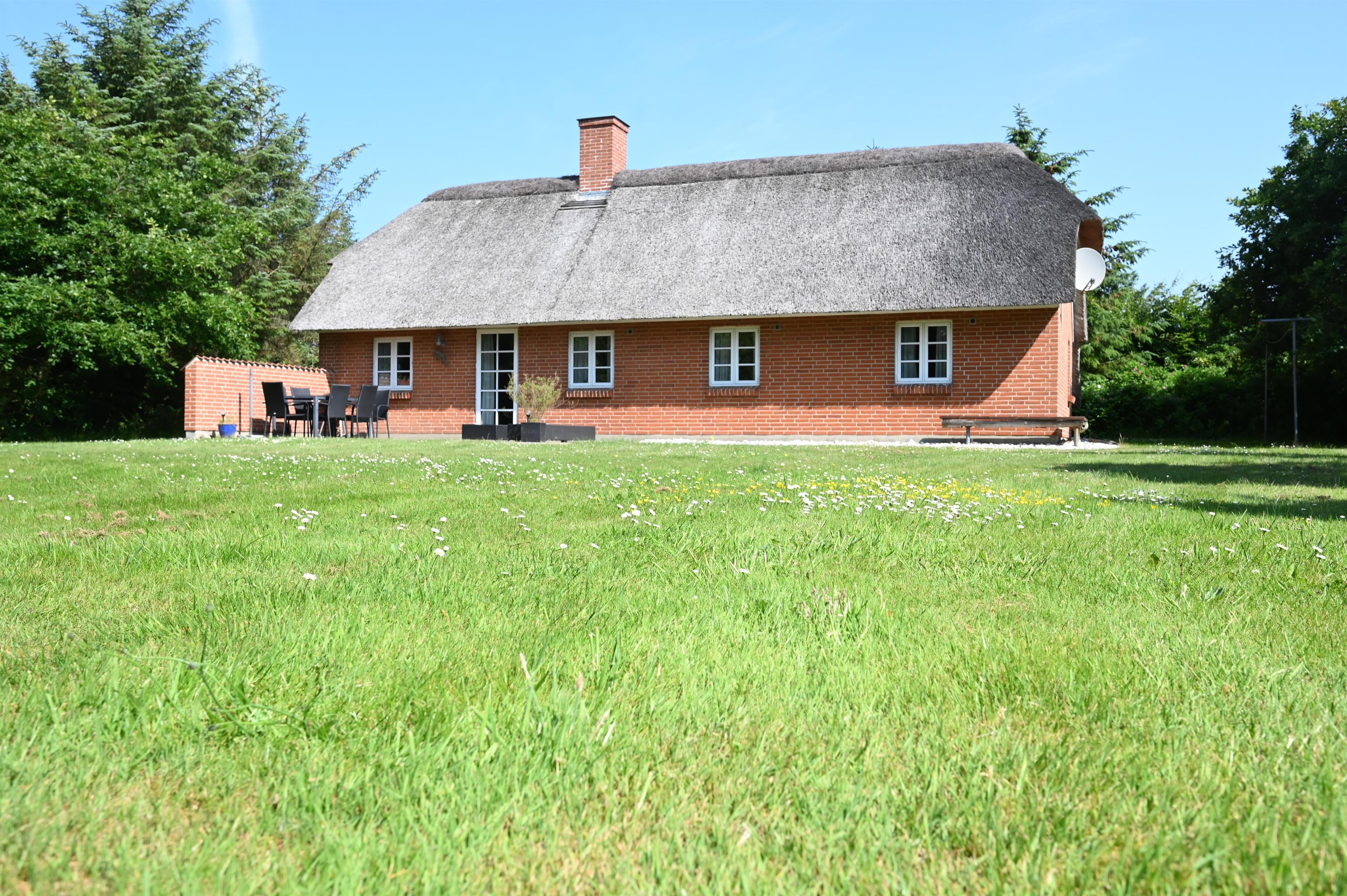 Frisk luft, fuglesang, Vesterhavets brusen og naturens dyr på tæt hold – alt dette kan I opleve ved dette dejlige stråtækte feriehus, der ligger tæt på Vesterhavet.