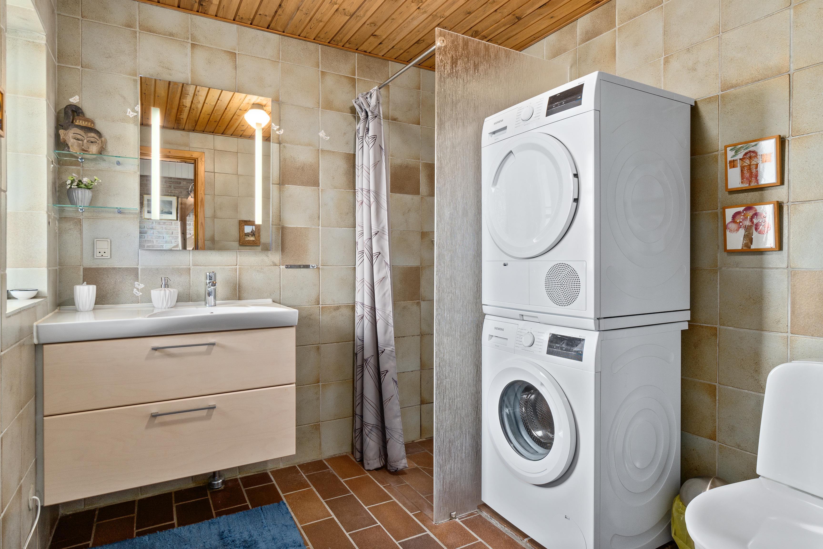 Dejligt badeværelse med bruseniche og vaskesøjle (vaskemaskine/tørretumbler)