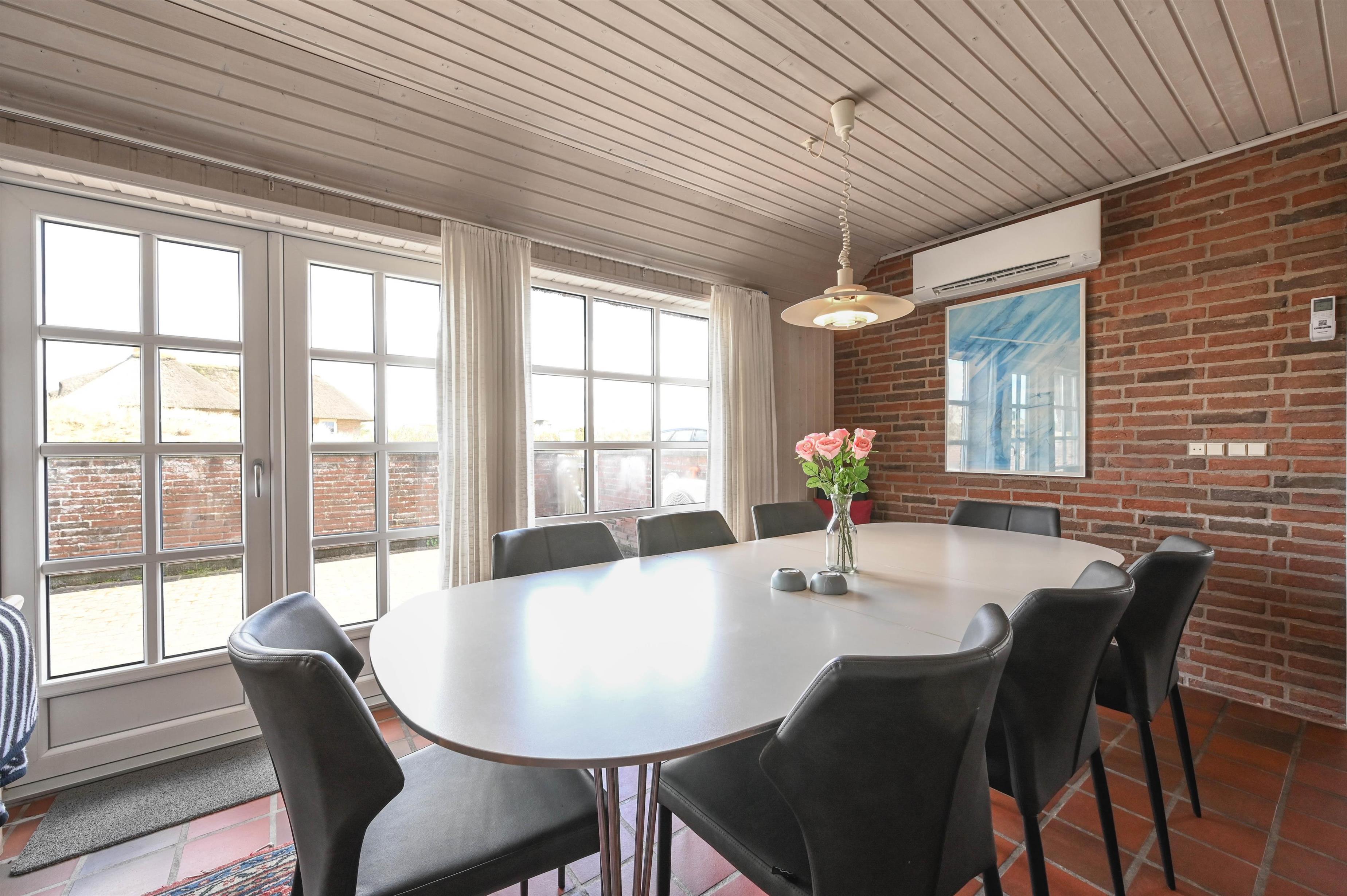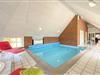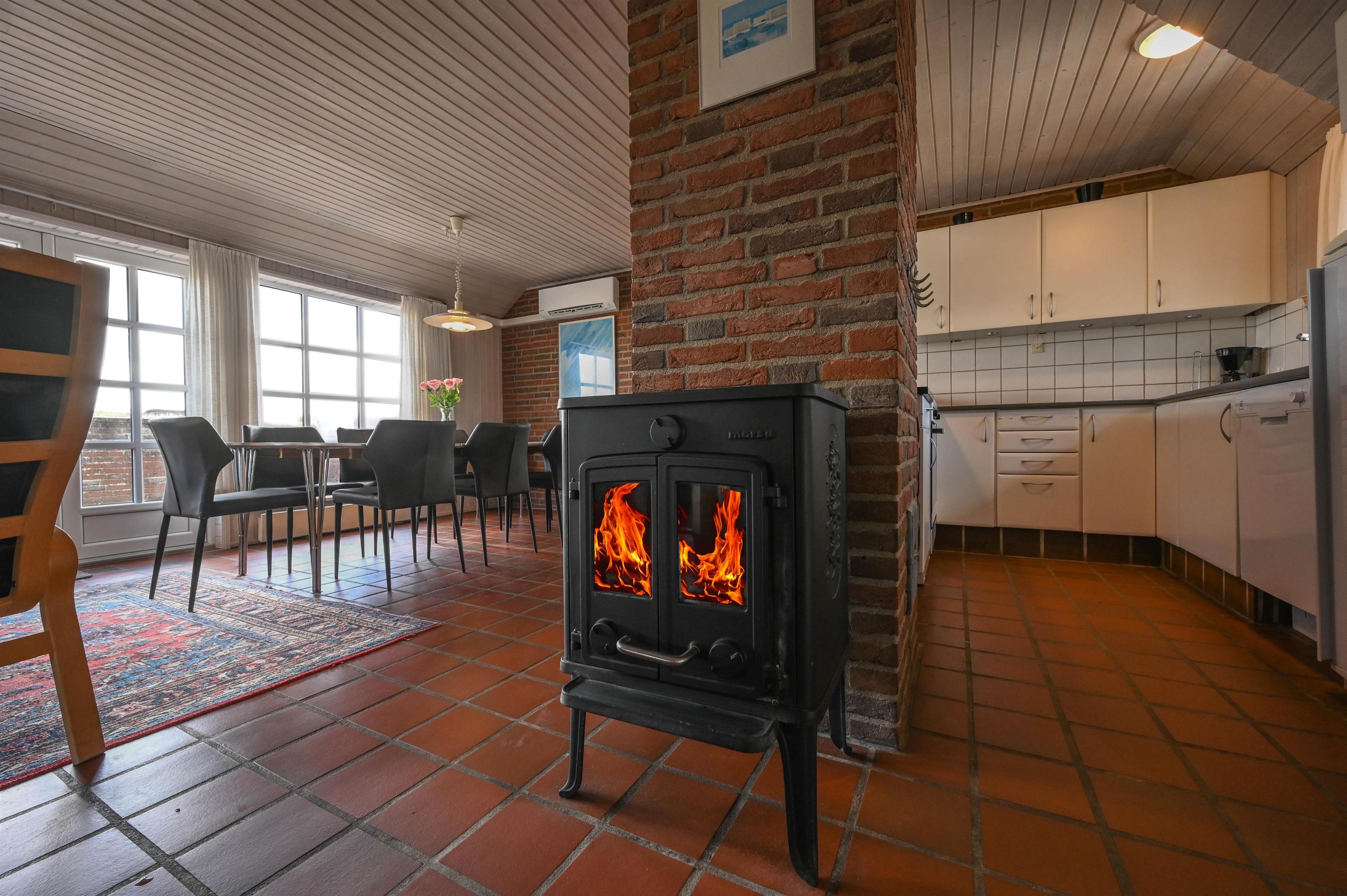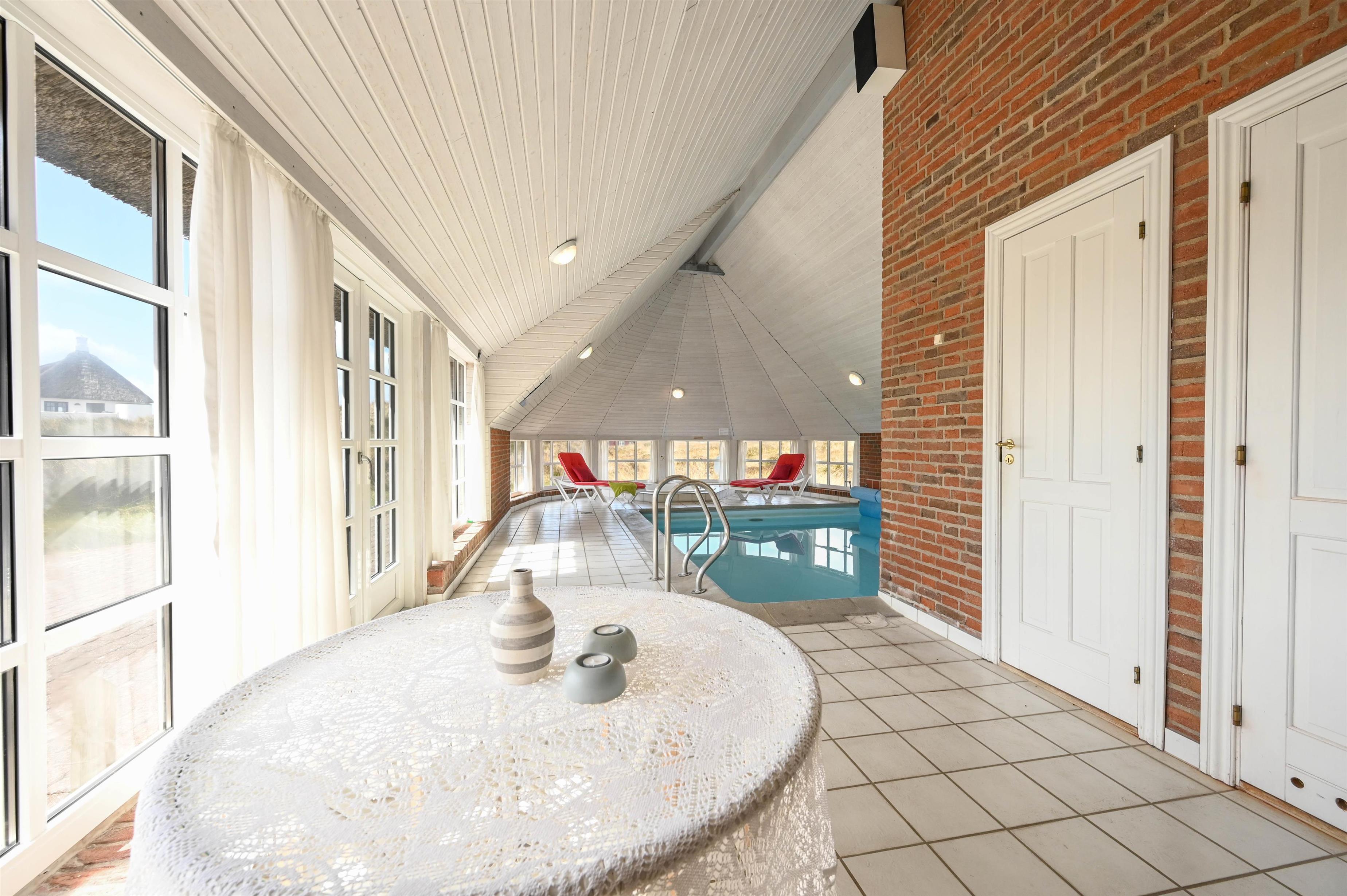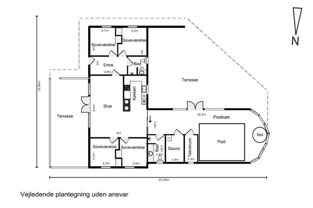 Indretning: Entre, badeværelse med bruseniche, 4 soveværelser med nyere senge og god skabsplads, rummeligt køkkenalrum med pæn ny køkkenafdeling, hvor der også er udsigt til klitterne, alrum med spiseplads, sofagruppe, brændeovn og udgang til syd- /østvendt lukket terrasse, perfekt som hundegård, hvis hunden skal med på ferie. Pool afdelingen indeholder udover swimmingpool, et stort spabad hvorfra der er udsigt til klitterne, sauna samt et ekstra badeværelse.